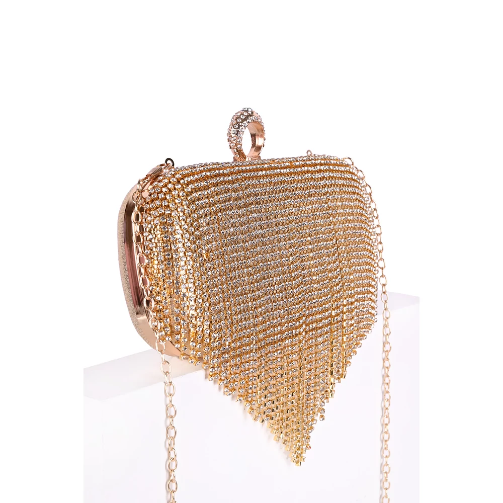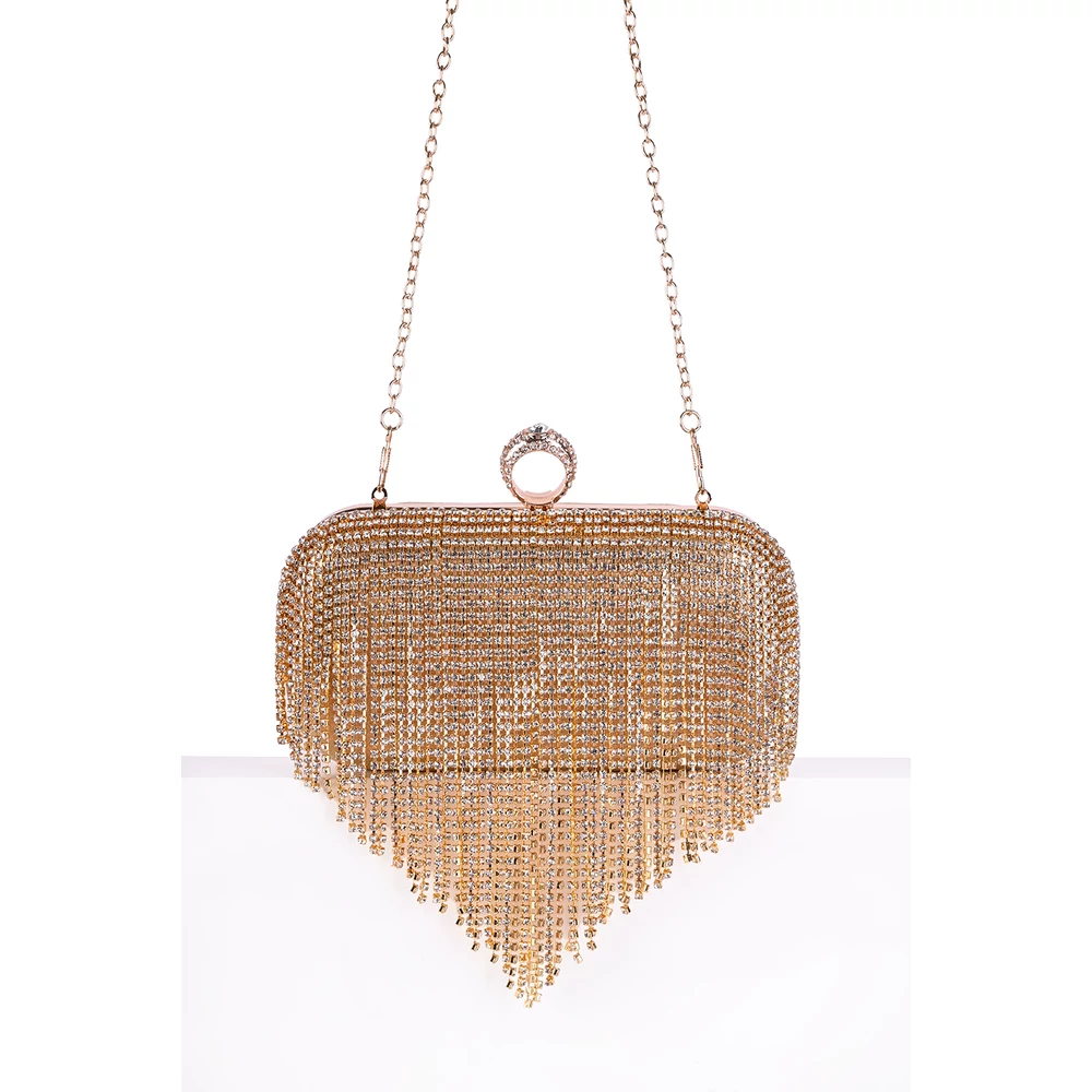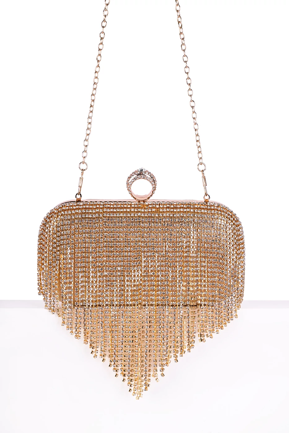Elegáns és trendi strasszköves party/alkalmi táska, amellyel nem csak kitűnsz a tömegből, de bele is pakolhatod a kisebb értékeidet, mint telefon, pénz és zsebkendő. Egyterű belsejét egy gyűrűnek kinéző patenttal lehet nyitni. A táskát a hozzá tartozó vékony lánccal vállon is viselheted, vagy akár a gyűrűt is felhúzhatod az ujjadra, és a táskát a markodban is kényelmesen hordozhatod.