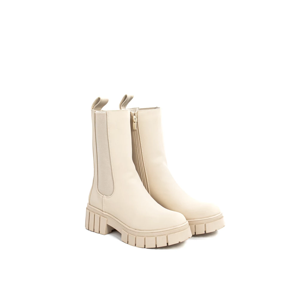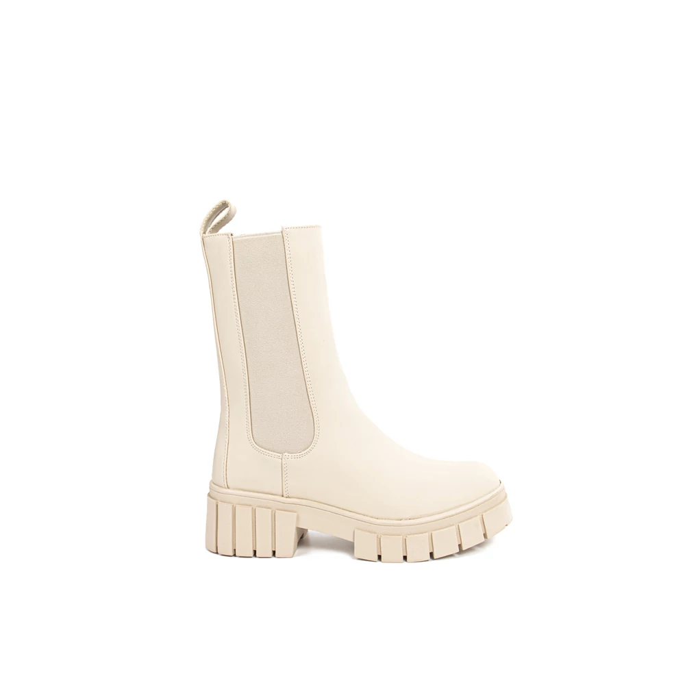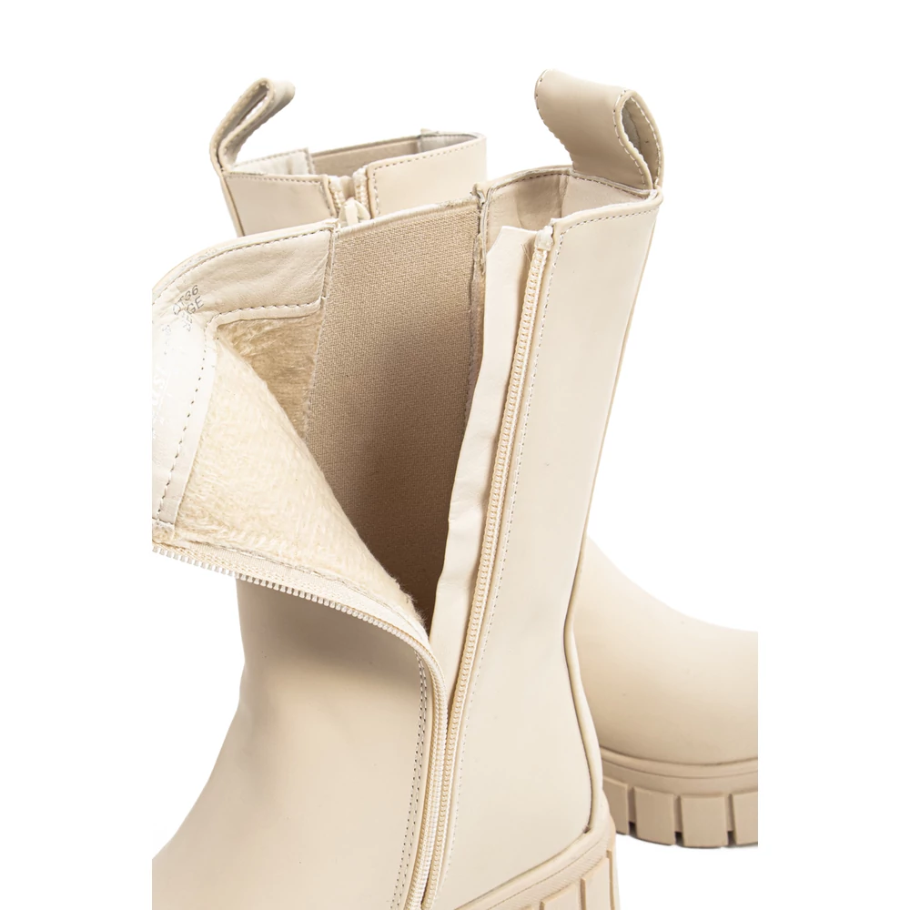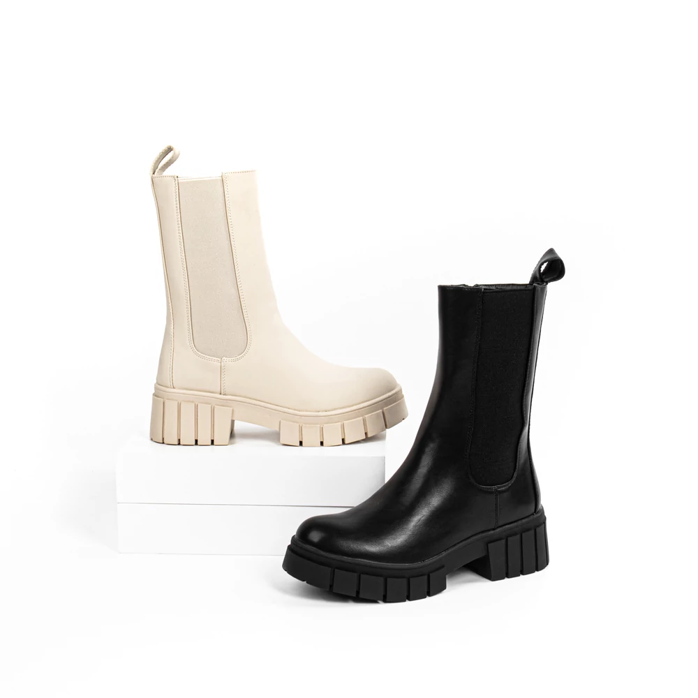 Extravagáns stílusú platformos műbőr bakancs, hosszított szárral.