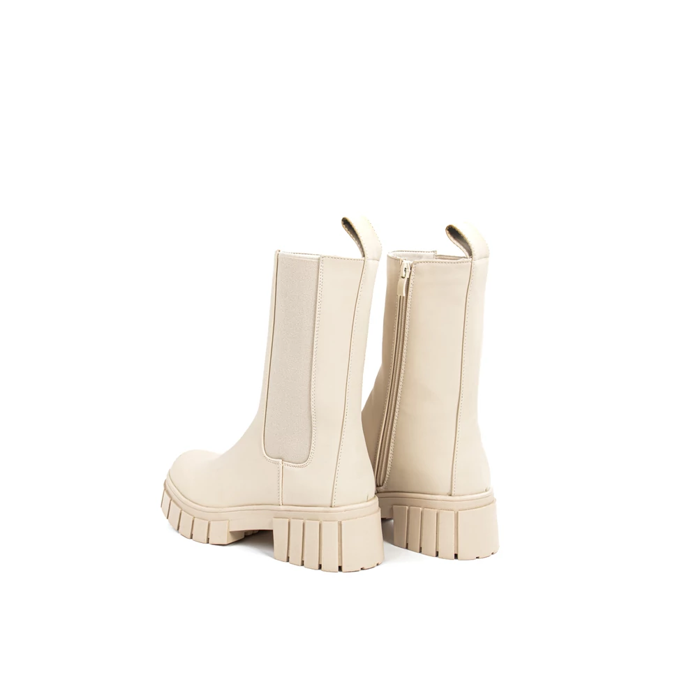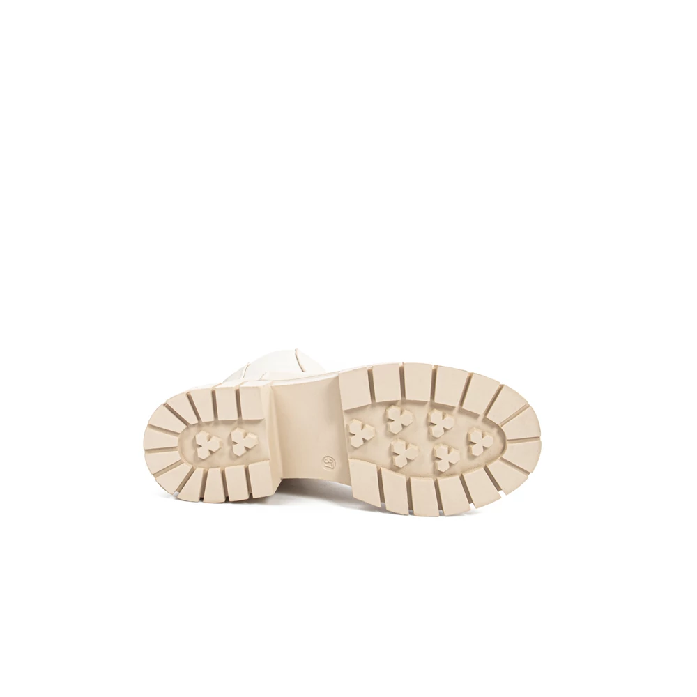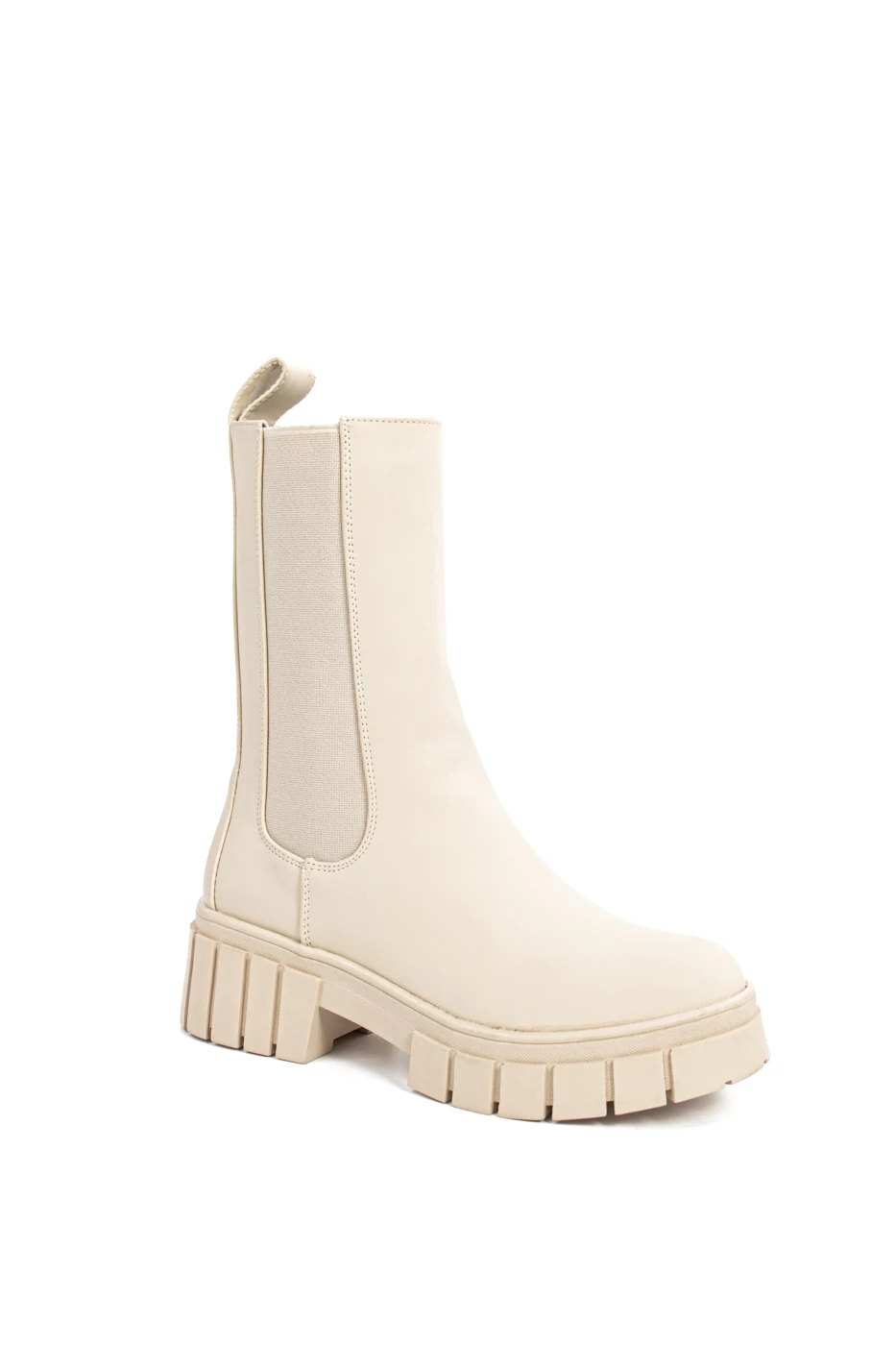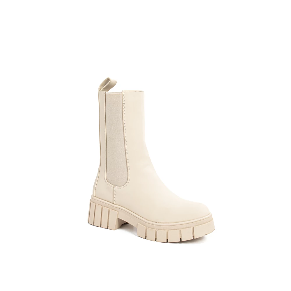Extravagáns stílusú platformos műbőr bakancs, hosszított szárral.