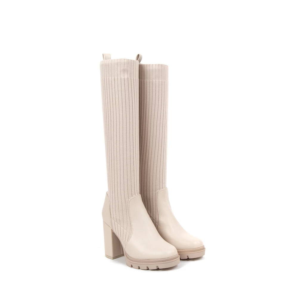 Nőies, kifinomult magasszárú csizma, félig lakkozott, félig textil anyagból készült.
