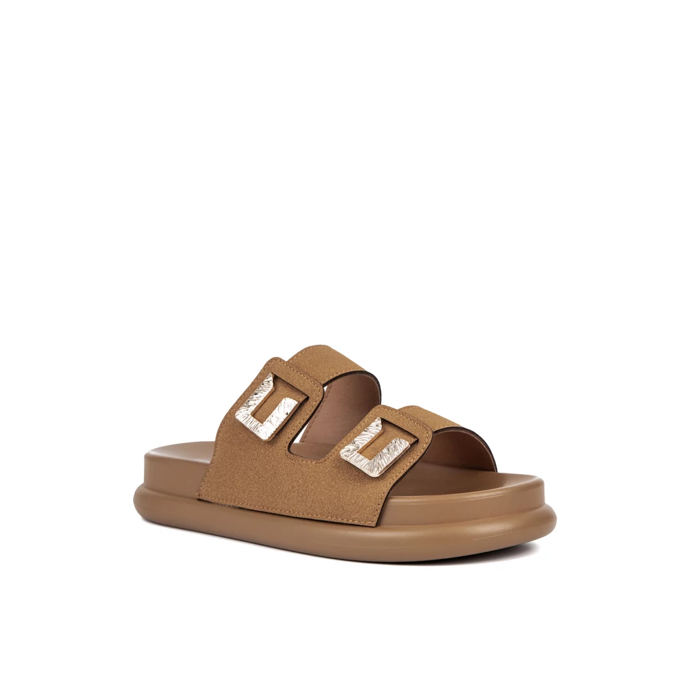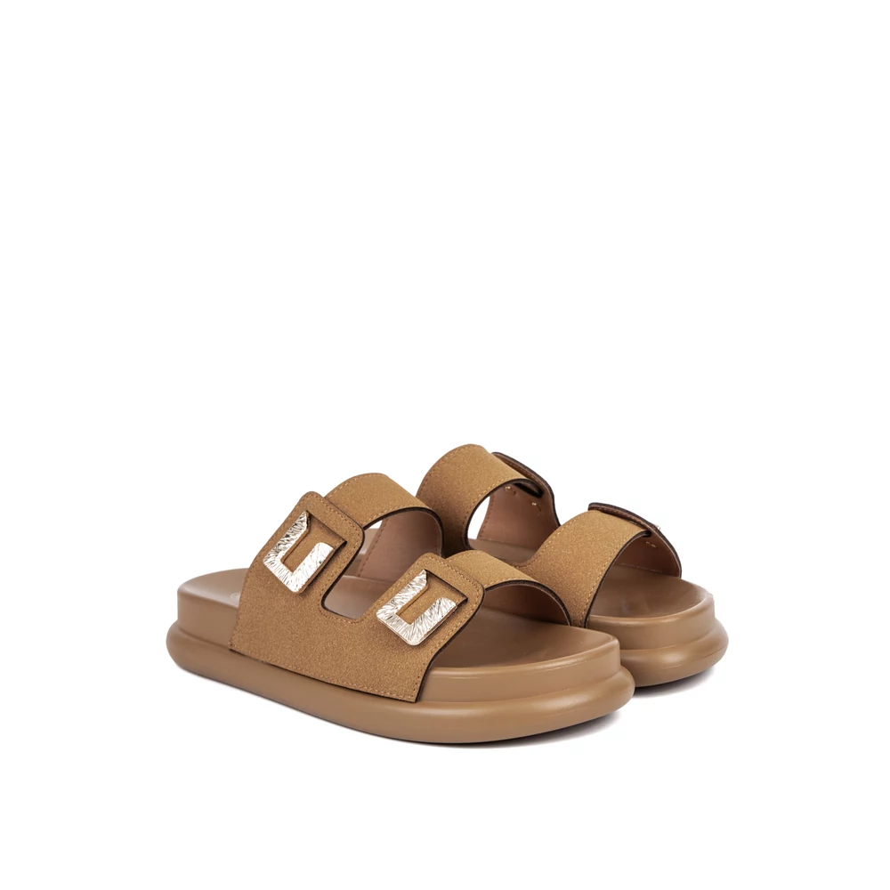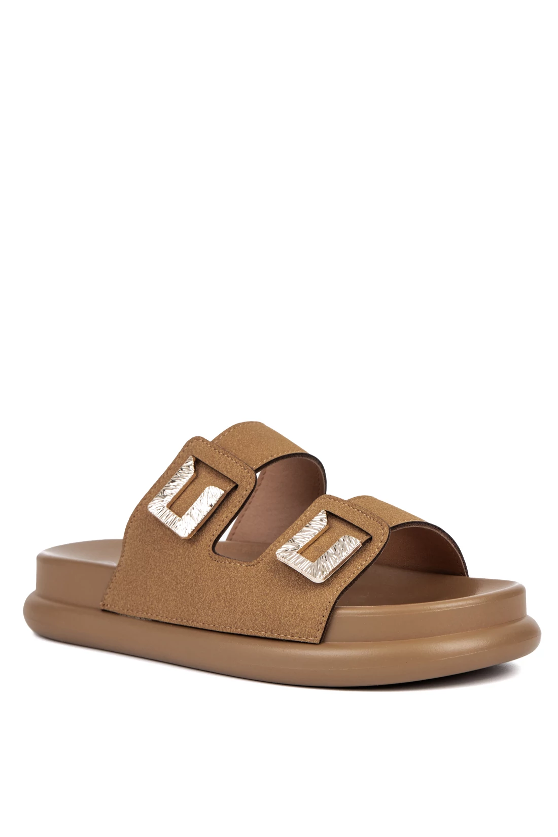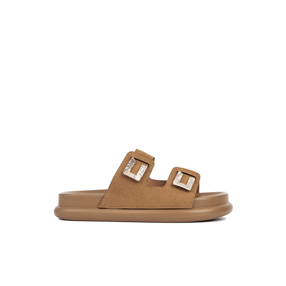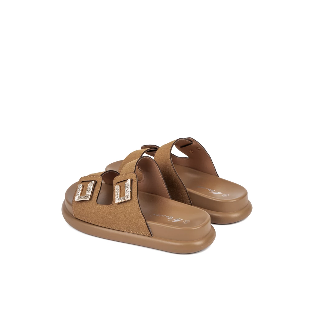 Ez a divatos papucs tökéletes választás a melegebb napokra, ha fontos számodra a komfort, de nem szeretnél lemondani az esztétikumról sem. Két széles pántja stabil tartást biztosít, a dekoratív csatok pedig karaktert adnak a megjelenésének. A vastag, párnázott talp gondoskodik a puha járásról, akár egész napos viselés esetén is. Ideális választás városi sétákhoz, nyaraláshoz vagy otthoni használatra.