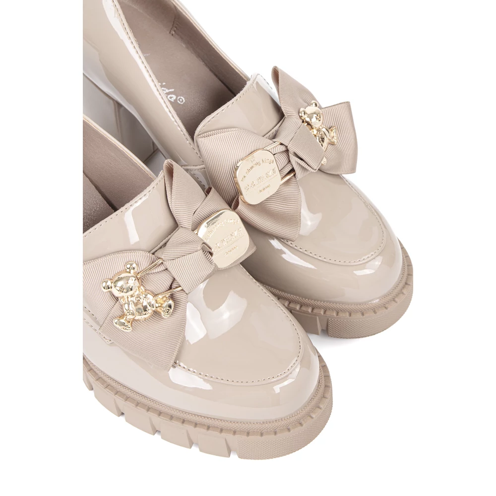 Modern, letisztult, egyben nőies stílusjegyeket magában hordozó lábbeli, mely a hétköznapokban és eseményeken is megállja a helyét. Egyszerűsége teszi igazán különlegessé, mivel nem csak könnyen kombinálható, de nagyon elegáns megjelenésű lábbeli is. A magassarkú loafer elején található arany színű dísz levehető.