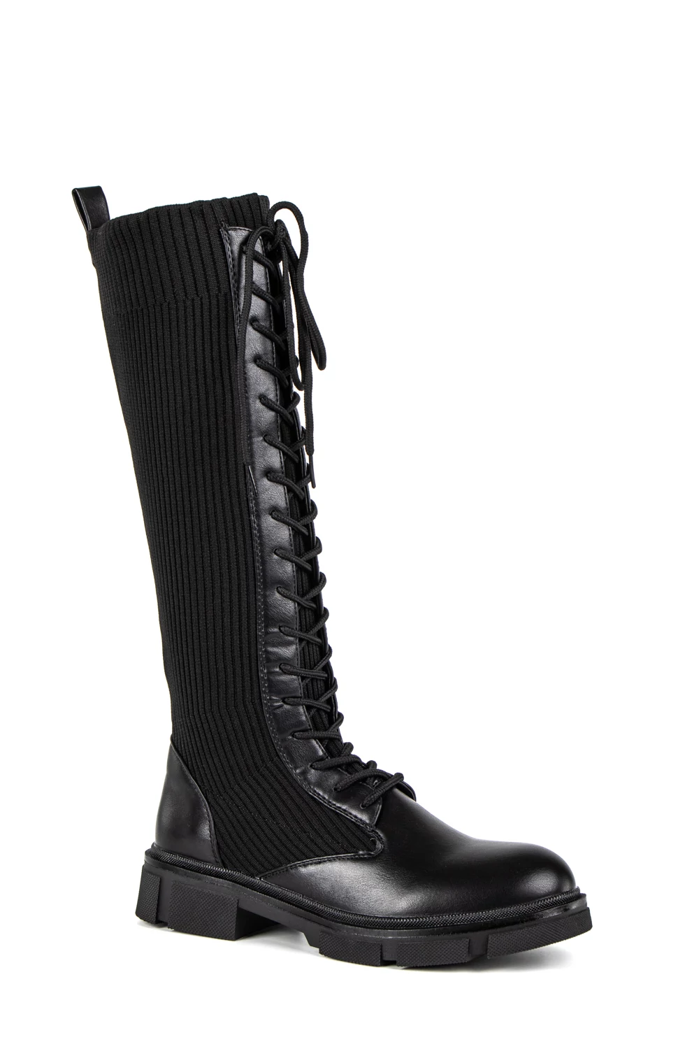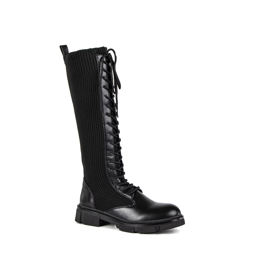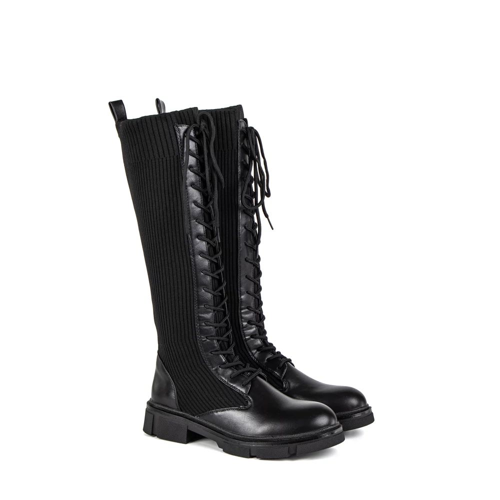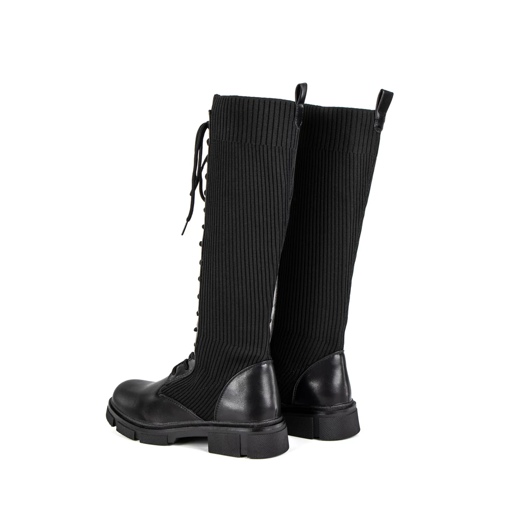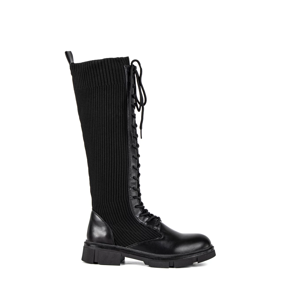 Egyedi kialakítású, magasszárú csizma fűzős kialakítással. Szára harisnyaszerű textil anyagból készült, így rugalmas, ugyanakkor könnyen illeszkedik a lábhoz. Talpa gumírozott anyagú, így a nedvesebb napok során is biztonságosan viselhetjük, hiszen nem csúszik könnyen. Remekül kombinálható rövid szoknyákkal, de egyszerű stílusának köszönhetően rengeteg outfittel kompatibilis.