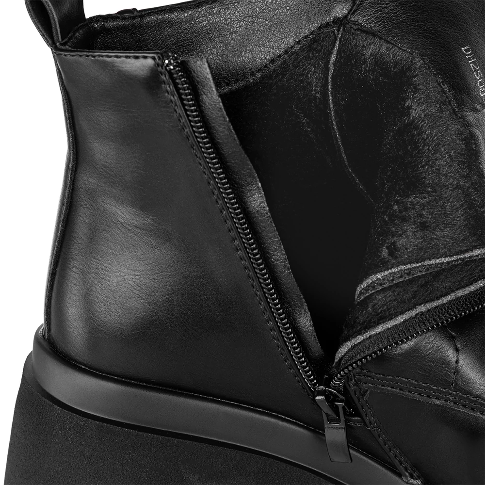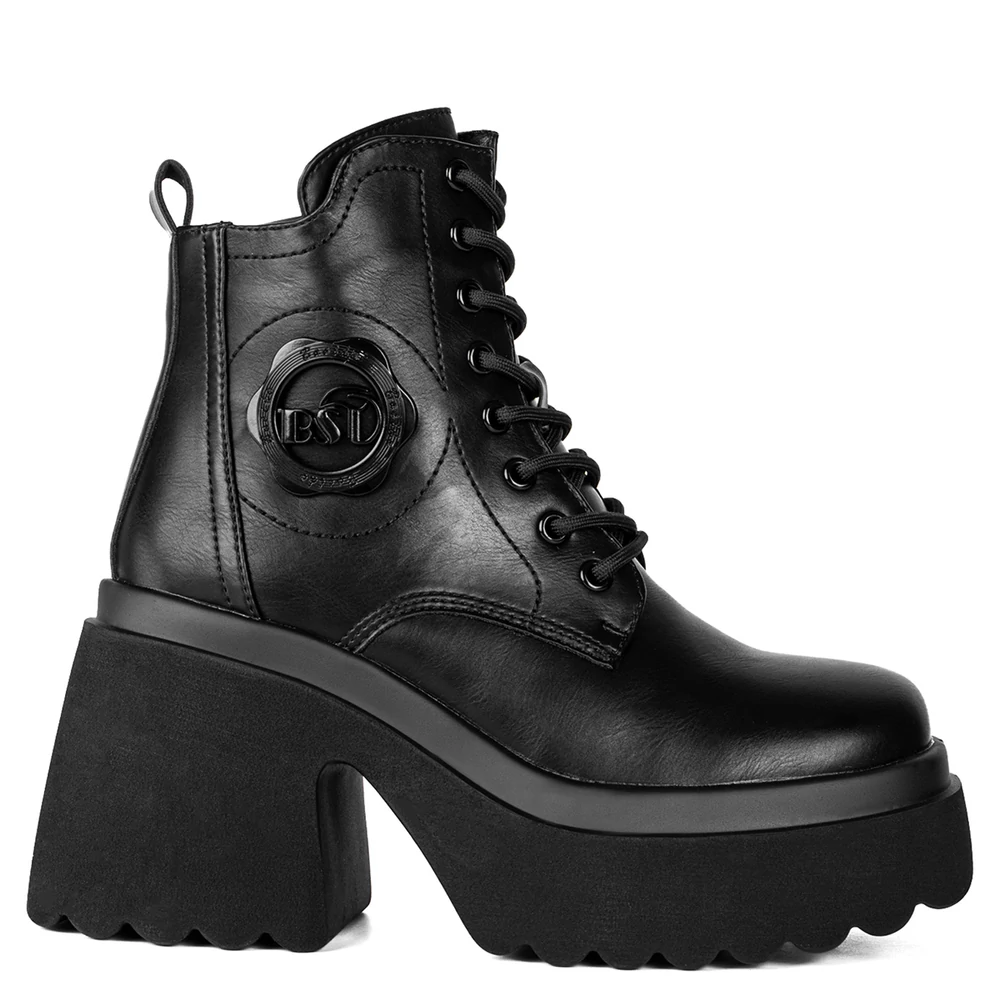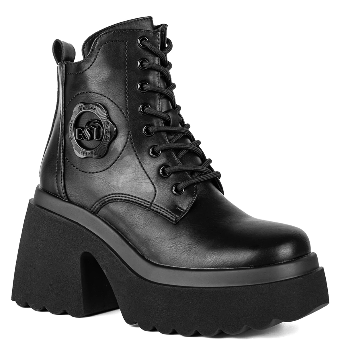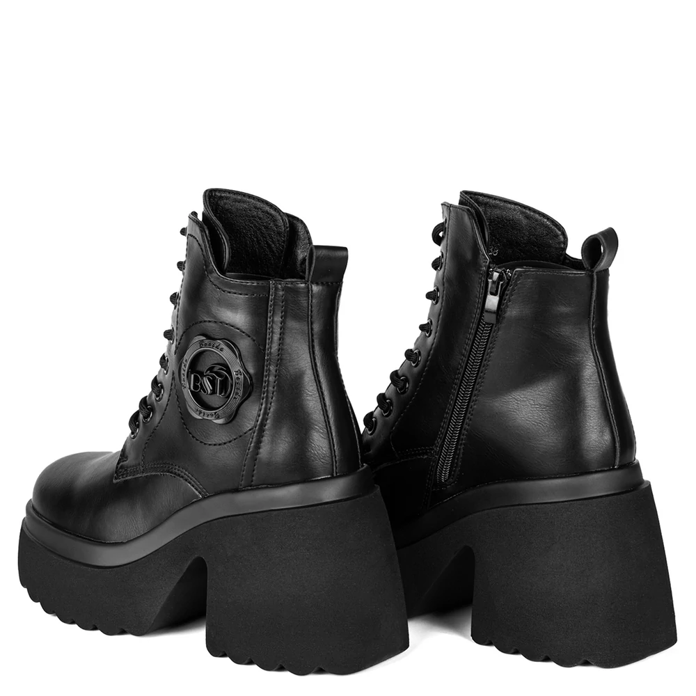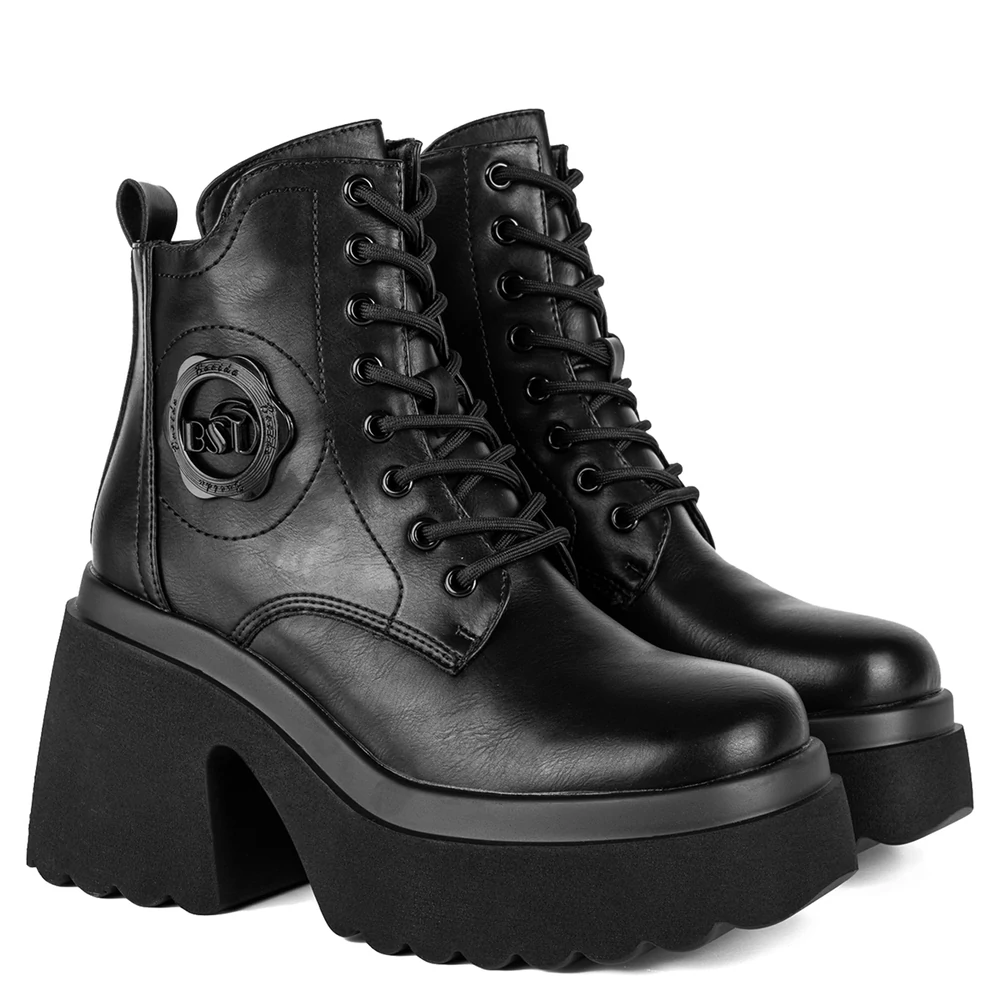 Karakteres stílus és magabiztos megjelenés egyetlen pár cipőben. Ez a fűzős, belső cipzáras bokacsizma vastag, hangsúlyos talppal és magasított sarokkal készült, amely optikailag nyújtja a lábat, miközben stabil tartást biztosít. A cipő oldalán elhelyezett fényes márkadíszítés különleges, városi hangulatot ad a megjelenésnek. A belső rész finoman bélelt, így hűvösebb időben is komfortos viselet. Egyaránt passzol farmerhez, leggingshez vagy akár vastagabb harisnyával viselt ruhához is – ideális választás azoknak, akik szeretik a feltűnésmentesen vagány részleteket.
