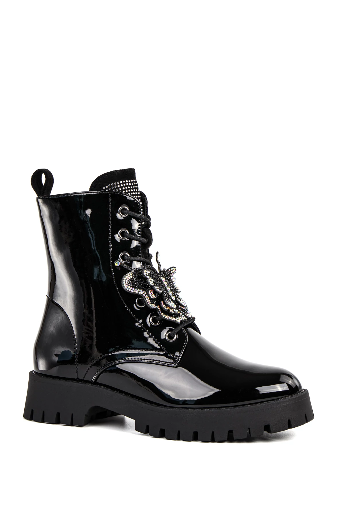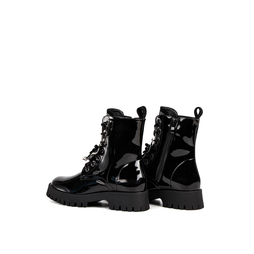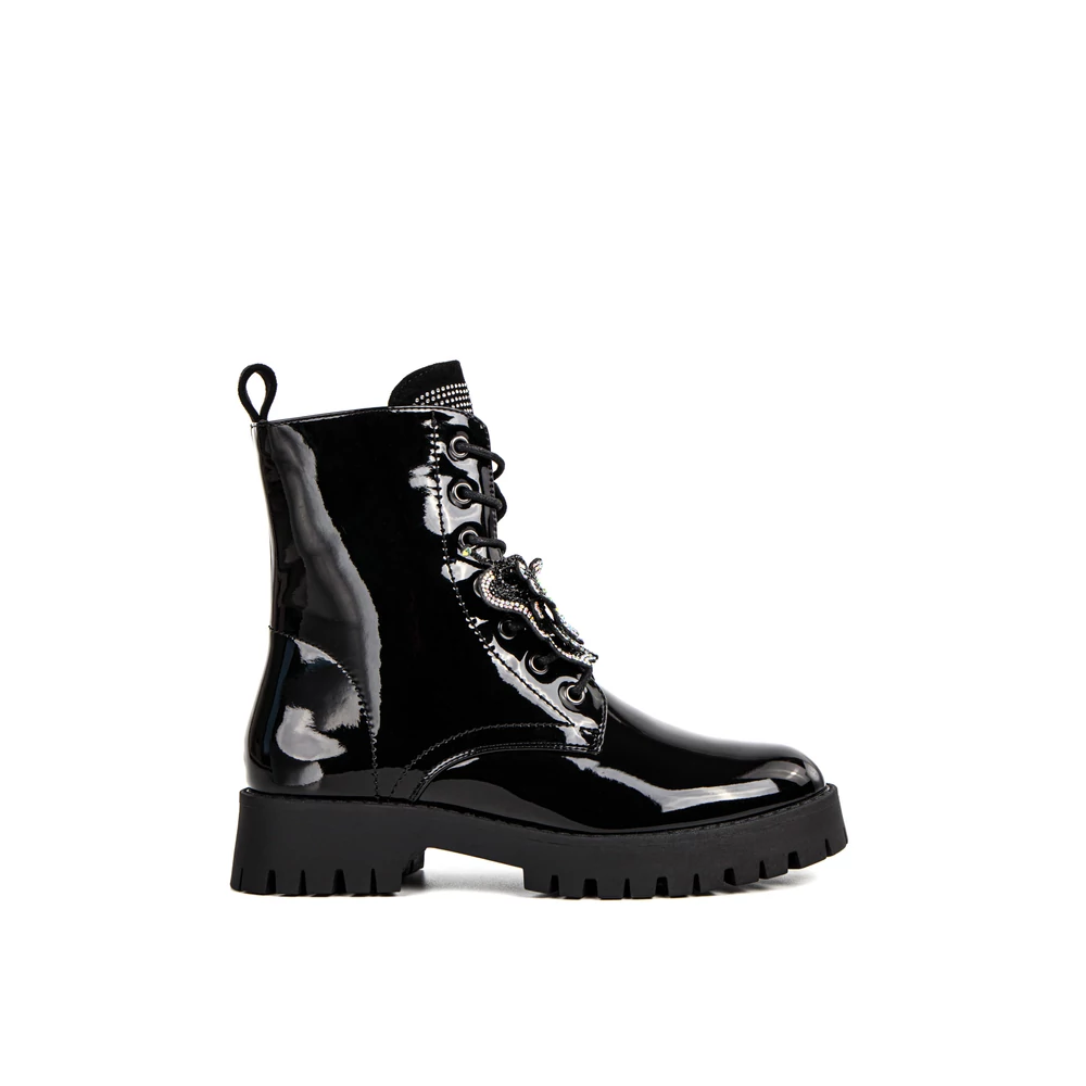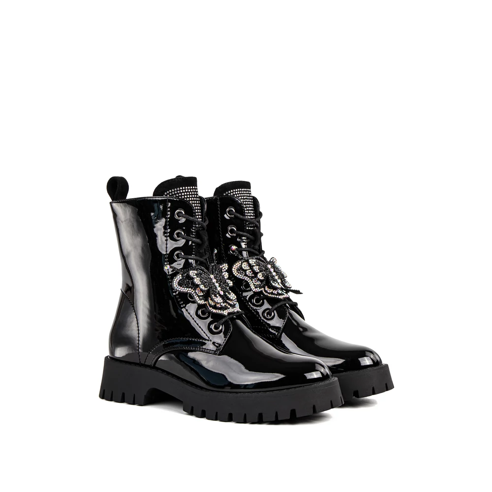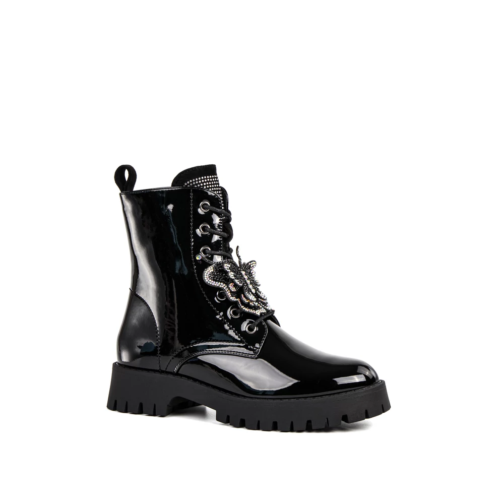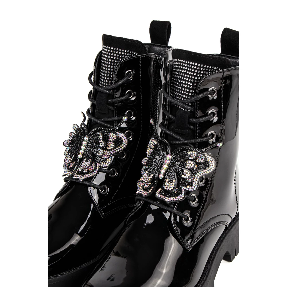 Egyszerű fűzős, divatos bakancs, ami nemes egyszerűsége által jól kombinálható különféle stílusú ruhadarabokkal. Lakkozott anyaga különlegessé és kényelmessé teszi. A cipőn lévő cipzárnak köszönhetően könnyedén fel és levehető. A fűzőn lévő strasszköves díszítés egy plusz különlegességet ad a bakancsnak.