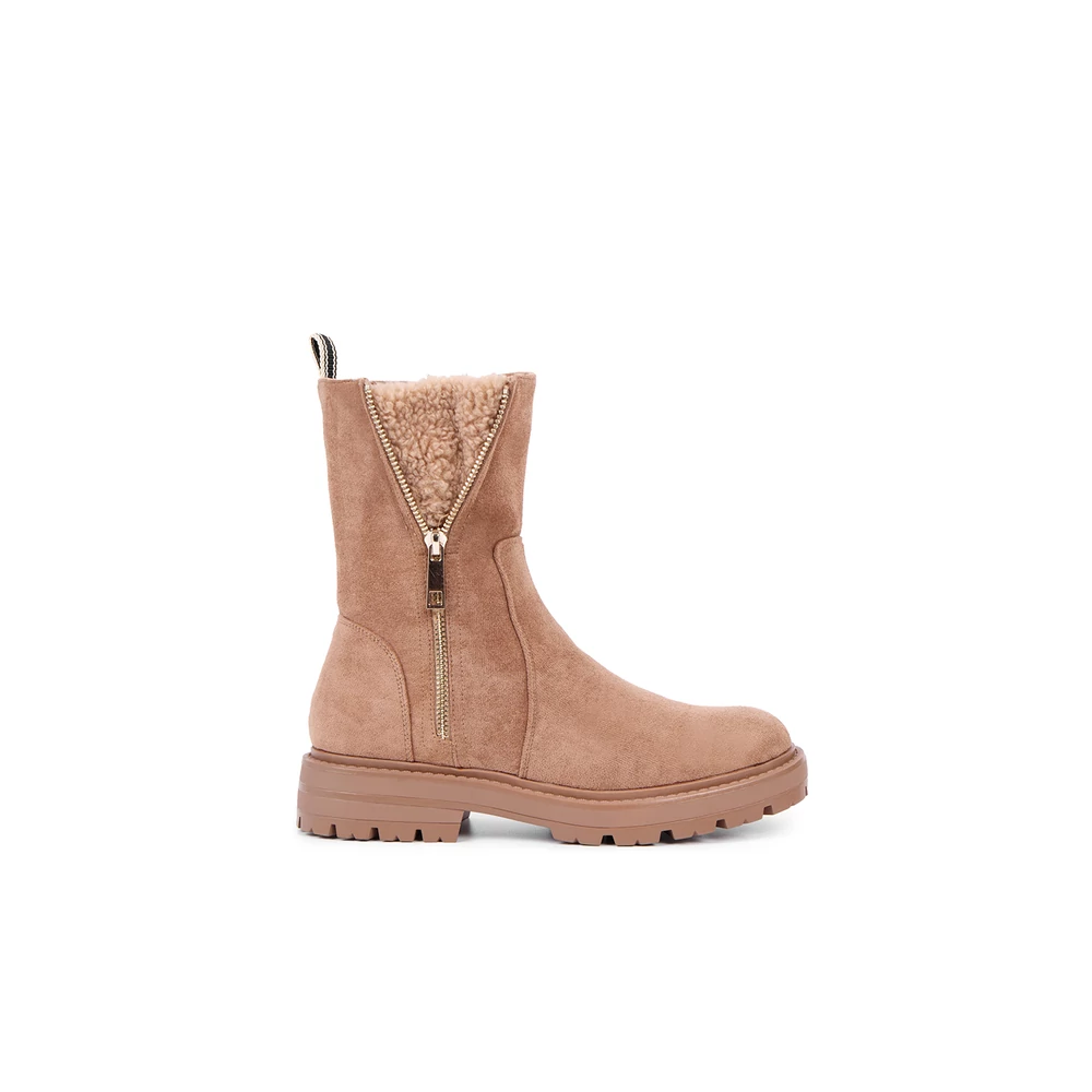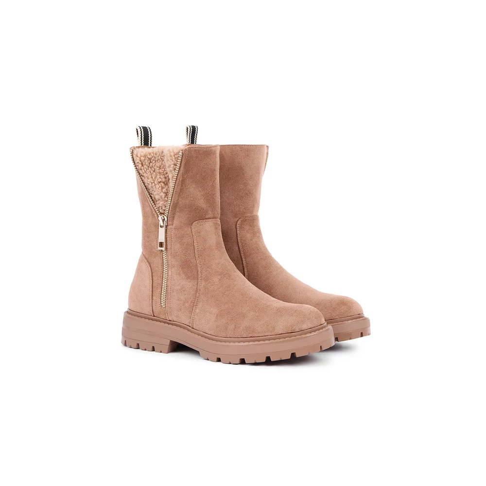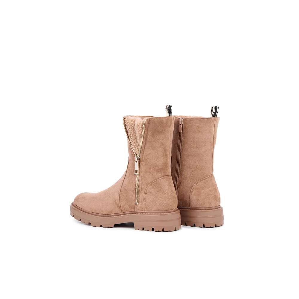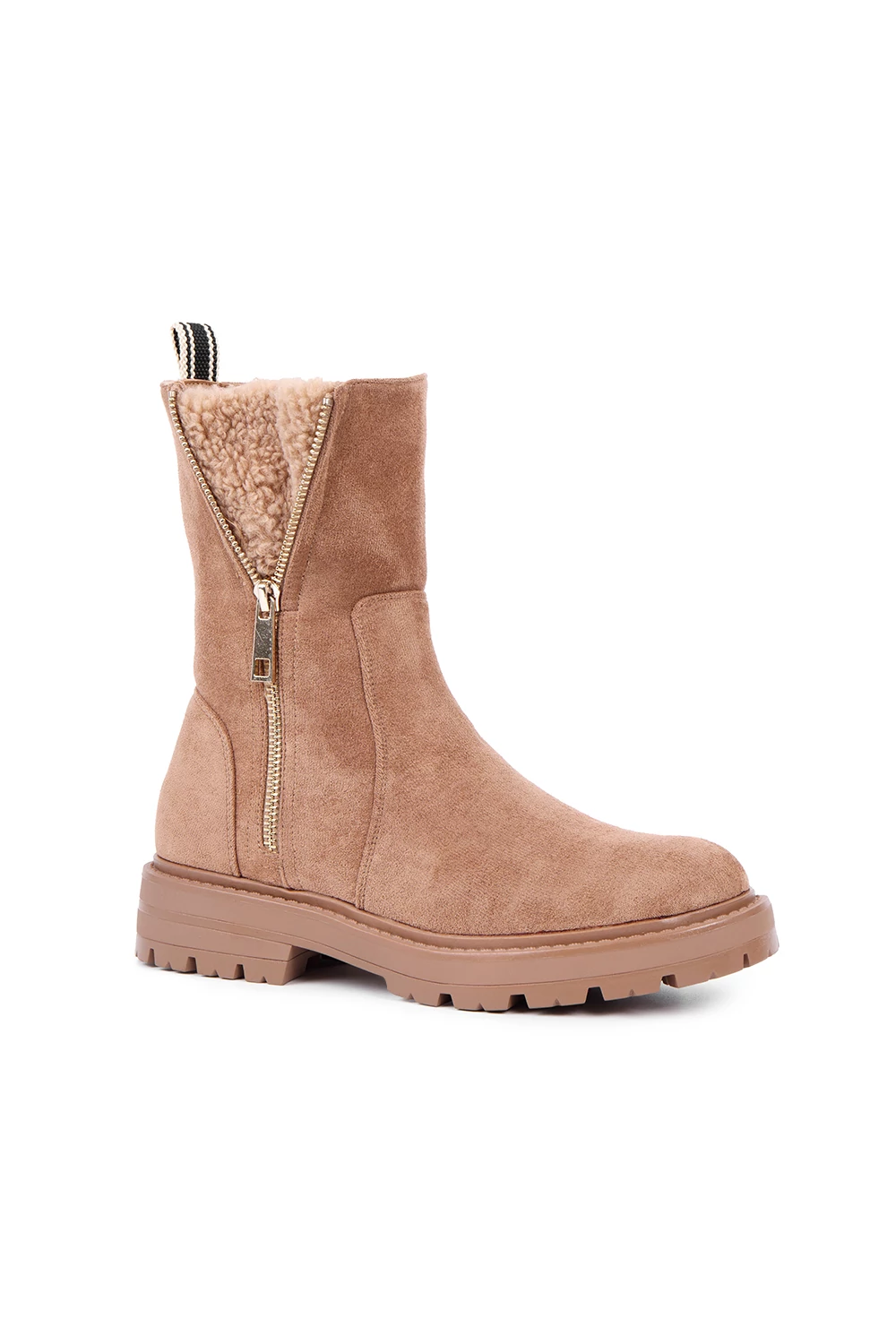 Letisztult stílusú, divatos és elegáns bokacsizma cipzáras és műszőrme díszítéssel. Enyhén emelt sarokrésze miatt kényelmes viselet lehet a mindennapokban.