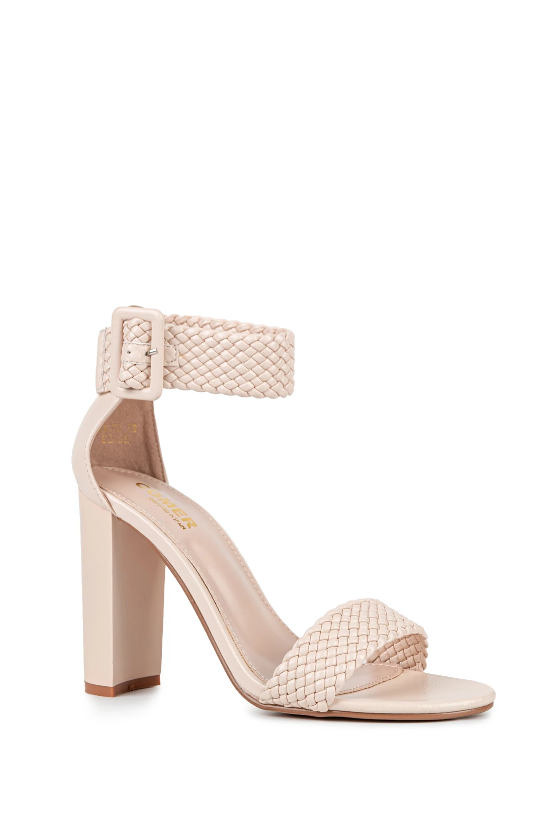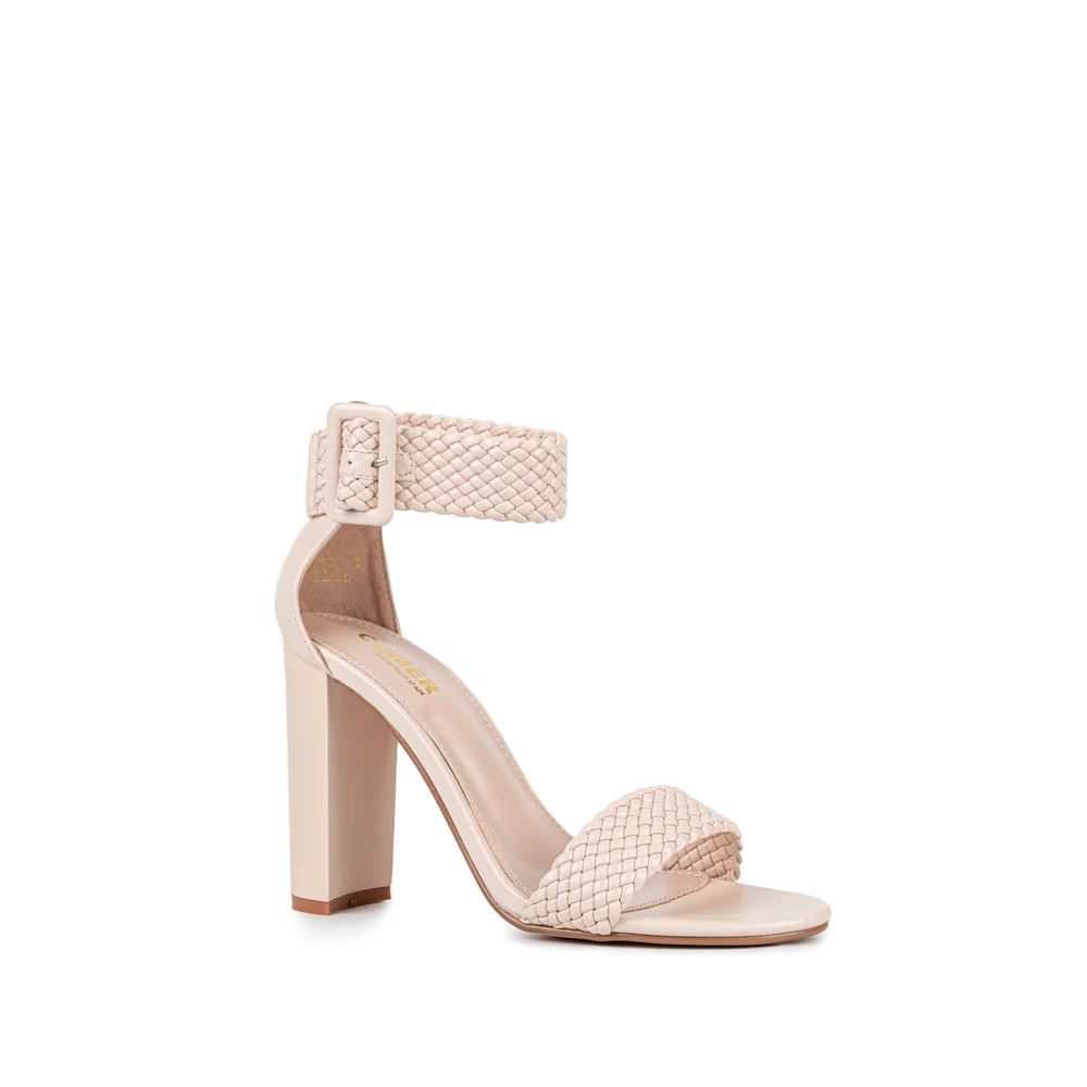 Feltűnő, különleges magassarkú alkalmi szandál, fonott pántokkal.