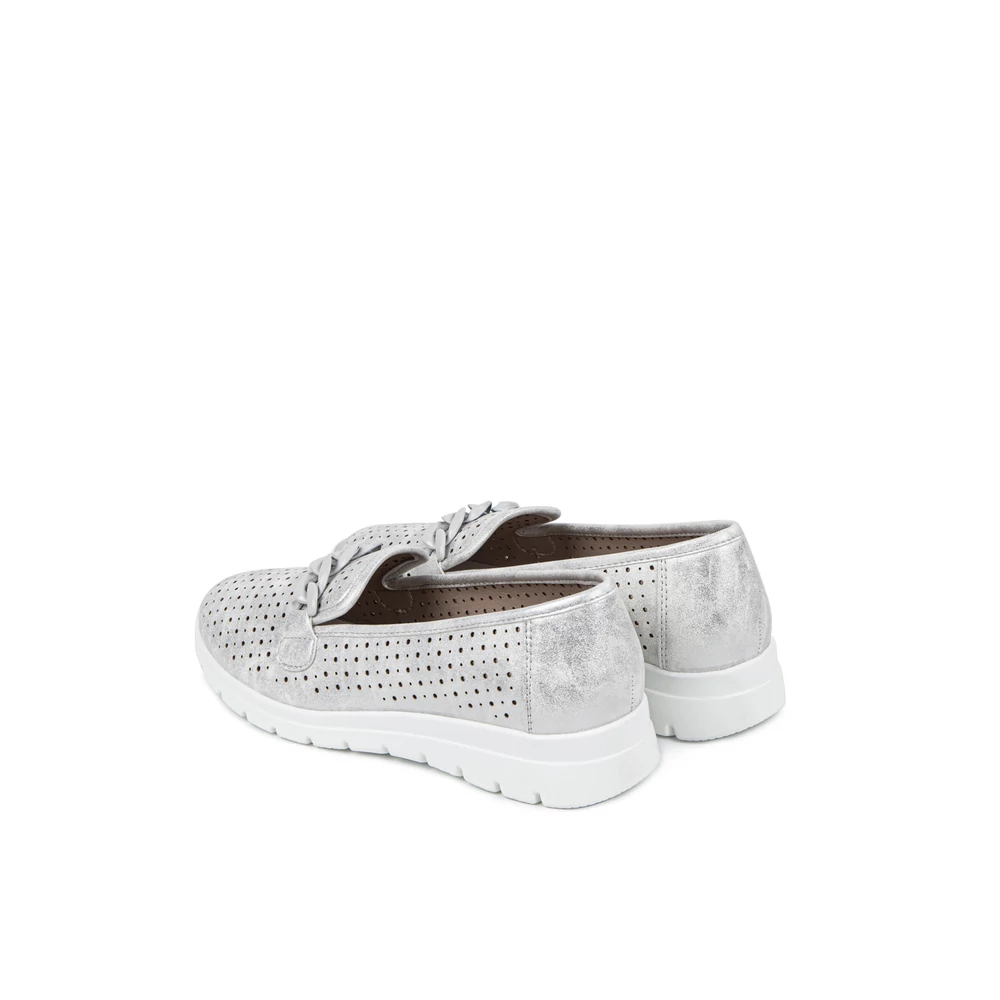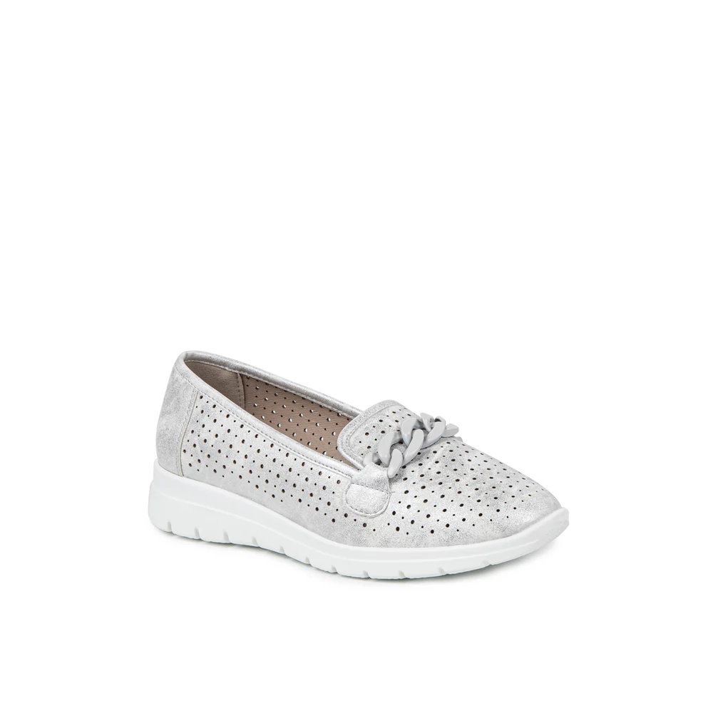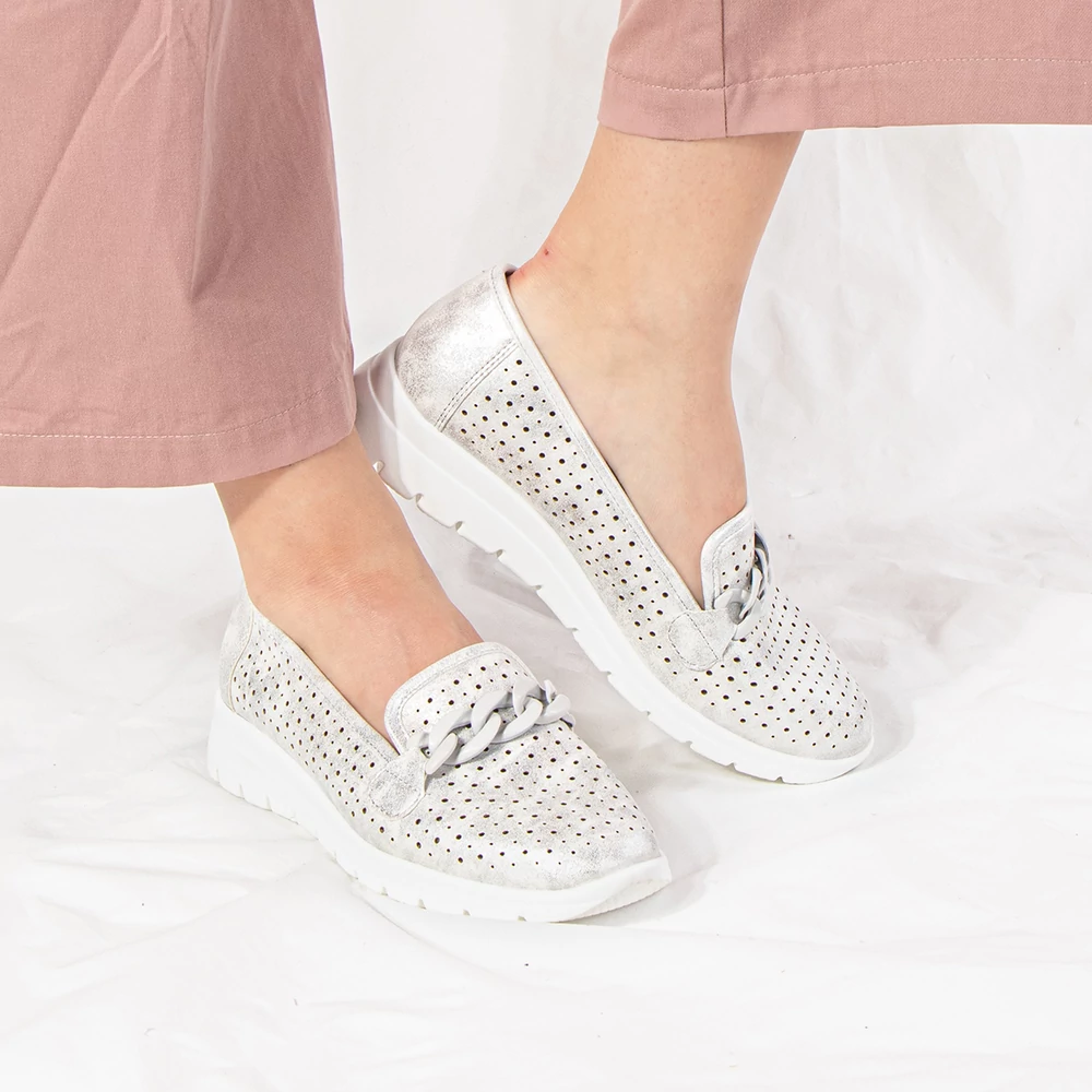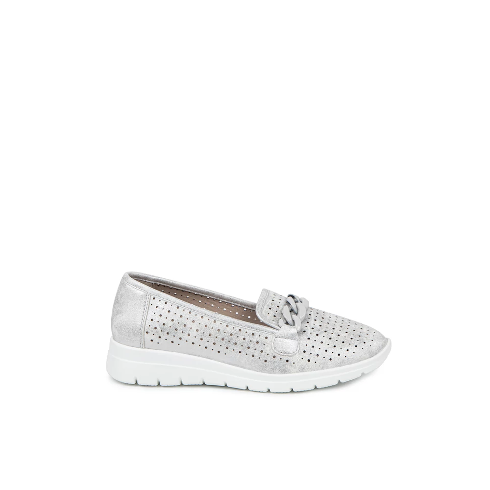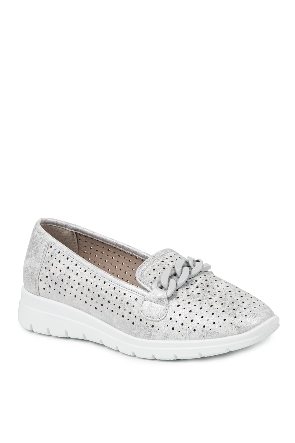 Letisztult, mégis elegáns megjelenésű női félcipő, diszkrét láncos díszítéssel.