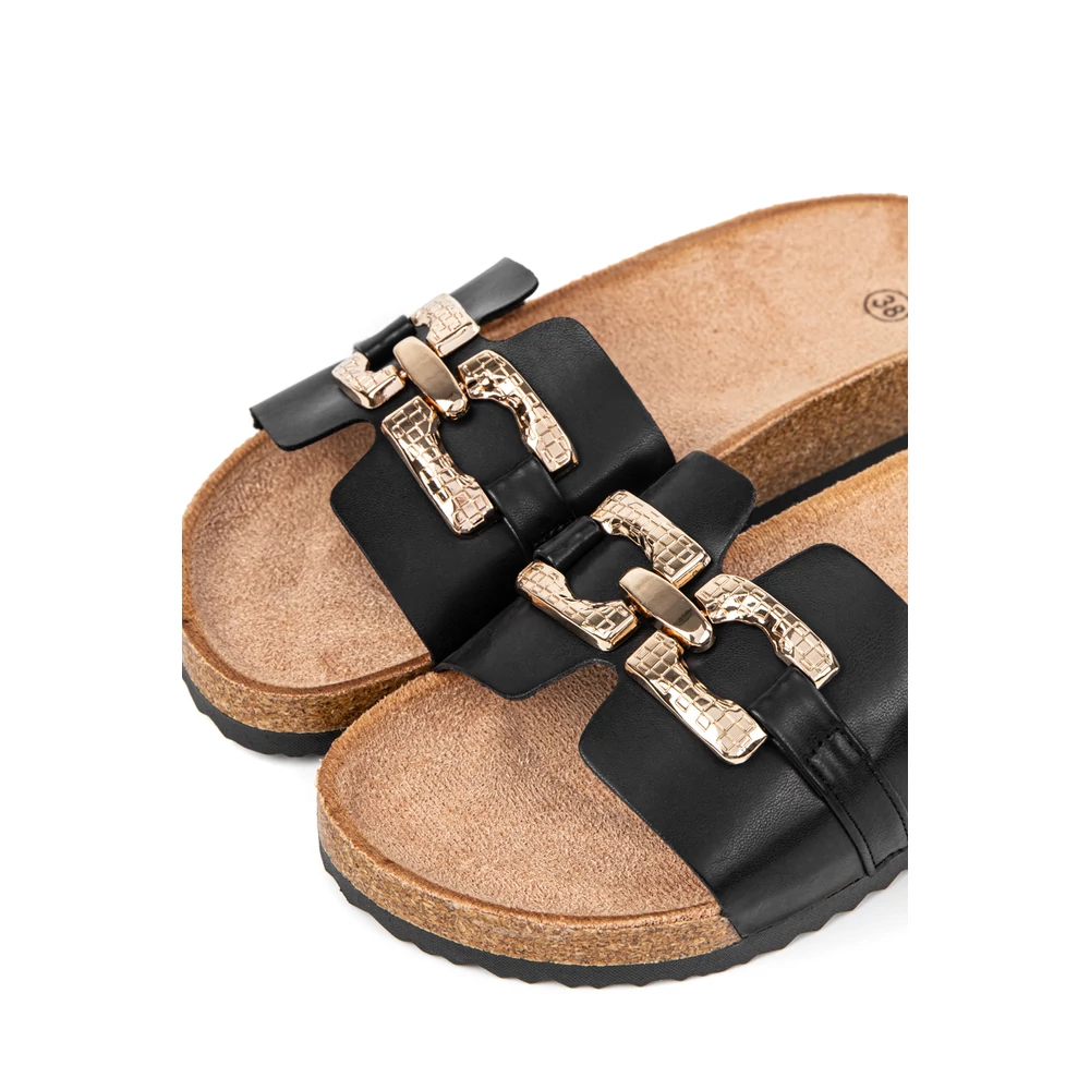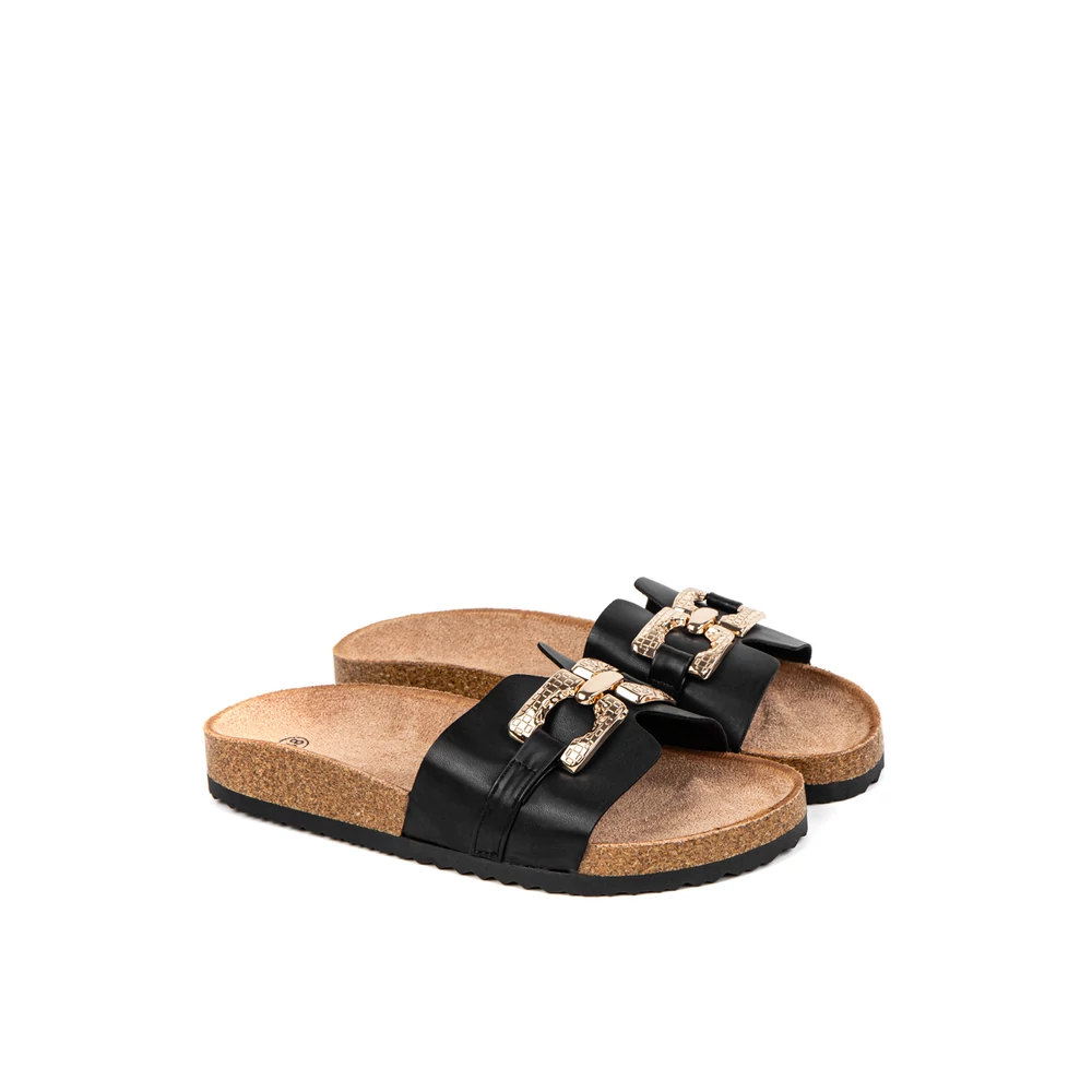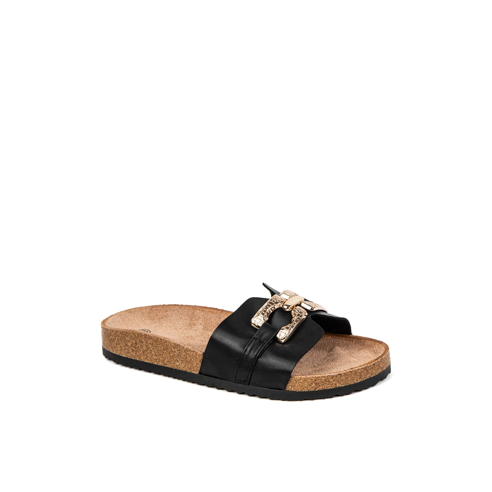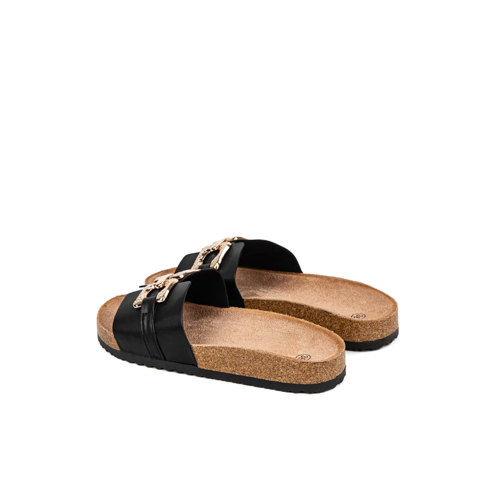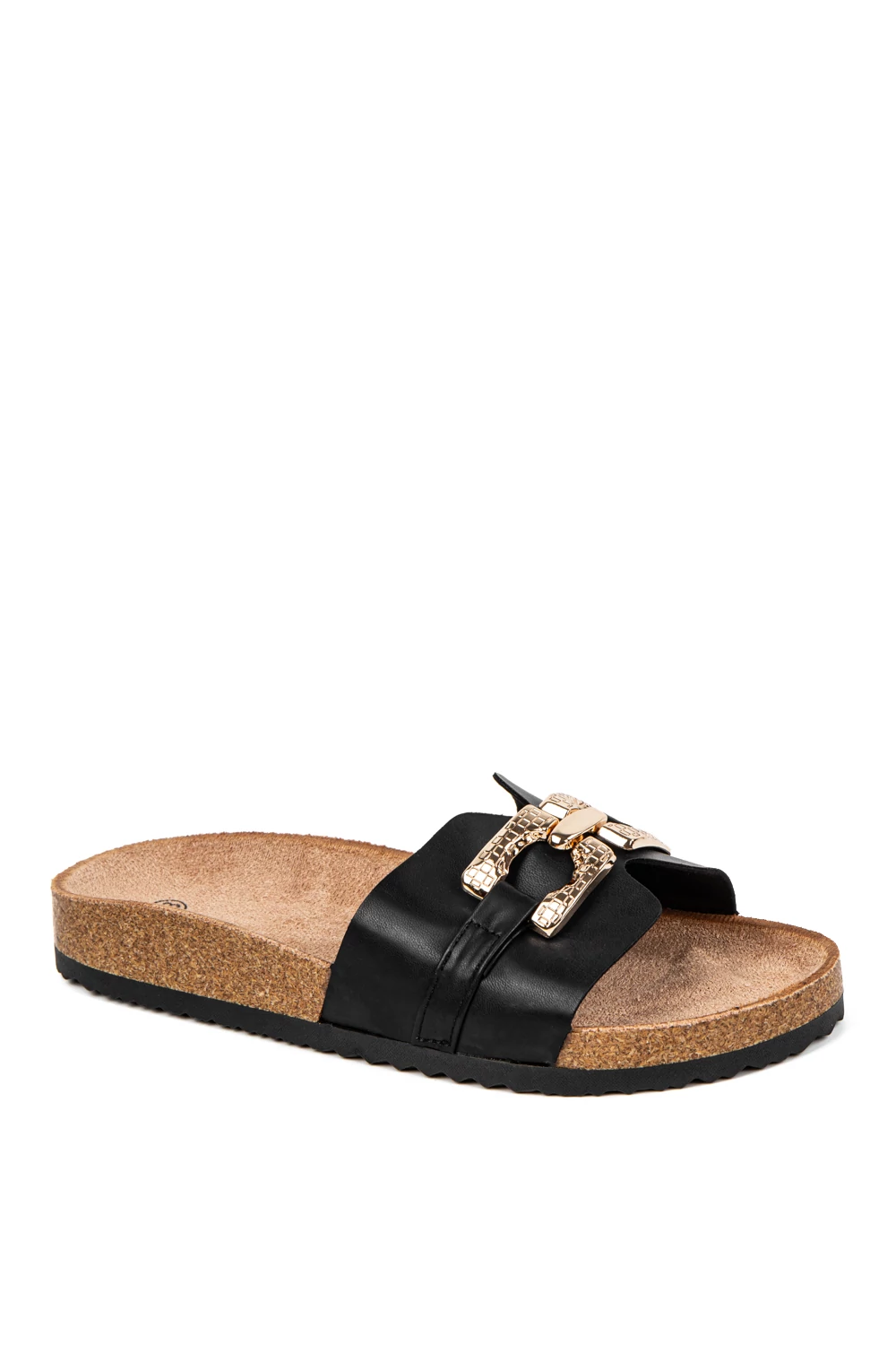 Elejét egy divatos arany színű csat díszíti, ami igazán előkelővé varázsolja a papucsot.