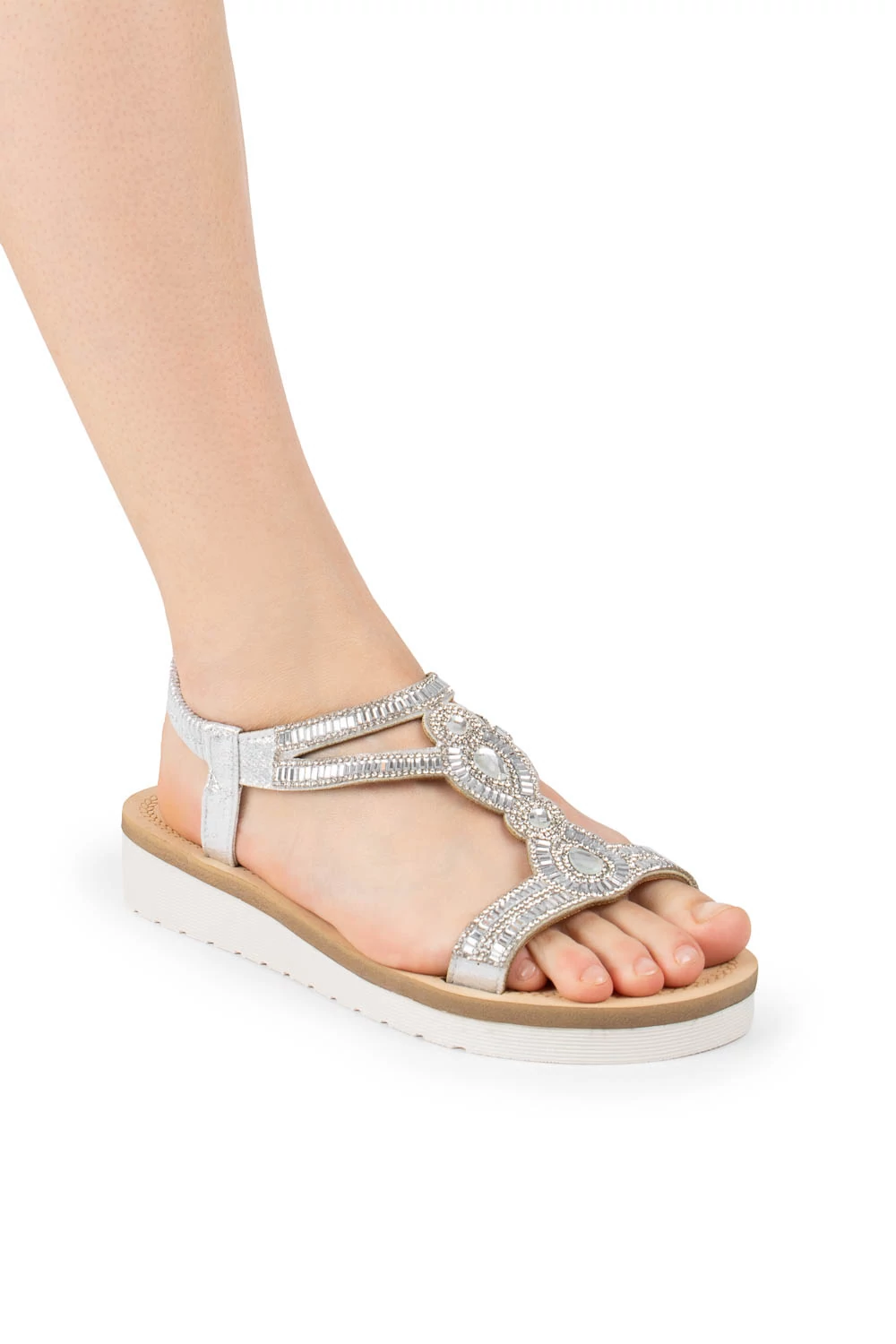 Gyönyörű strasszkövekkel díszített, gumis pántú szandál.
