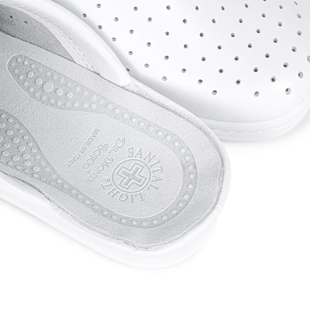 Lyukacsos, jól szellőző bőr felsőrésszel készült könnyű klumpa. Az anatómiai szempontok szerint előformázott talpbelső növeli a láb felfekvő felületét és biztosítja a nagyobb stabilitást. A talp puha poliuretán anyaga csillapítja a járás során, a láb földre érkezésekor keletkező rezgések ízületekre gyakorolt káros hatását. Ez az anyagösszetételének köszönhetően könnyű, rugalmas talp minden felületen lehetővé teszi az optimális tapadást, amely biztonságot és a stabilitás nyújt a lábnak. Az olasz tervezők a Sanital Light papucsokat a láb teljes jólétének biztosítására tervezték. A papucs célja, hogy megszüntesse azokat a problémákat, amelyek nem csak a lábfejnél jelentkeznek (bőrkeményedés, duzzanat), hanem a lábszárra és a hátra, gerincre is kivetülnek (rossz vérkeringés, nehéz láb érzet, hátfájás). Otthoni papucs vagy munkapapucs.