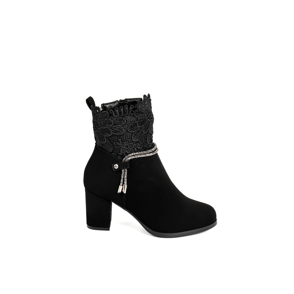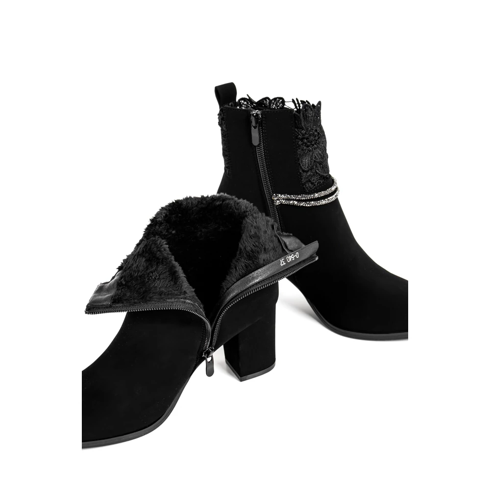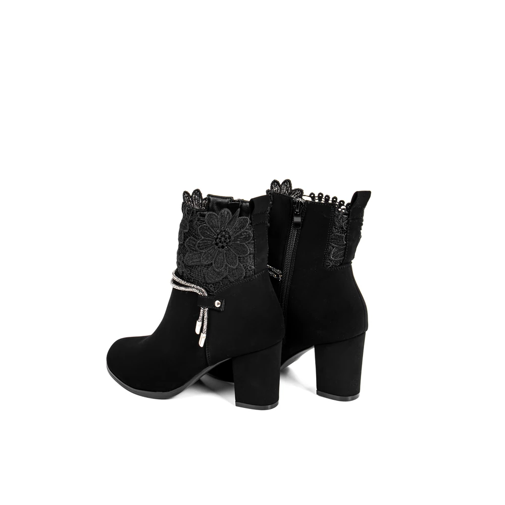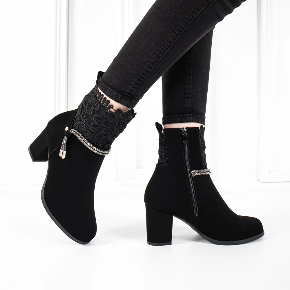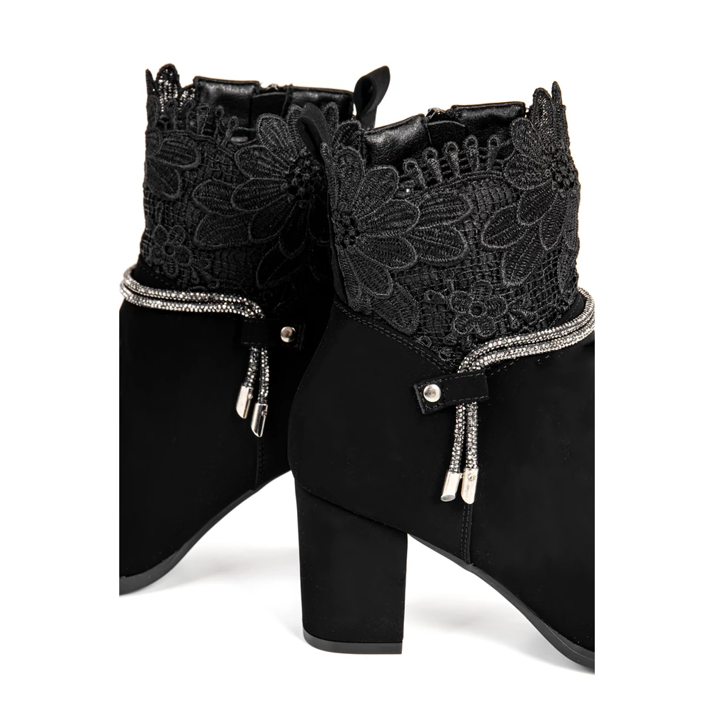 Bosido Fekete Műnubuk Bokacsizma Csipkés Szárral És Strasszköves Csattal