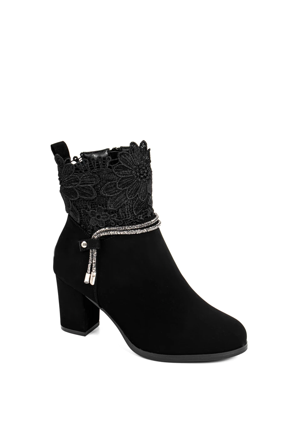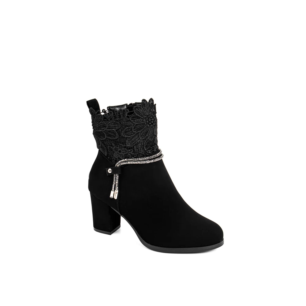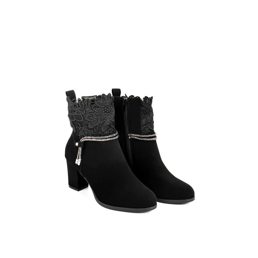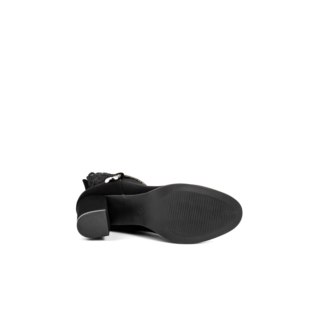 Bosido Fekete Műnubuk Bokacsizma Csipkés Szárral És Strasszköves Csattal