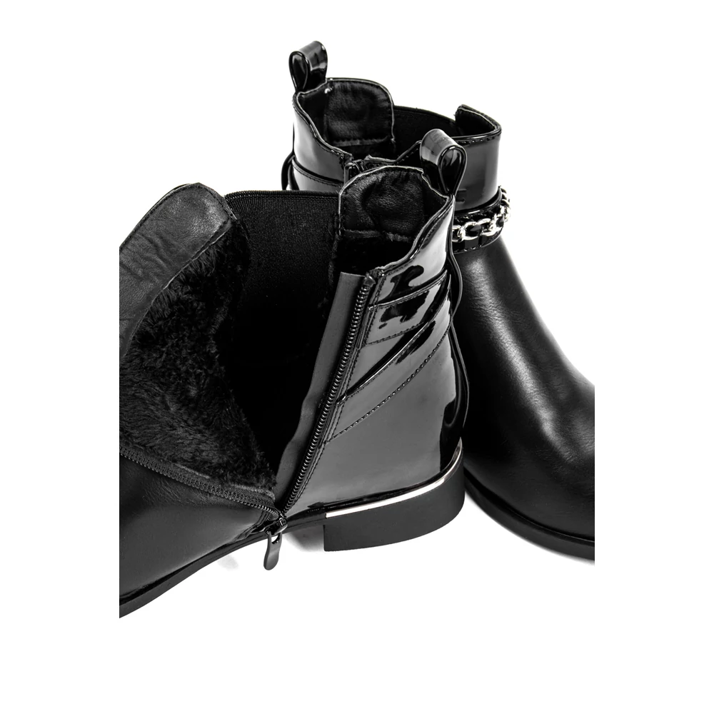 Különleges, elegáns, műszőrrel bélelt, műbőr bokacsizma, lakk betétes sarokrészének és ezüst színű, láncos díszítésének köszönhetően igazán nőies darab.