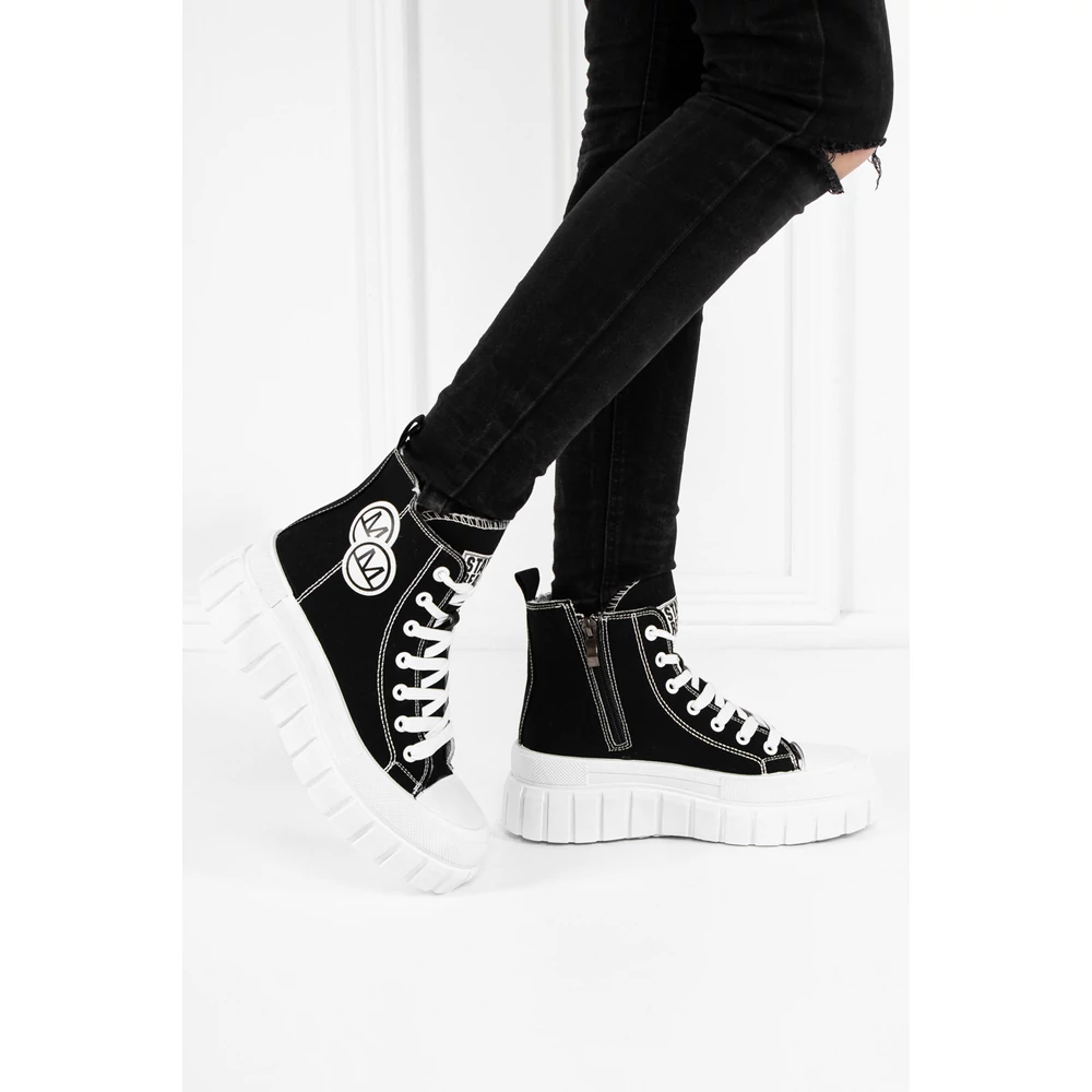 Feltűnő megjelenésű, műbőr tornacipő, platformos talppal, mely fekete és fehér, illetve bézs színben is megtalálható nálunk.