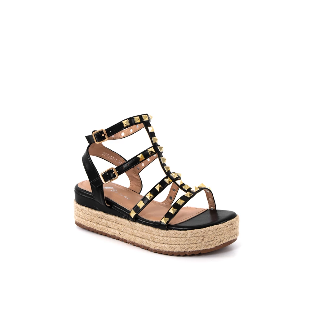 Műbőr anyagú, trendi, platform, háncstalpú, nyári szandál, aminek 2 helyen is csatok segítik a rögzítését. Sarus kialakítása rendkívül szexi, a szegecseknek köszönhetően pedig vagány is. Farmerhoz és nyári ruhához is tökéletes választás.