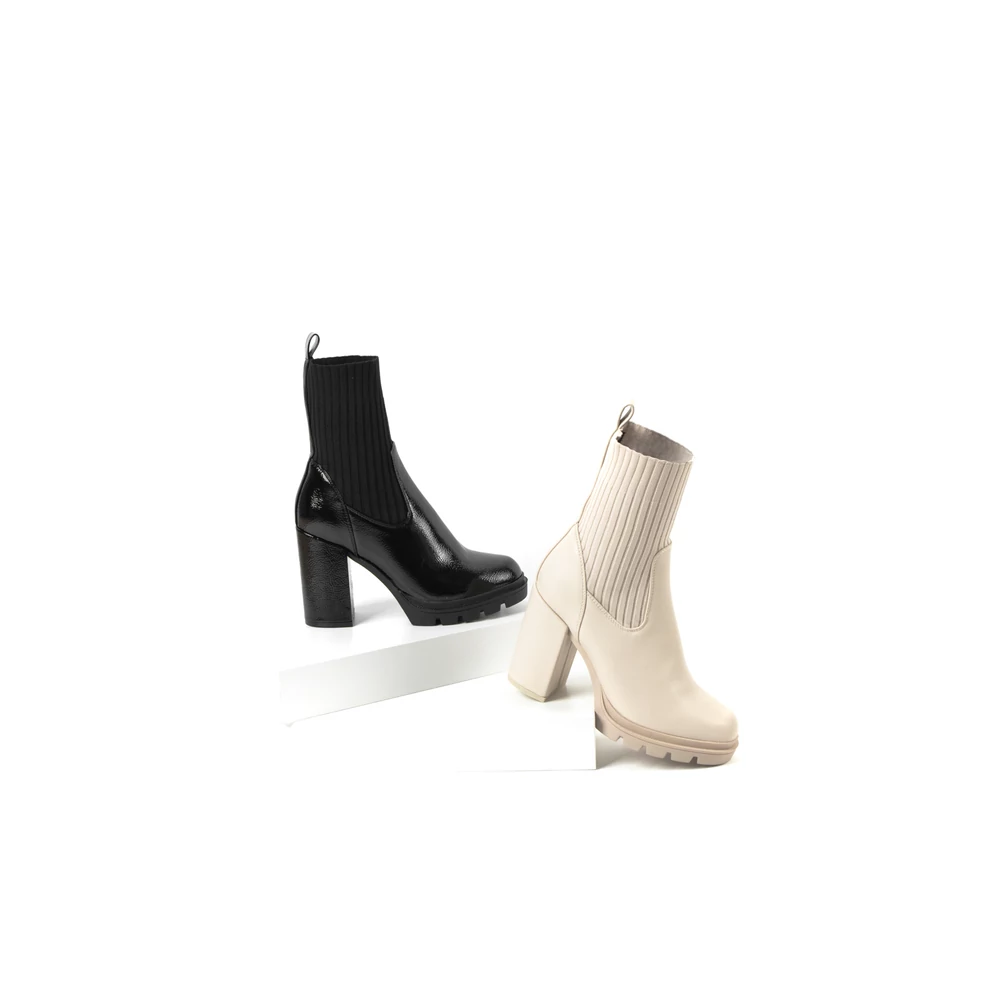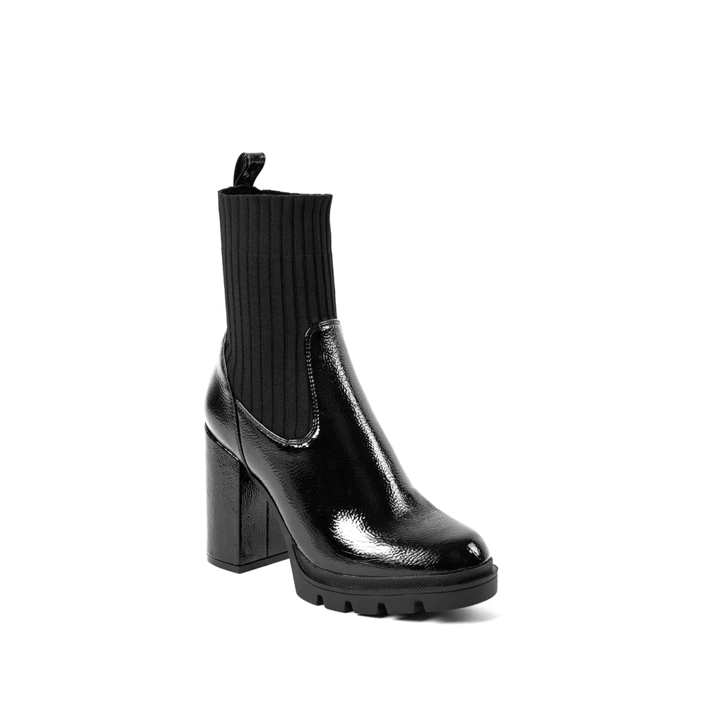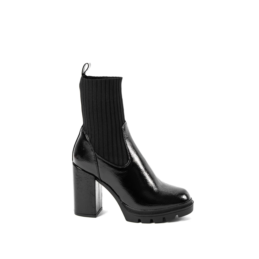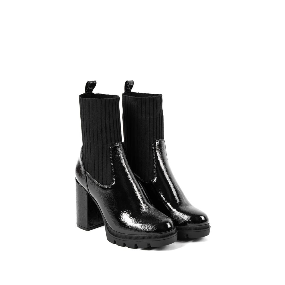 Lakkozott műbőr bokacipő, melynek szára textilből készült.