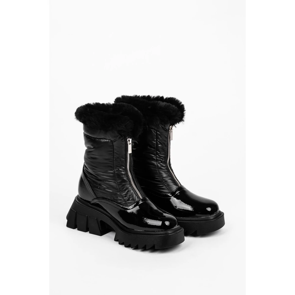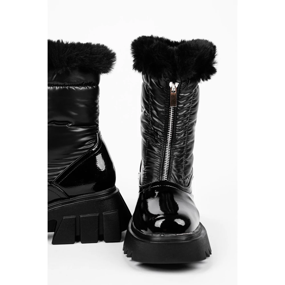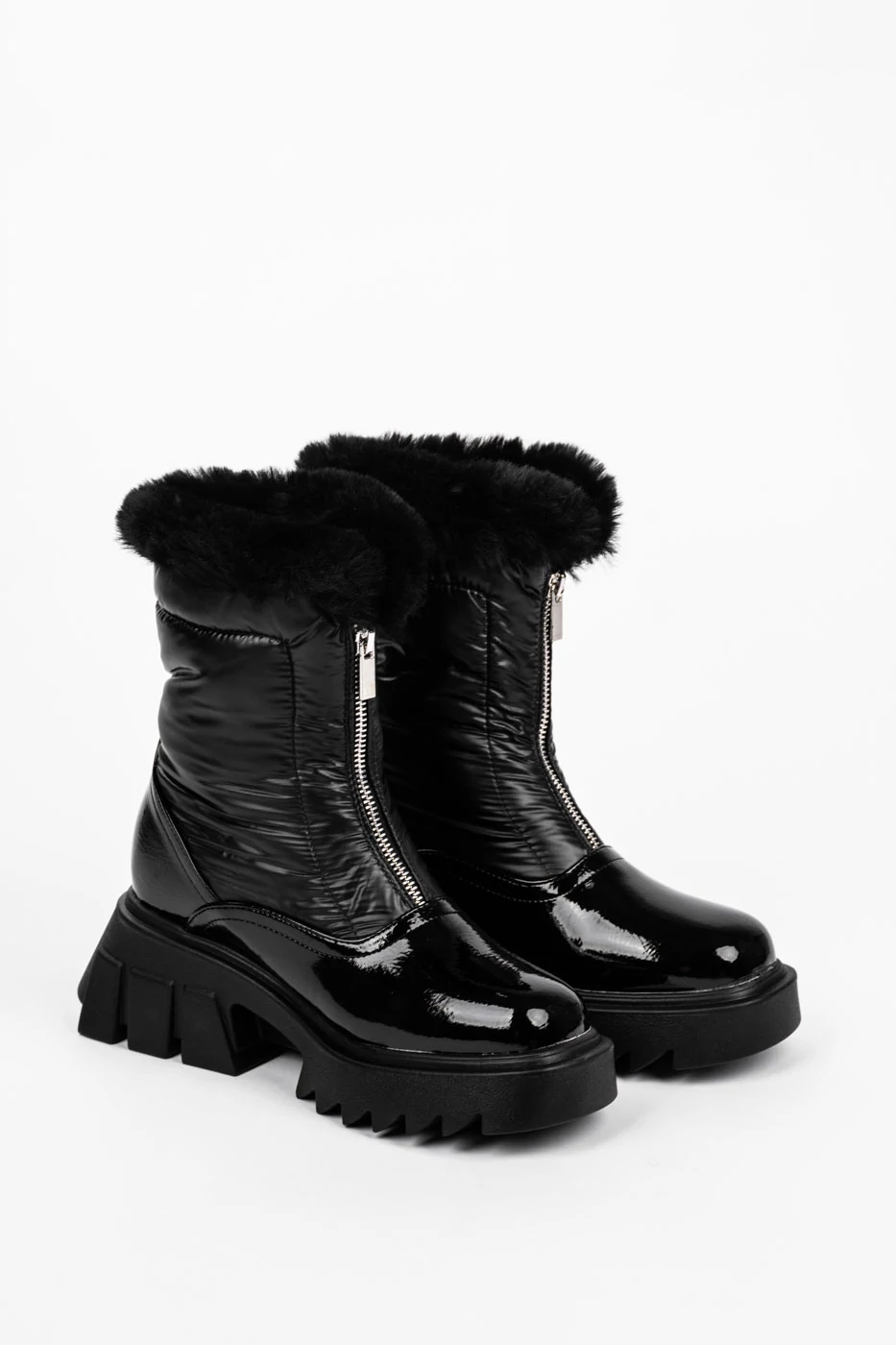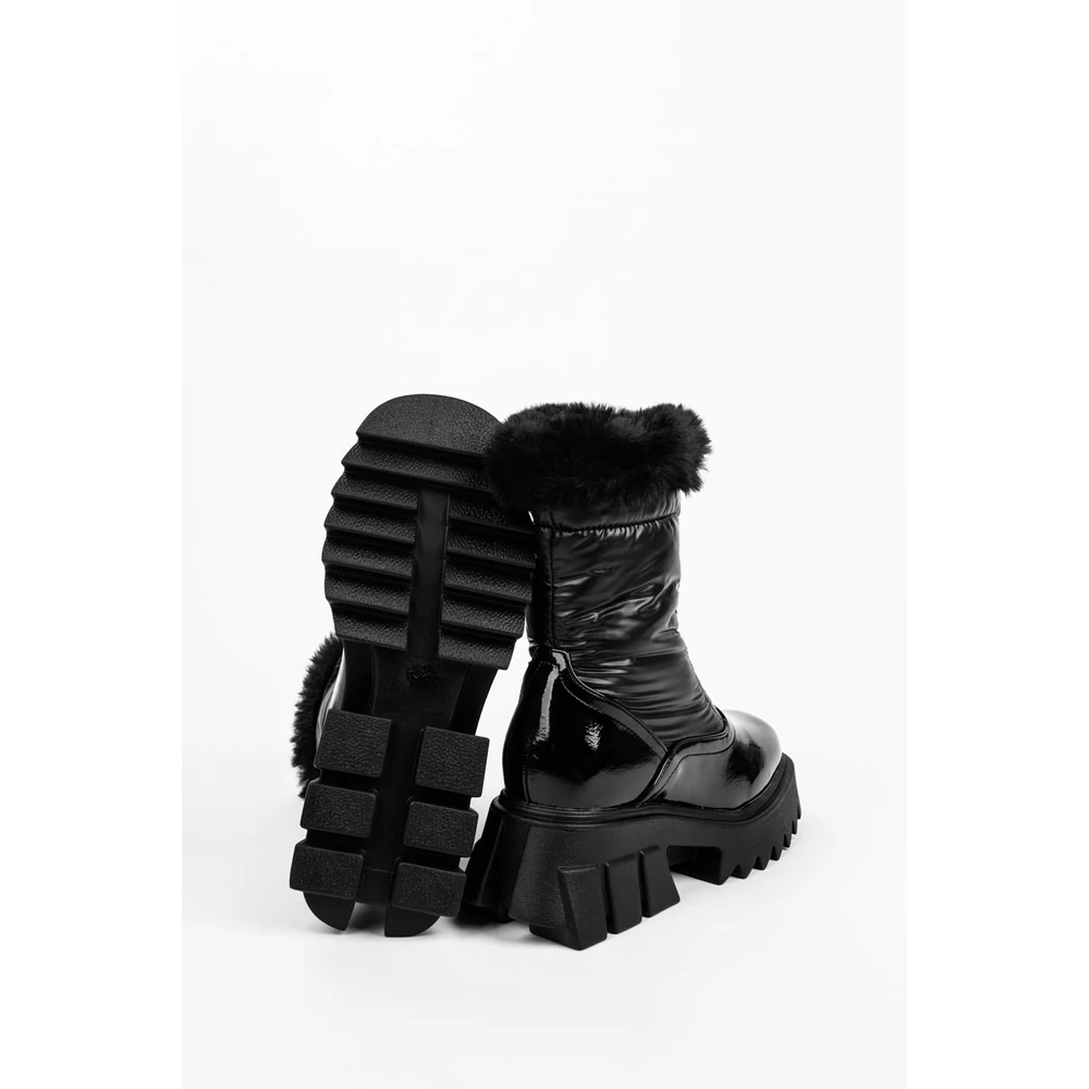 Félig lakkozott, félig PVC anyagú női bakancs, melynek tetejét szőrme díszíti.