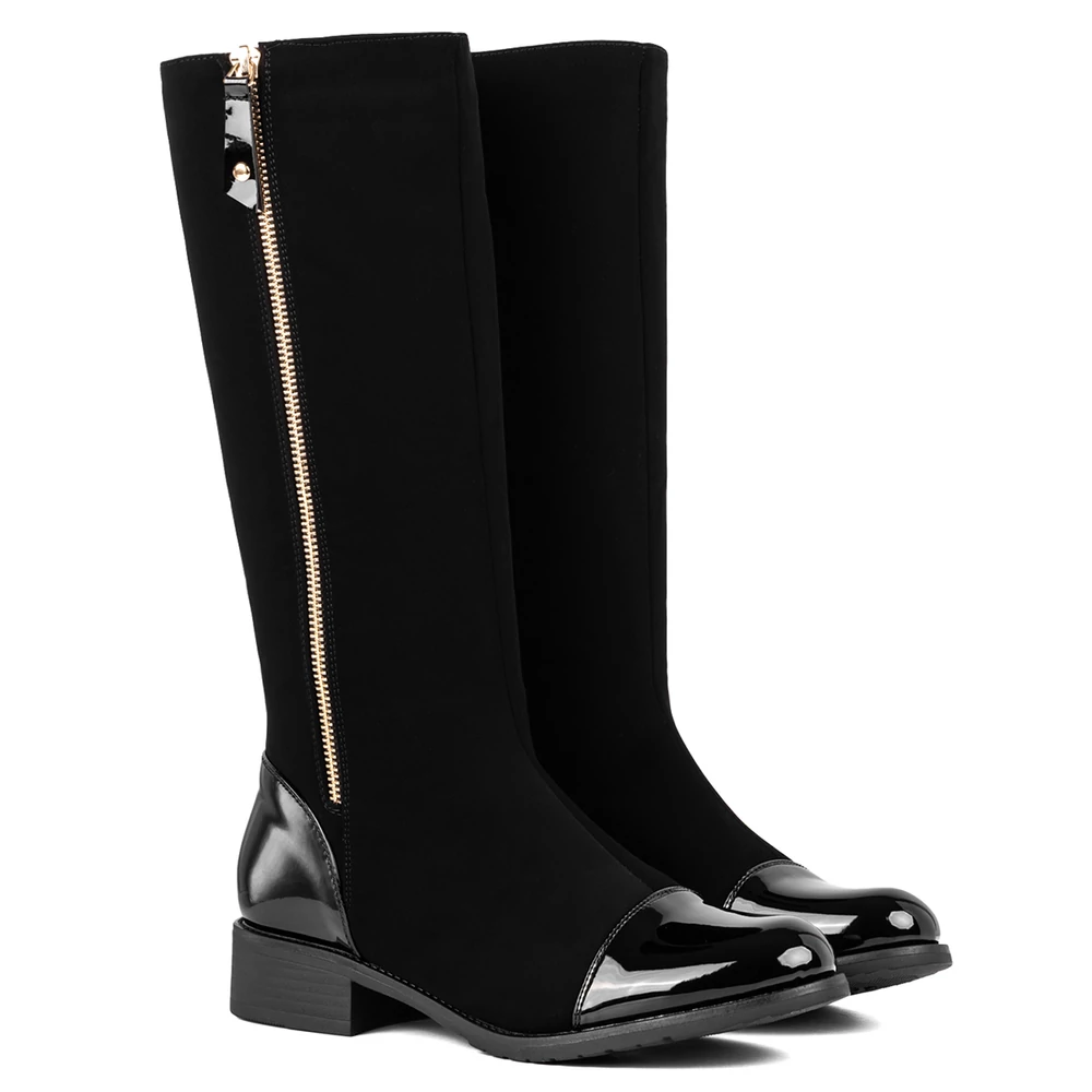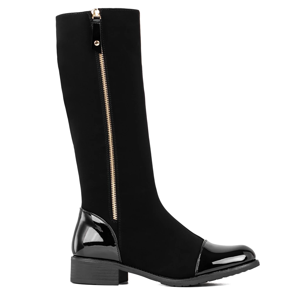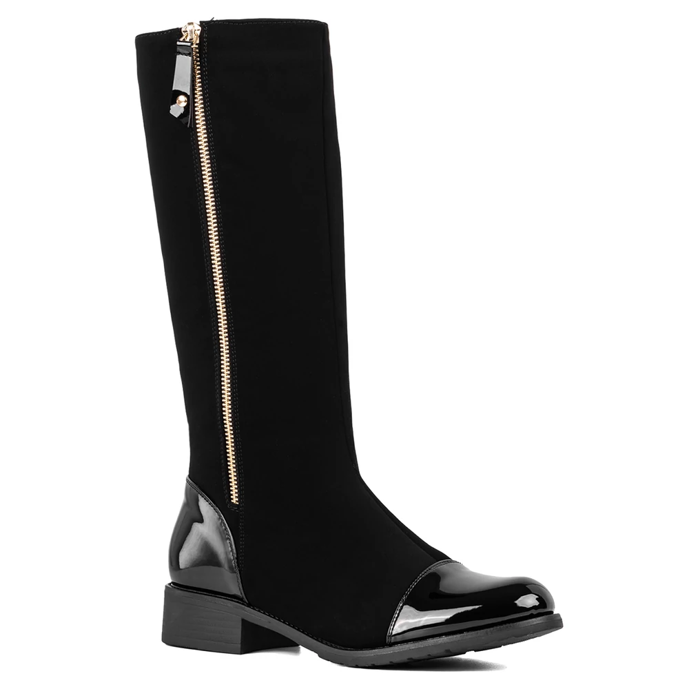 Ez a női csizma elegáns és praktikus választás a hidegebb napokra. A fekete szár letisztult megjelenést biztosít, míg a fényes orr- és sarokrész különleges, divatos kontrasztot ad a matt felülettel. Oldalsó cipzárja nemcsak dekoratív, hanem megkönnyíti a fel- és levételt is. A stabil, alacsony sarok kényelmes viseletet nyújt egész napra, a gumírozott talp pedig biztos tapadást garantál. Klasszikus fekete színe miatt szinte bármilyen öltözékhez jól illik, legyen szó hétköznapi vagy elegánsabb összeállításról.