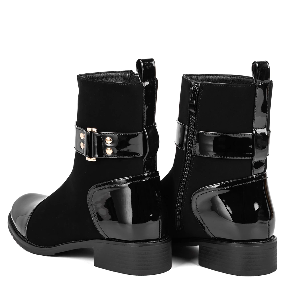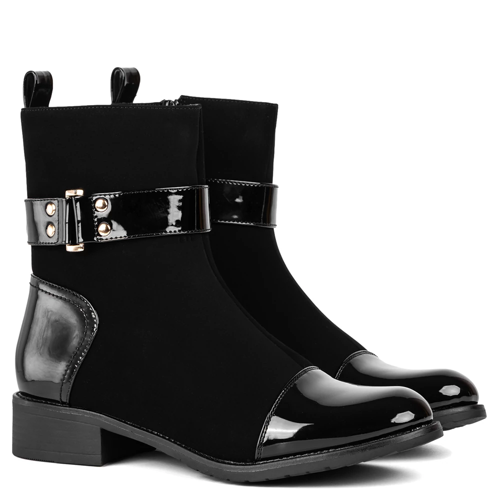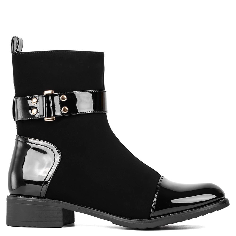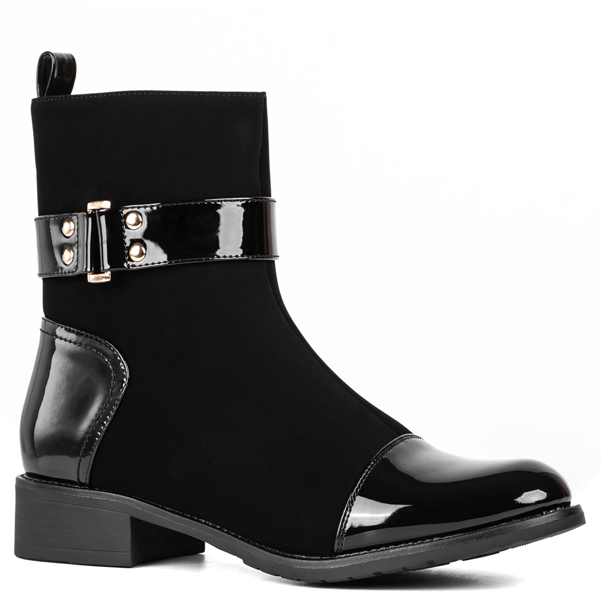 Ez a fekete bokacsizma elegáns és modern megjelenést biztosít, amelyet a fényes és matt anyagok kombinációja tesz igazán különlegessé. A felsőrészt egy dekoratív, fémcsattal ellátott lakkozott pánt díszíti, amely nőies részletként emeli ki a cipő stílusát. Az oldalán található cipzárnak köszönhetően könnyen fel- és levehető, a belső rész puha, meleg bélése pedig gondoskodik a kényelmes viseletről a hidegebb napokon is. A stabil, alacsony sarok és a bordázott gumitalp biztos járást nyújt, így a csizma egyszerre praktikus és divatos választás a mindennapokra.