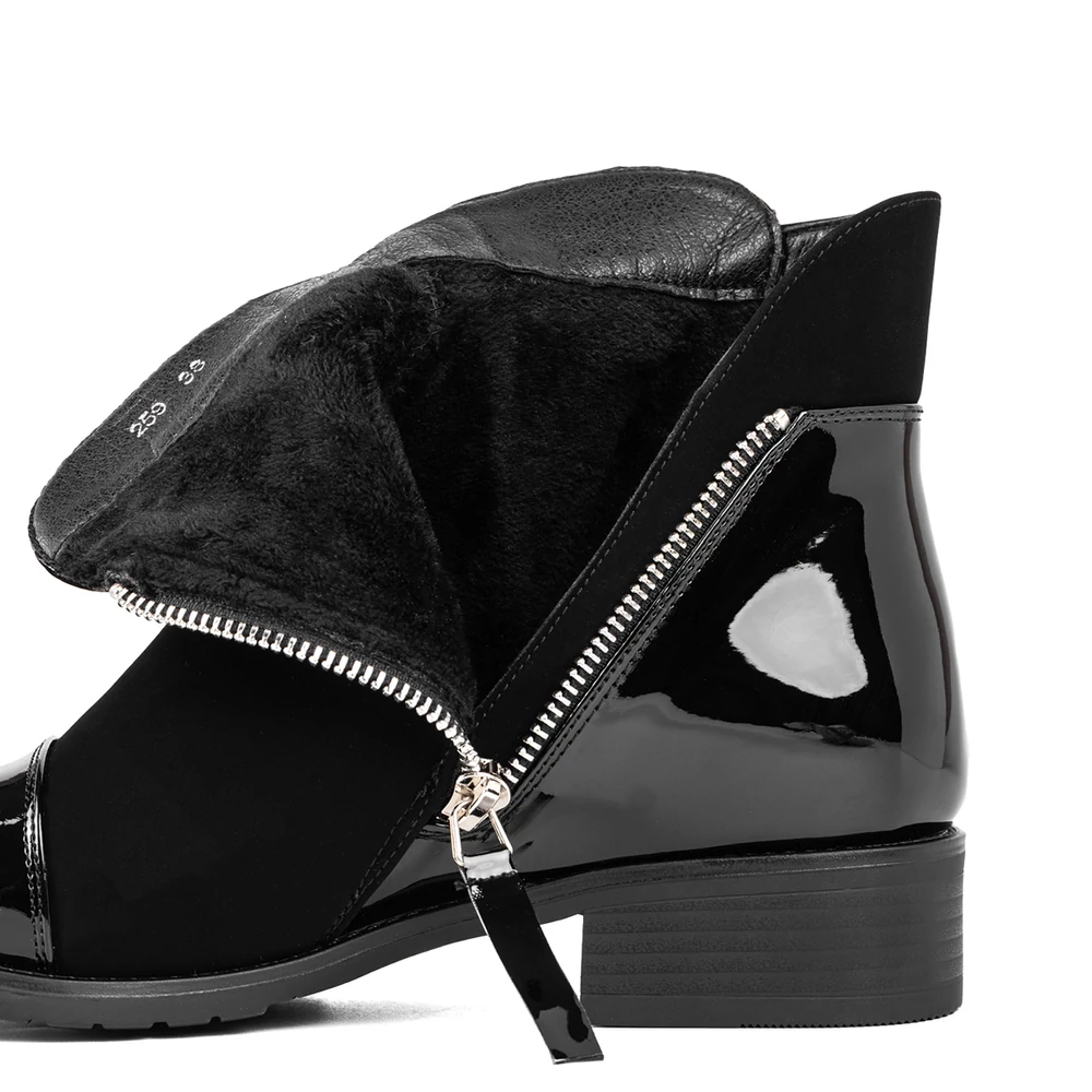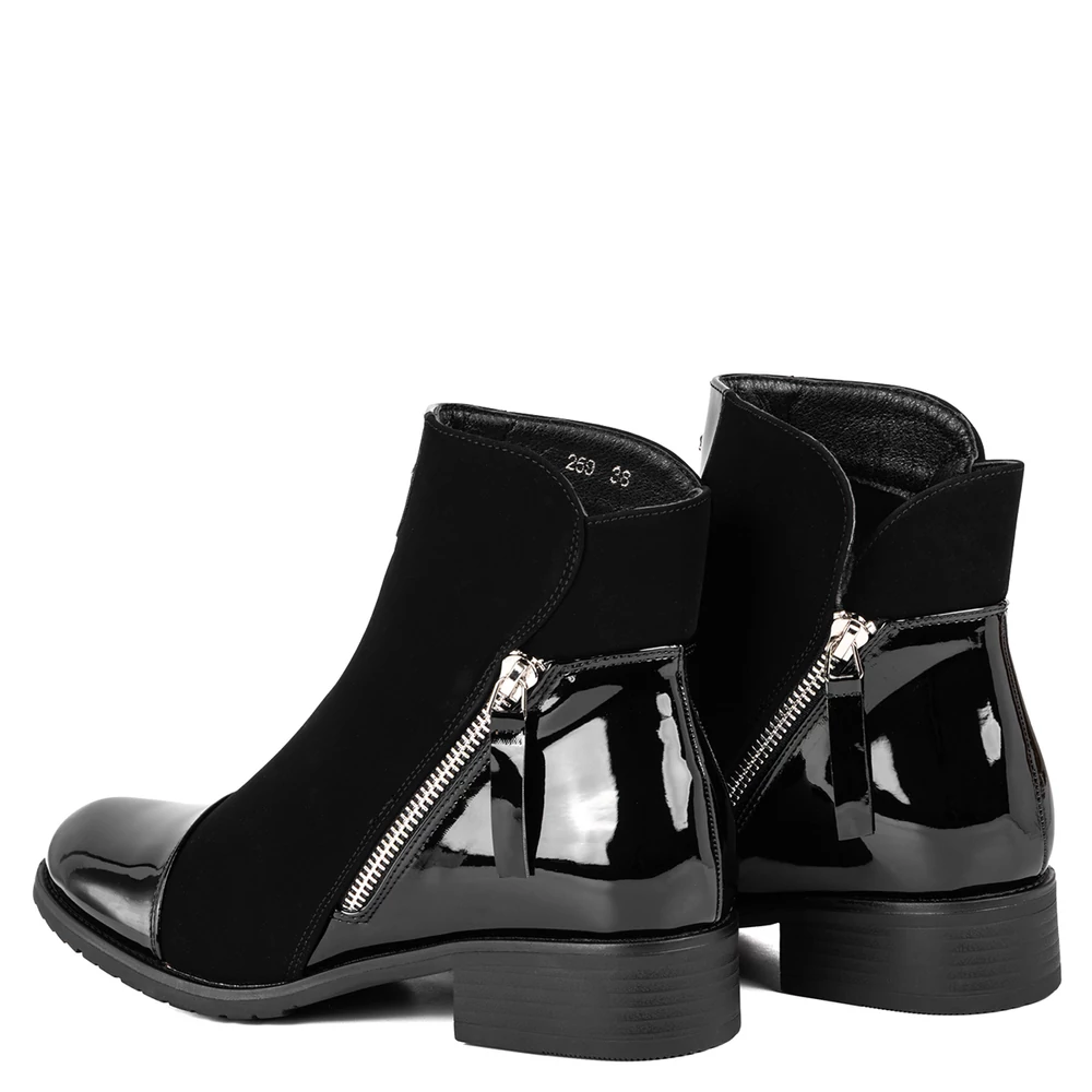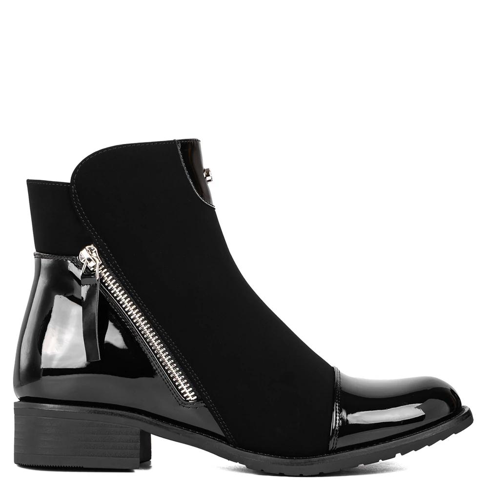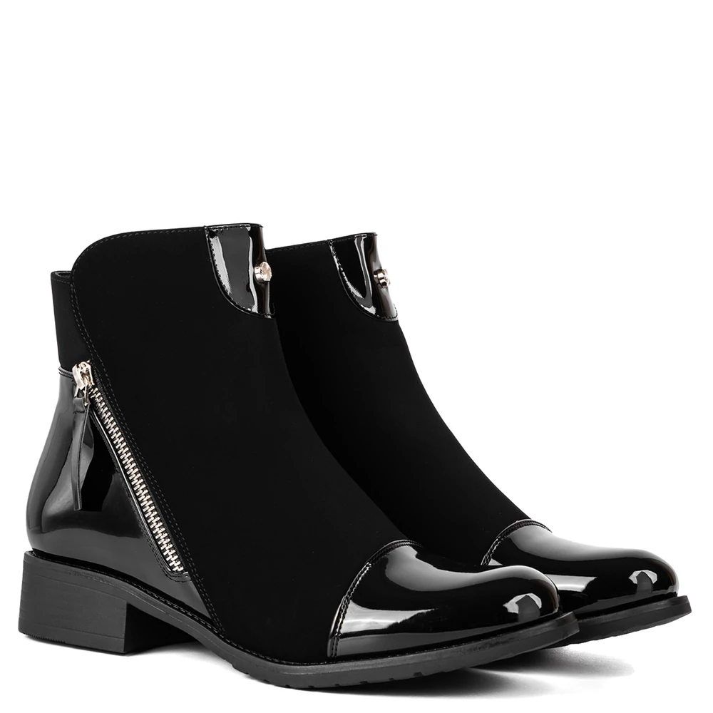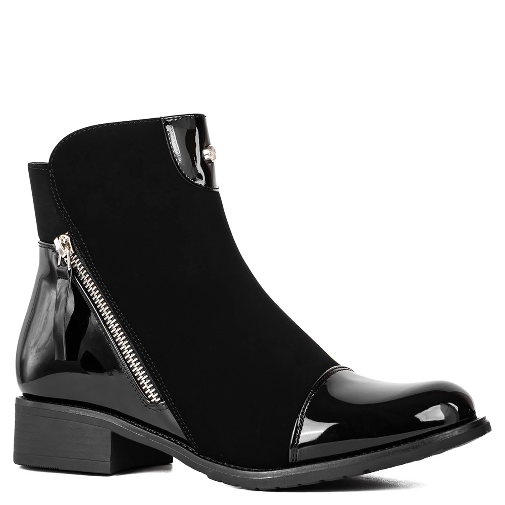 Ez a női bokacsizma elegáns megjelenést és kényelmes viseletet kínál a hűvösebb napokra. A cipő kombinált anyaghasználatával tűnik ki: matt és fényes felületek váltakozása modern, letisztult stílust kölcsönöz. Az oldalsó cipzár nemcsak dekoratív, hanem praktikus is, megkönnyíti a fel- és levételt. Belseje puha, meleg béléssel van ellátva, így ideális választás az őszi-téli szezonban. A stabil, alacsony sarok és a barázdált talp biztos járást garantál, miközben a cipő nőies vonalvezetése minden hétköznapi és elegáns szetthez remekül illeszkedik.