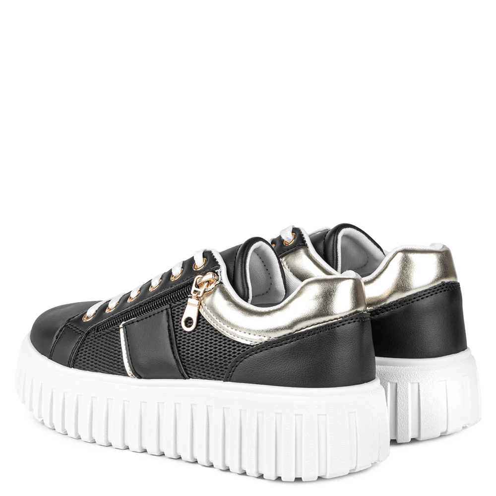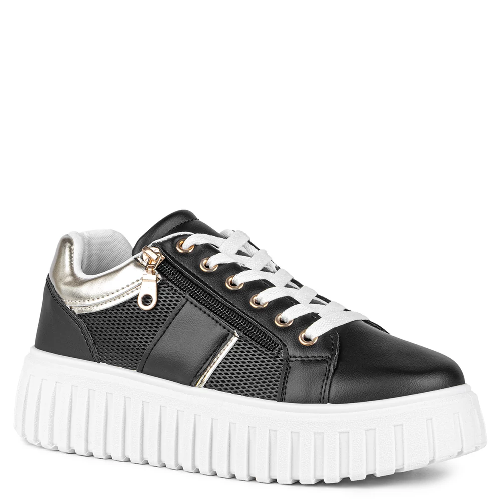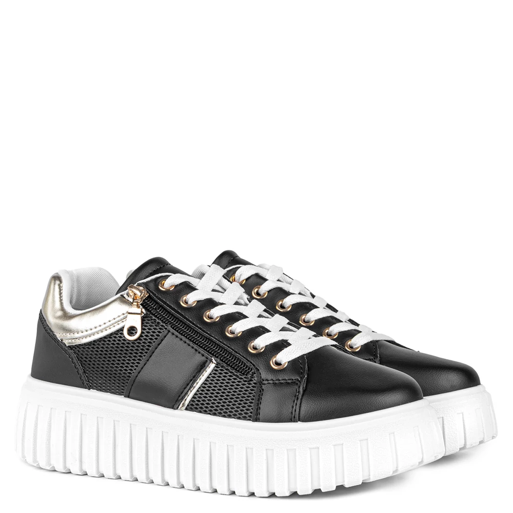 Divatos női sportcipő vastag, karakteres talprésszel, amely egyszerre modern megjelenést és kényelmes viseletet biztosít. A felsőrész kombinált anyagból készült, hálós és sima felületekkel, amelyek jó szellőzést és tartósságot adnak. A masszív, bordázott talp csúszásmentes járást tesz lehetővé, így ideális választás a mindennapi rohanásban is. Ha modern, platformtalpú sneaker után keresel, amely ötvözi a kényelmet és a divatos megjelenést, ez a modell biztosan beválik.