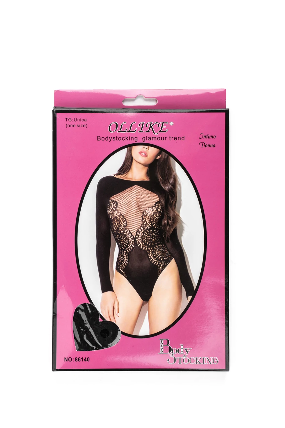 Ollike Fekete Áttetsző Csipke Bodystocking Csillogó Kövekkel