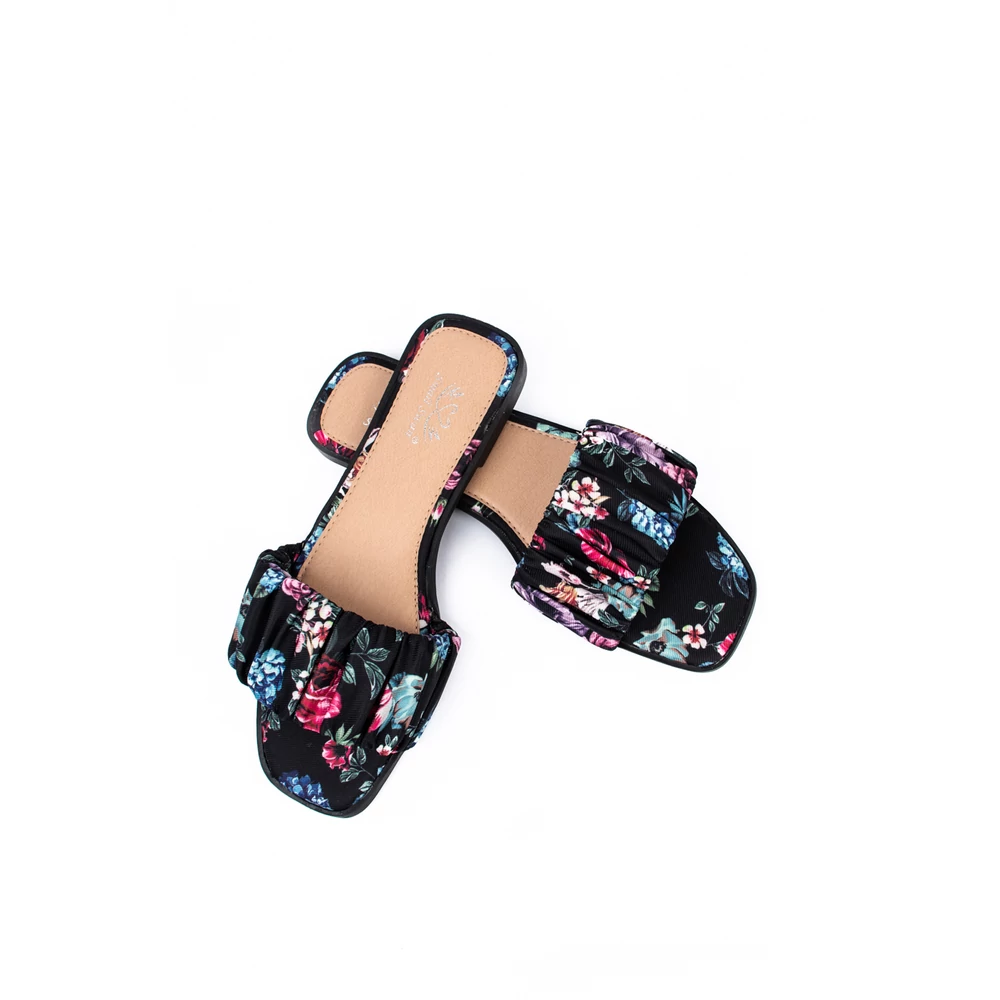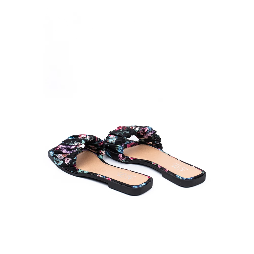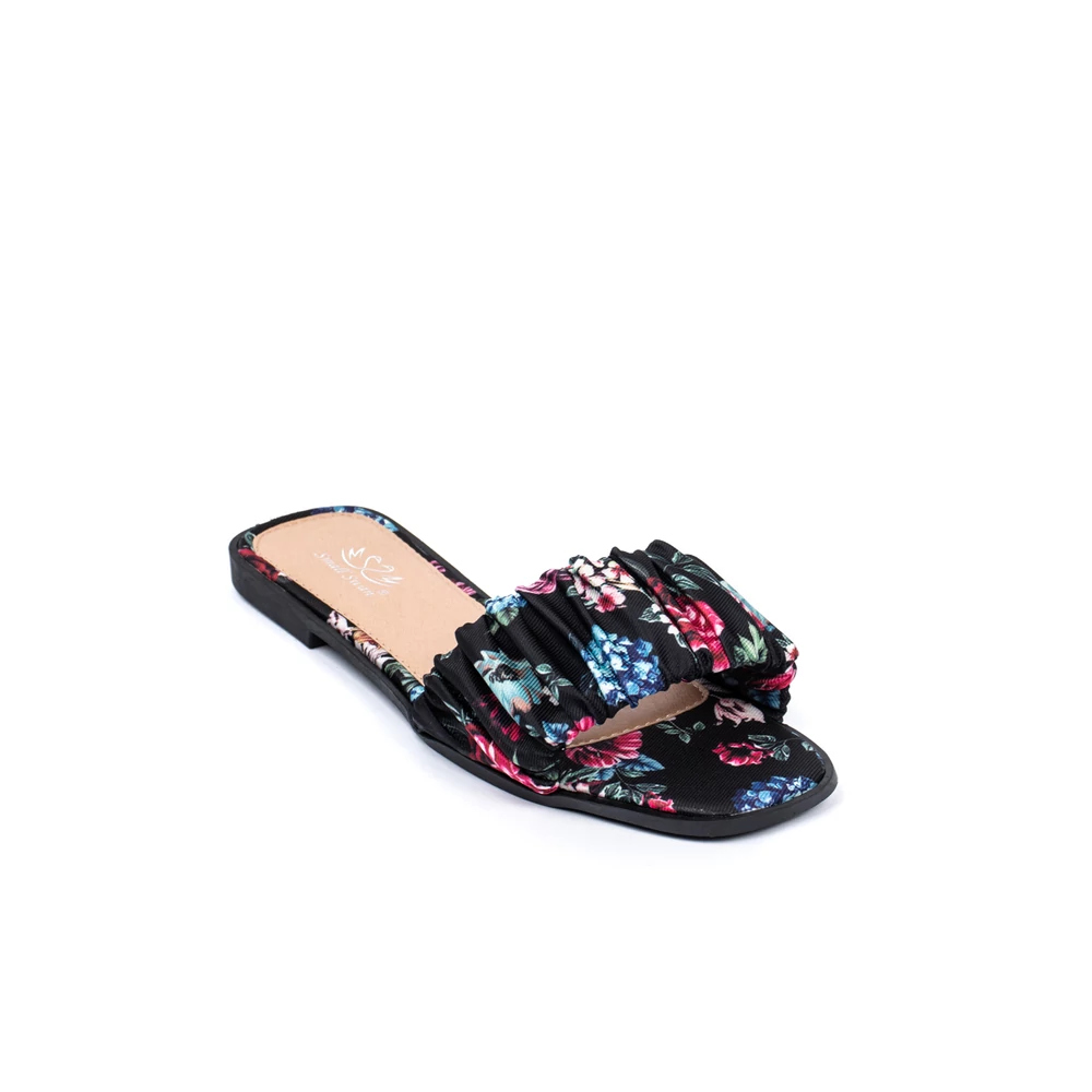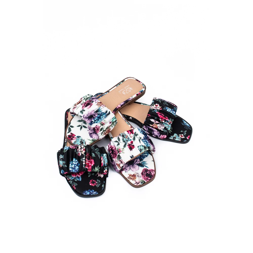 Elegáns, egyben vidám hangulatú, virág mintával díszített női papucs a nyári szezonra, egyszerű kivitelezéssel.