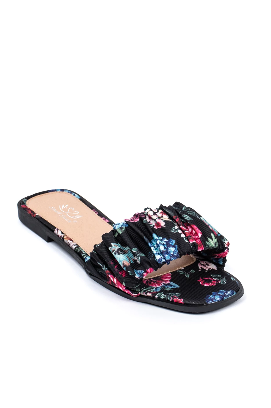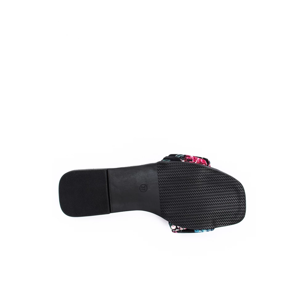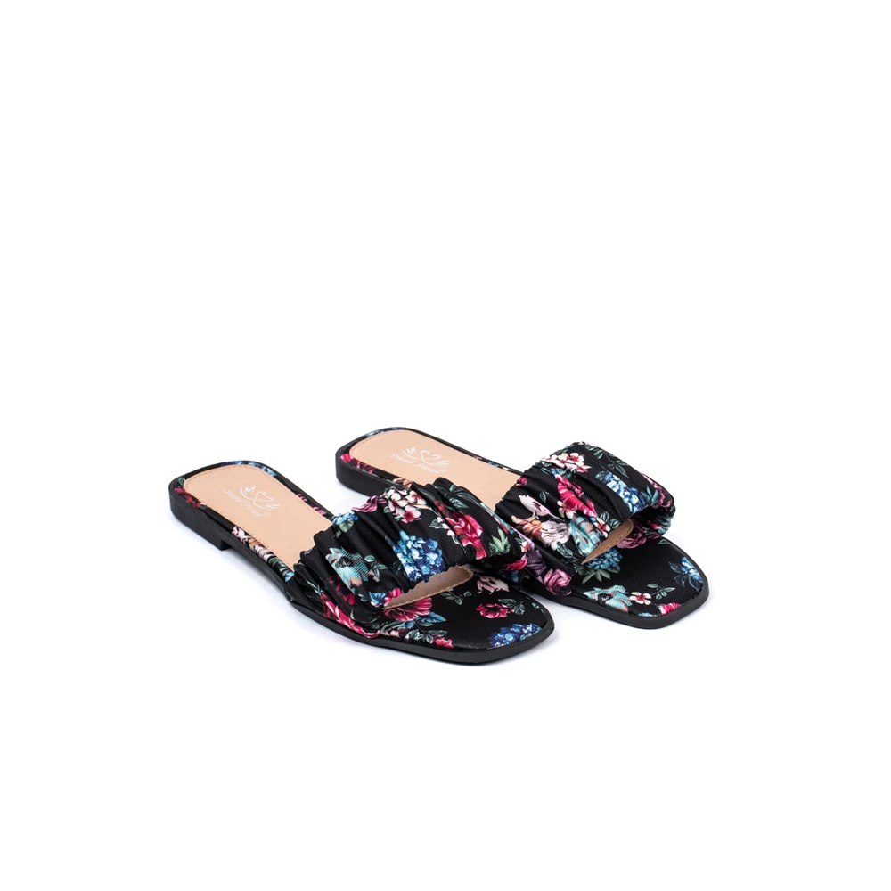 Elegáns, egyben vidám hangulatú, virág mintával díszített női papucs a nyári szezonra, egyszerű kivitelezéssel.