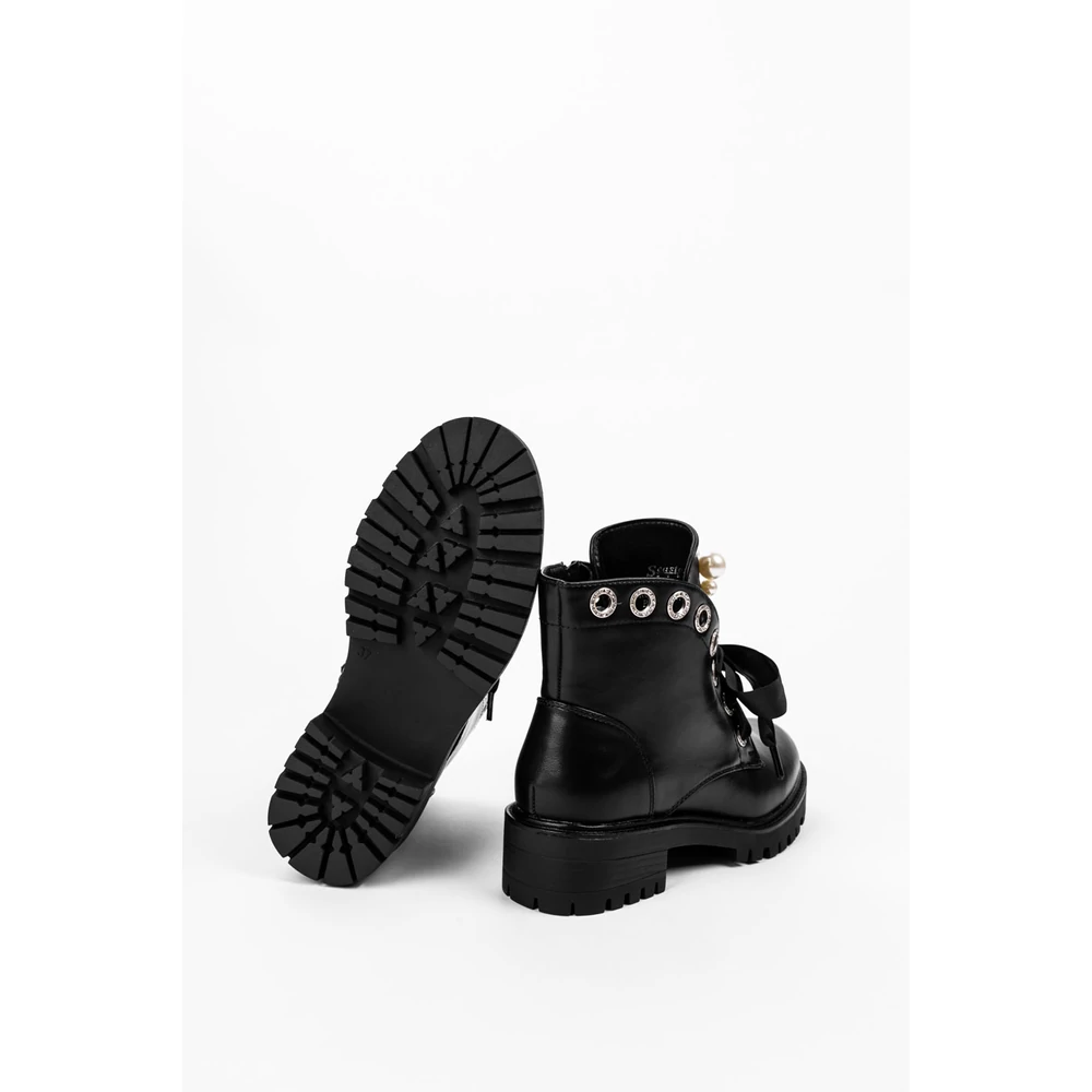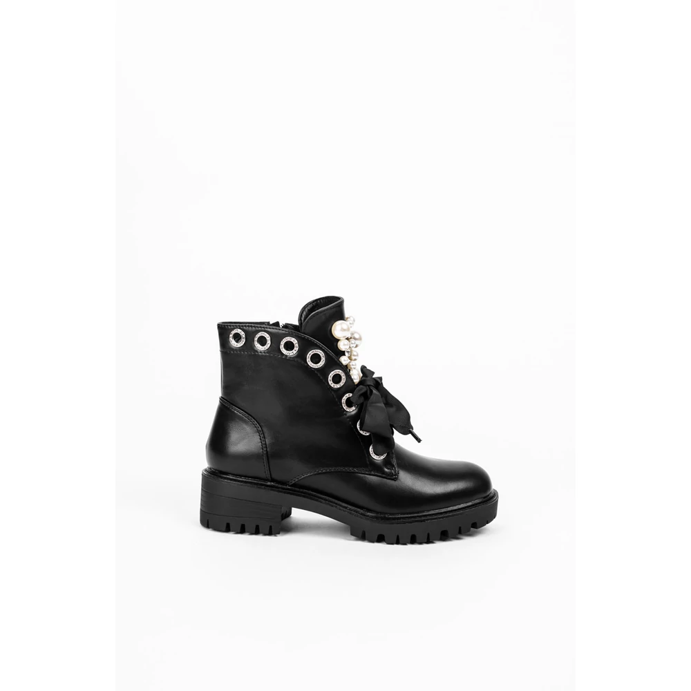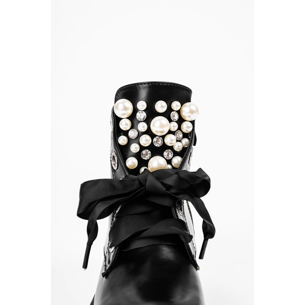 Stílusos, gyöngyökkel és strasszkövekkel díszített bakancs, amely tökéletesen feldobja az őszi és téli hétköznapokat. Műbőr anyagú lábbeli, melyet vastag fűző ékesít az elején.