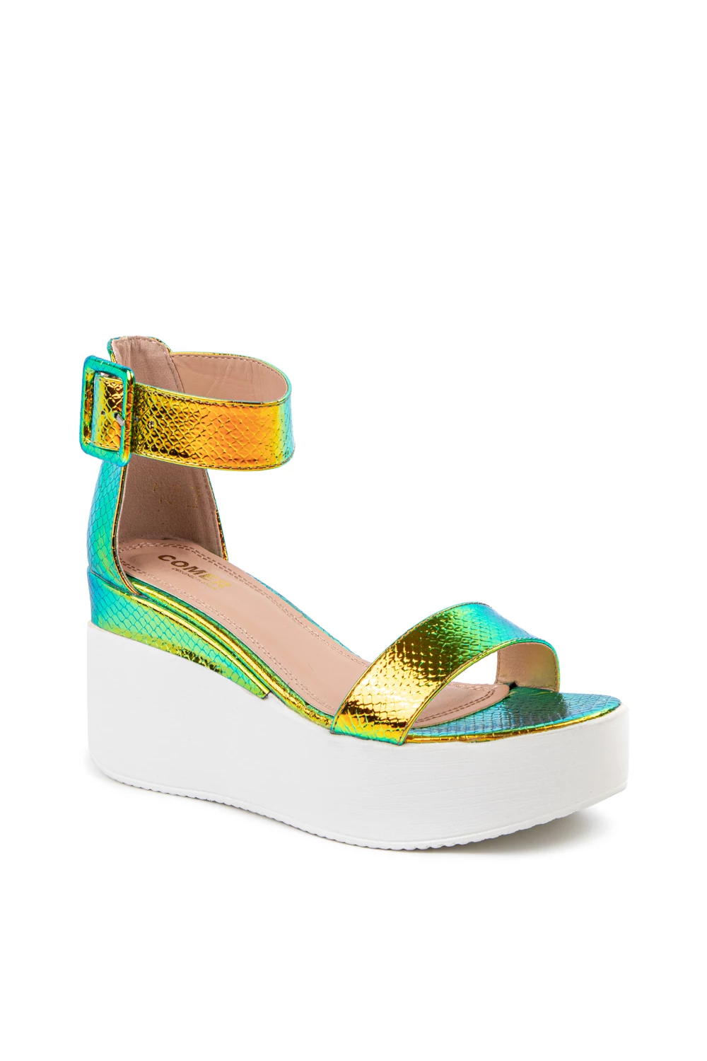 Divatos műbőr telitalpú csatos hologram színű szandál. Randevúkra és városnézéshez vonzó és egyben trendi megjelenést ad. Kiváló választás!