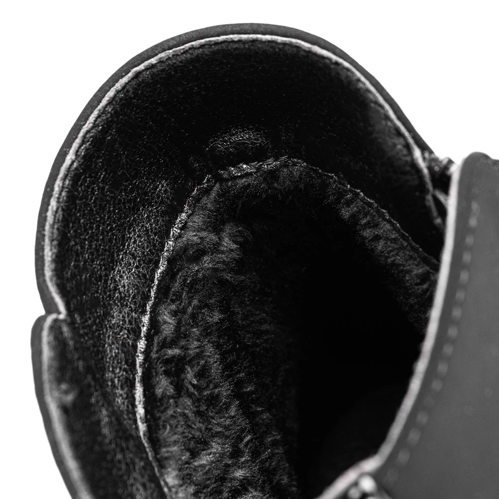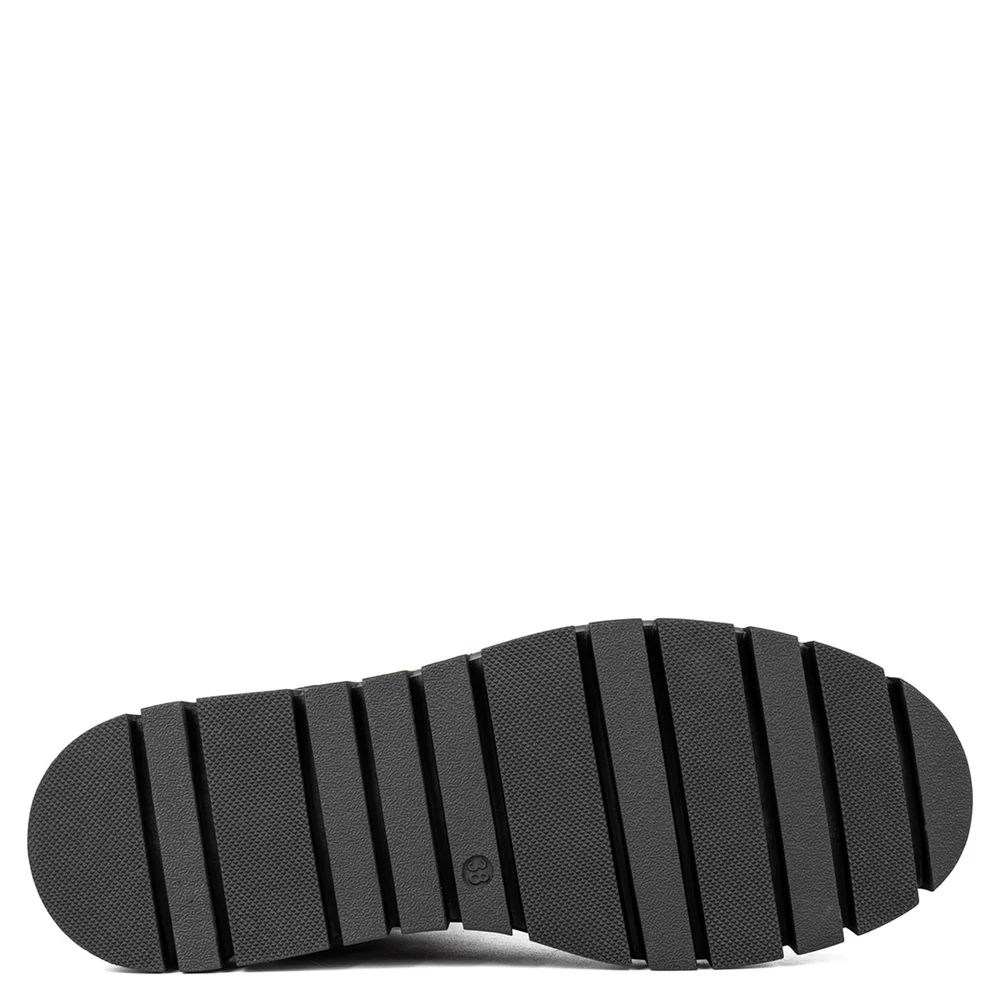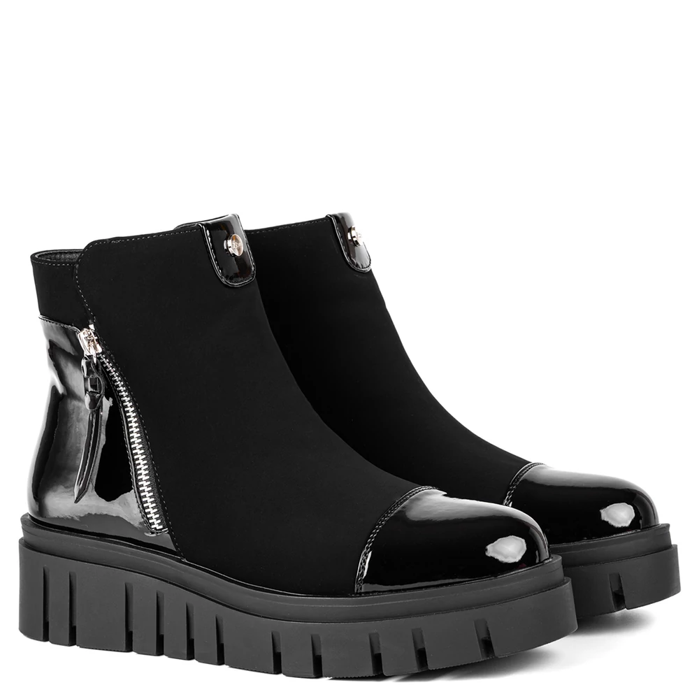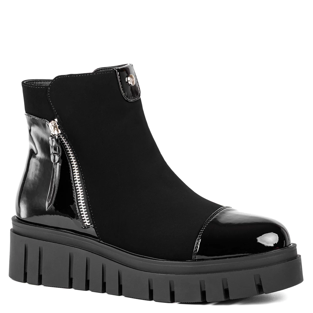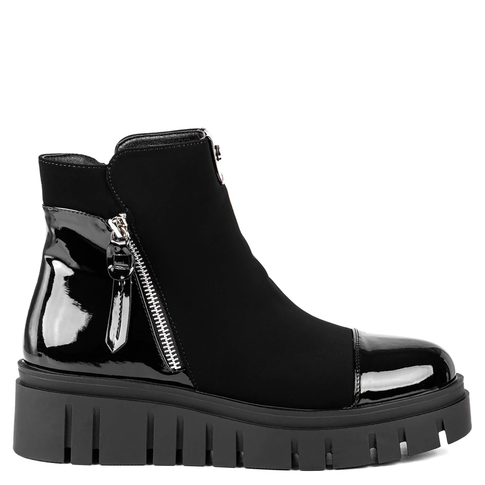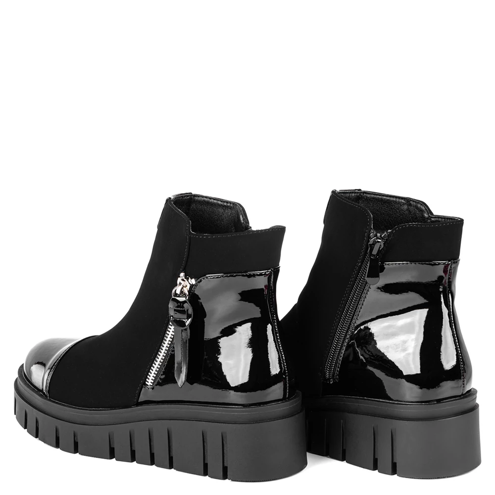 Letisztult formavilágú, mégis figyelemfelkeltő női bokacsizma, amely a fényes lakkrészleteknek és a robusztus platform talpnak köszönhetően különleges megjelenést biztosít. A felsőrész fényes és matt anyagok kombinációjából épül fel, amely modern, városi stílust képvisel. Az oldalsó cipzár és a dekoratív fémhatású részletek nemcsak esztétikai szerepet töltenek be, hanem megkönnyítik a felvételt is. Belseje puha, meleg béléssel van ellátva, amely komfortossá teszi a hidegebb napokon is. A vastag, barázdált talp stabil járást és jó tapadást biztosít.