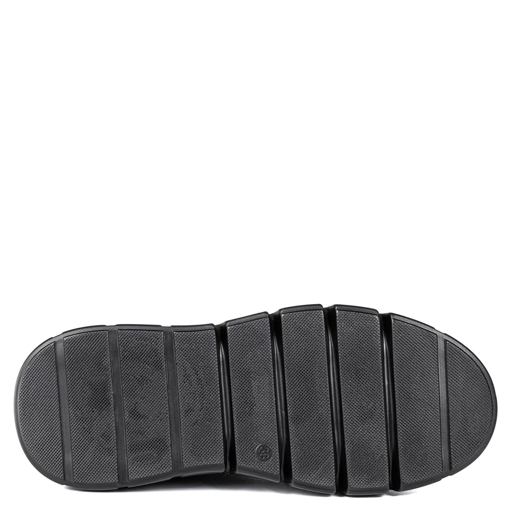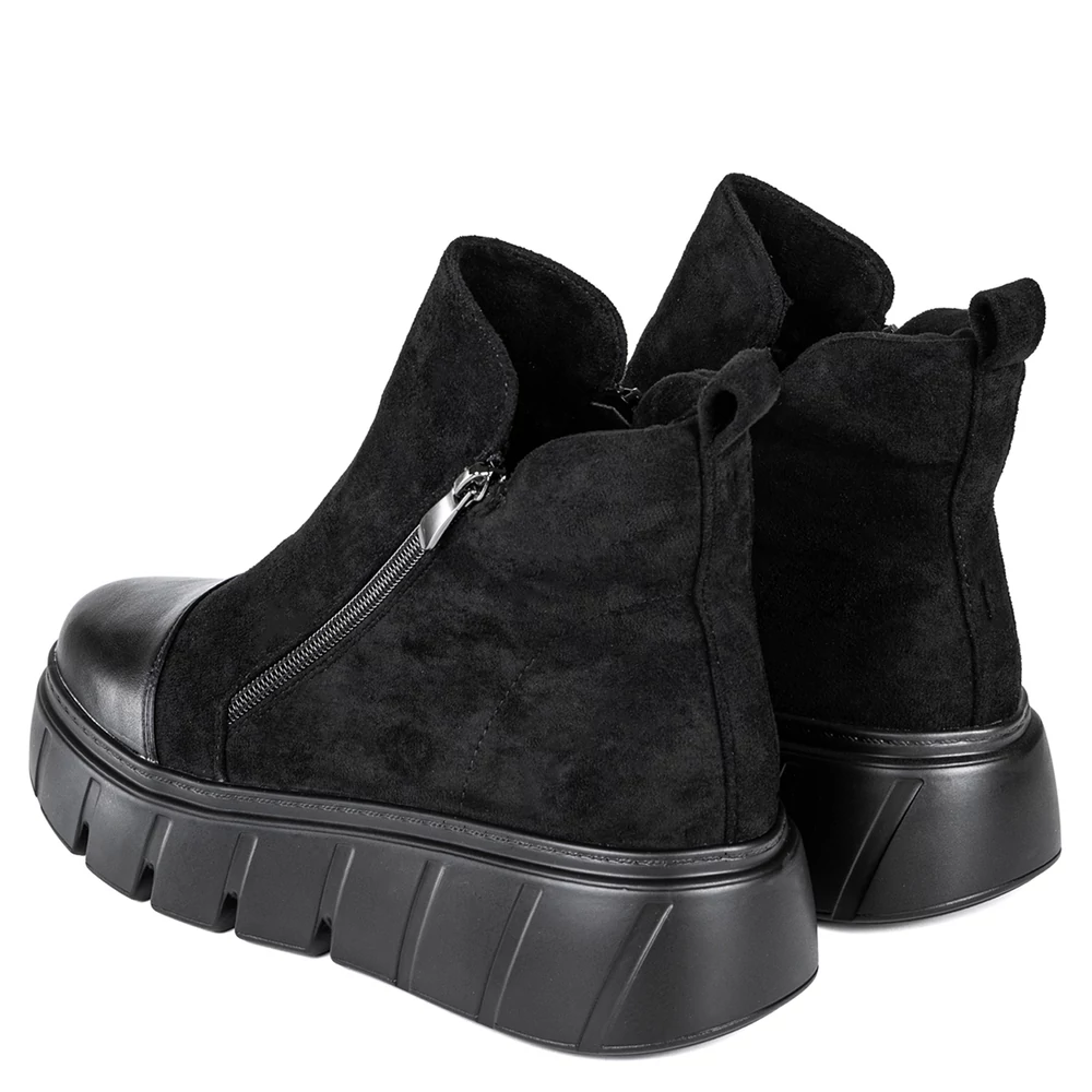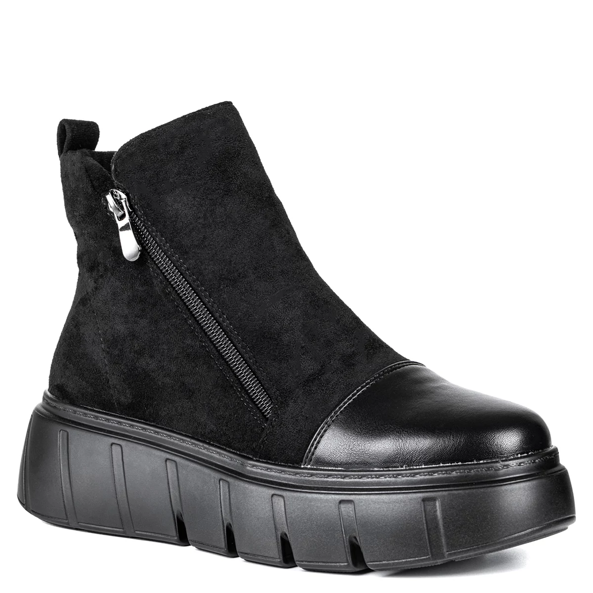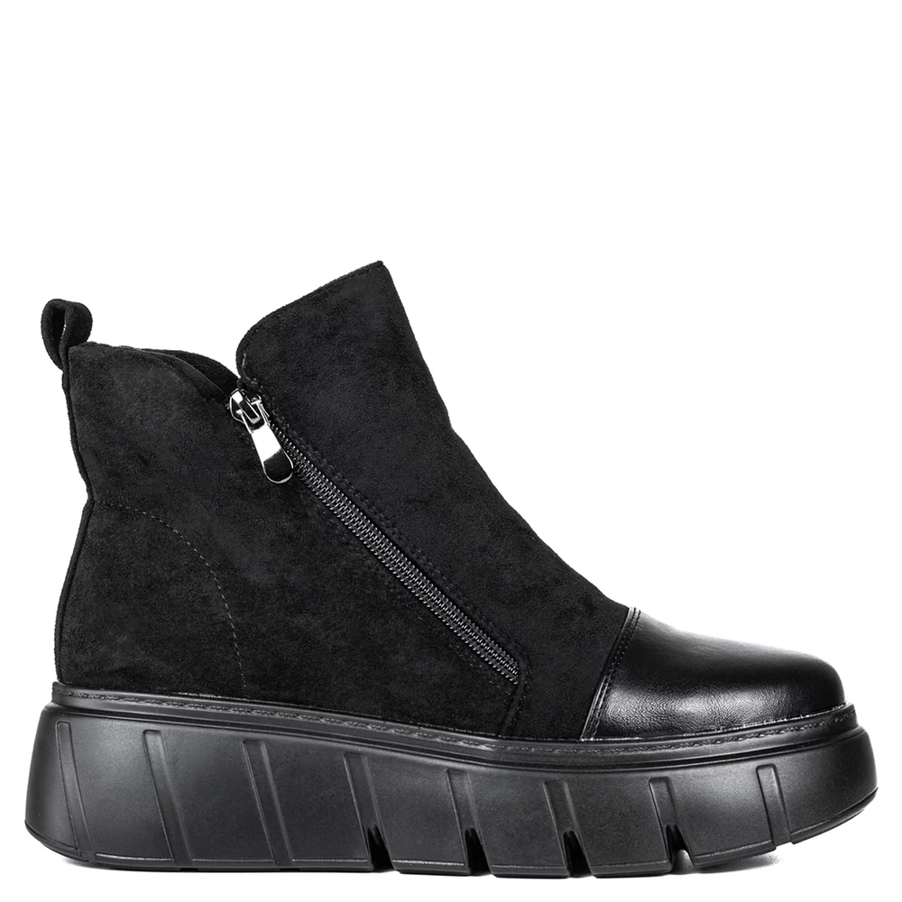 Letisztult formavilágú, mégis figyelemfelkeltő női bokacsizma, amely a robusztus platform talpnak köszönhetően különleges megjelenést biztosít. Az oldalsó cipzár és a dekoratív fémhatású részletek nemcsak esztétikai szerepet töltenek be, hanem megkönnyítik a felvételt is. Belseje puha, meleg béléssel van ellátva, amely komfortossá teszi a hidegebb napokon is. A vastag, barázdált talp stabil járást és jó tapadást biztosít.