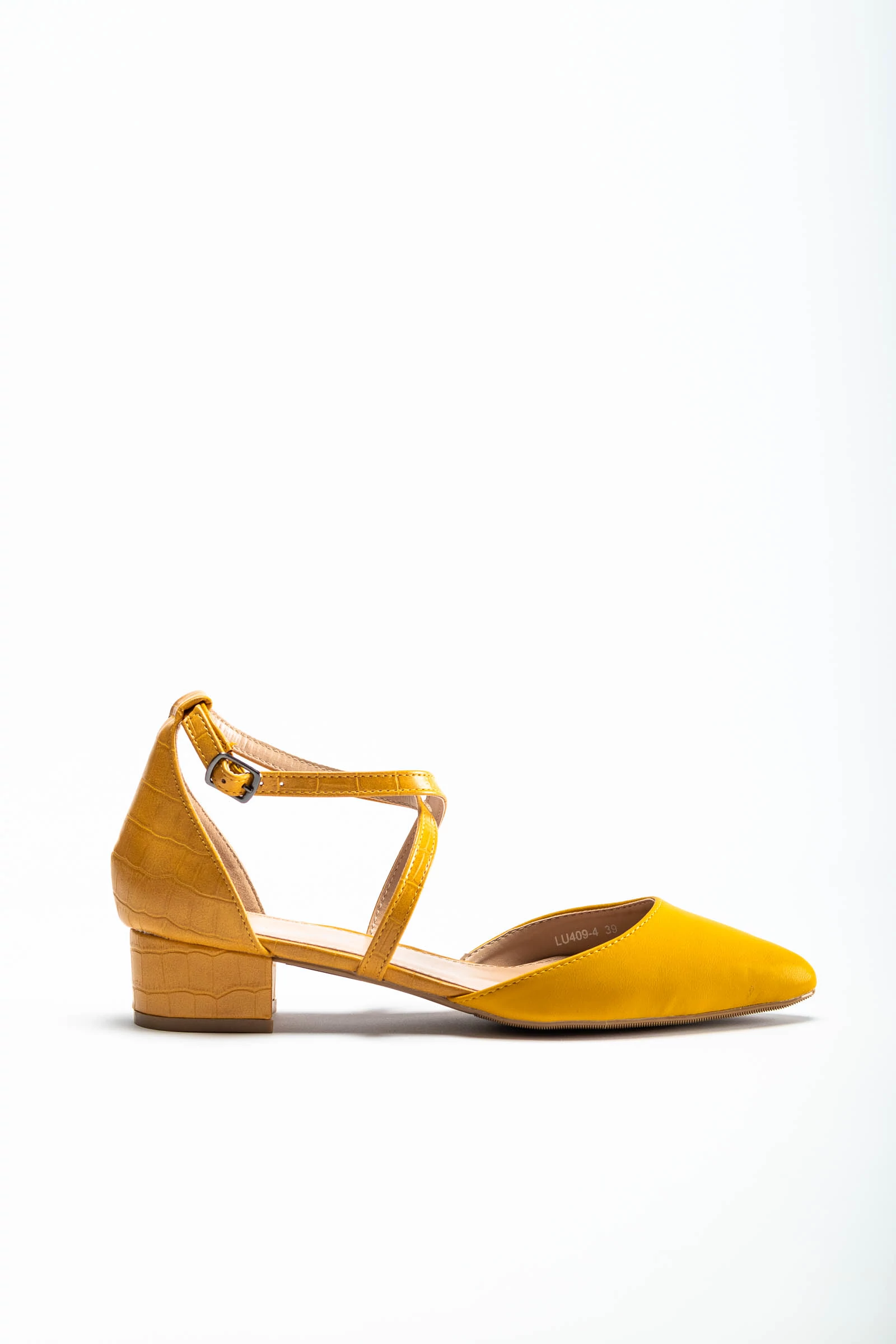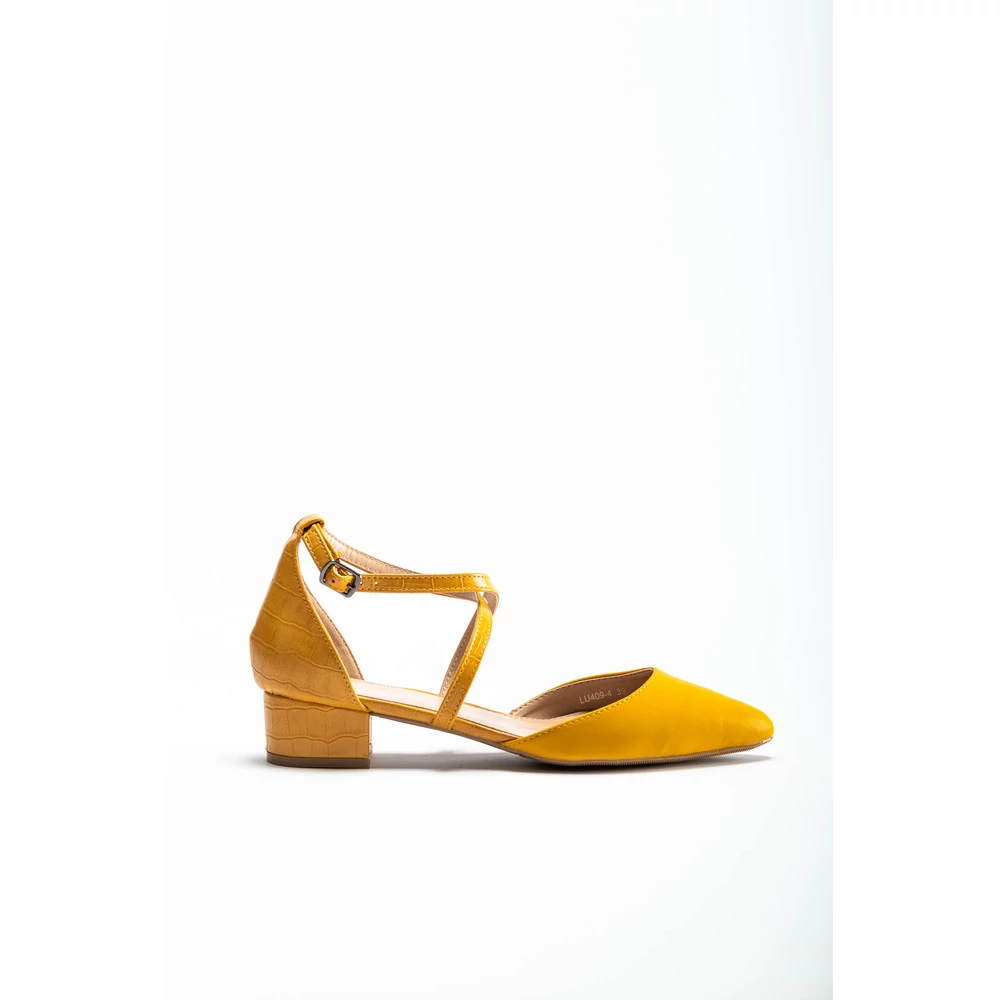 Elegáns, letisztult, műbőr, a sarkánál dombornyomott mintával ellátott, keresztpántos, hegyes orrú cipő. Kiváló választás lehet nyári, alkalmi megjelenéshez.