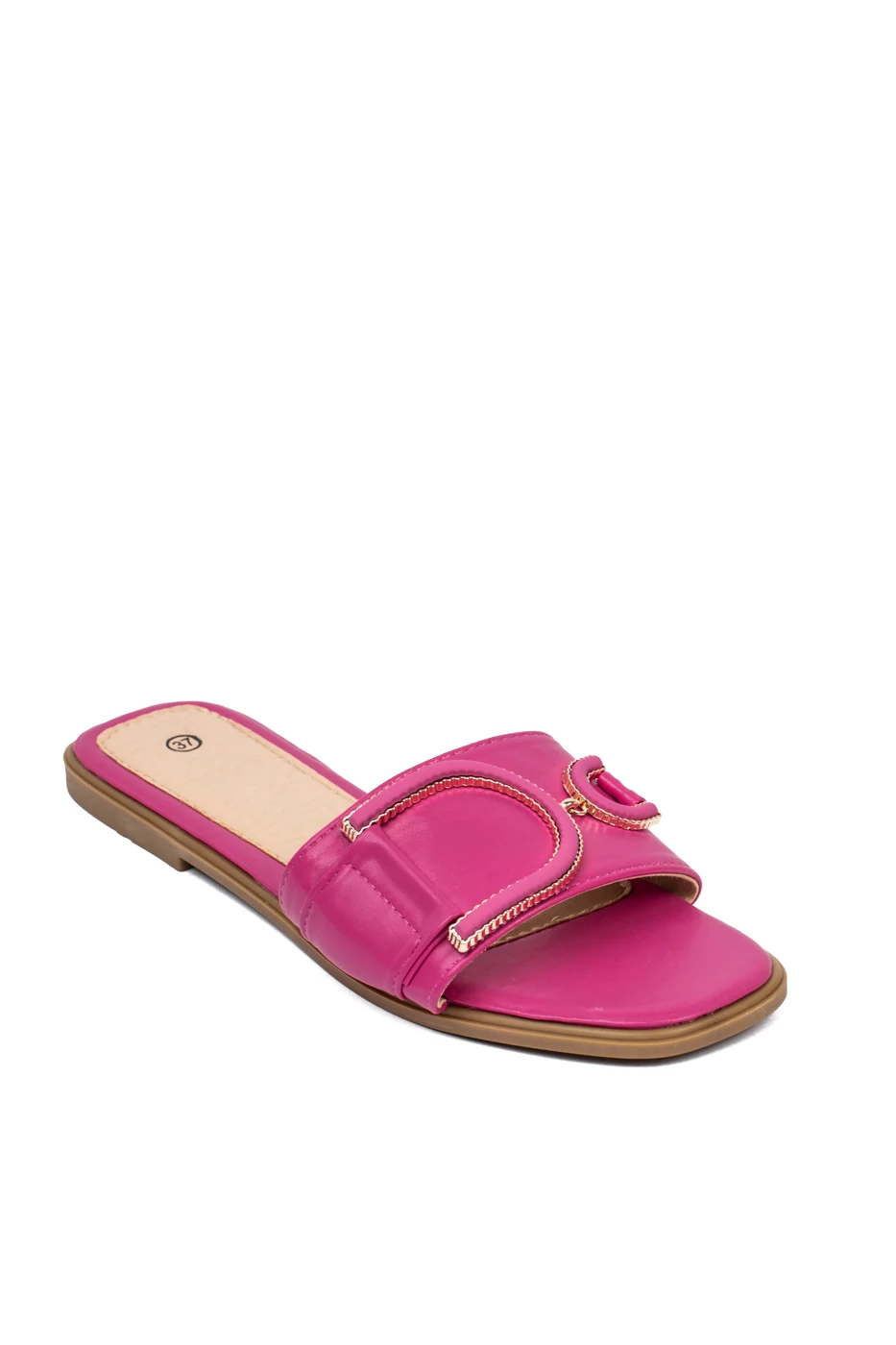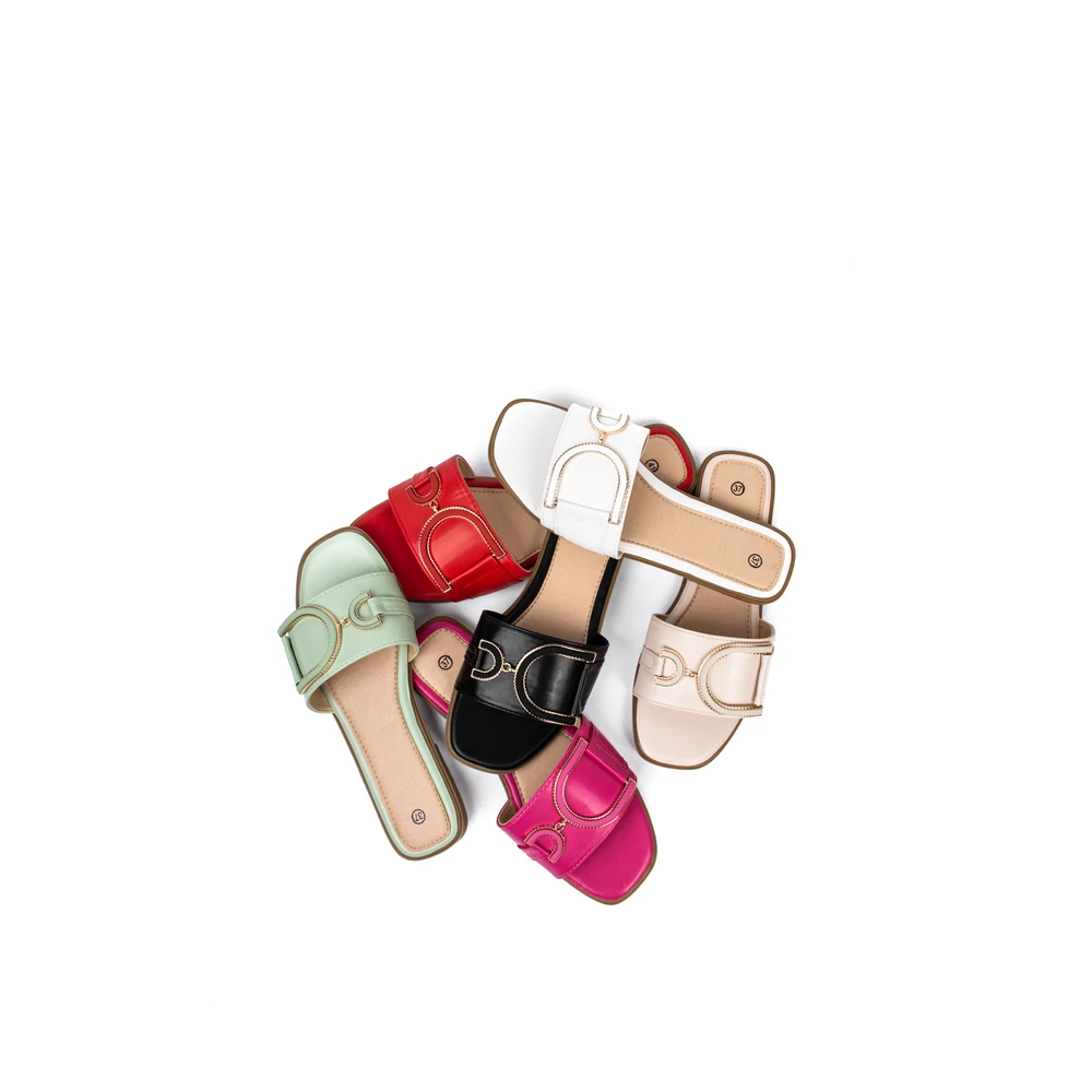 Letisztult stílusú, arany színű szegéllyel díszített női papucs, a forró nyári szezonra.