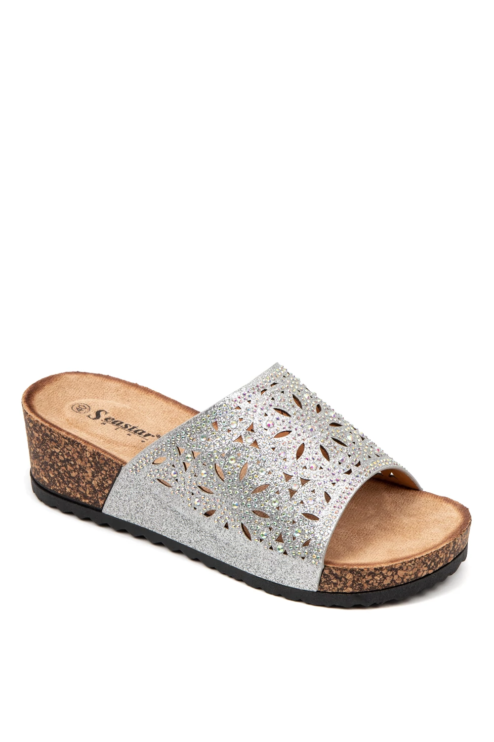 Díszes, lyukacsos műbőr anyagból készült női papucs a nyári szezonra, melyet csillogó színes strasszkövek ékesítenek.