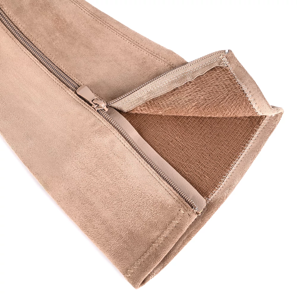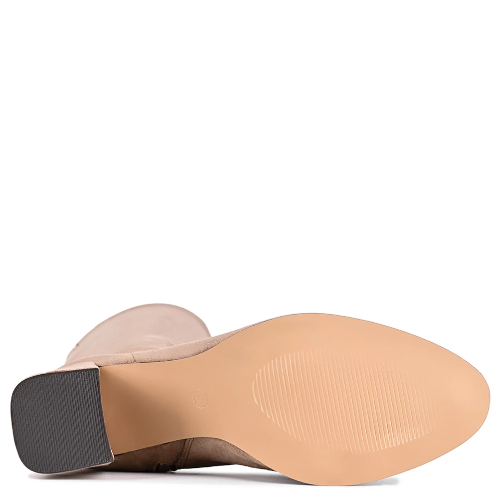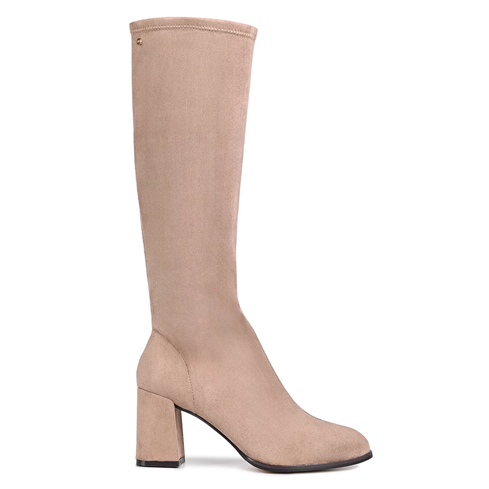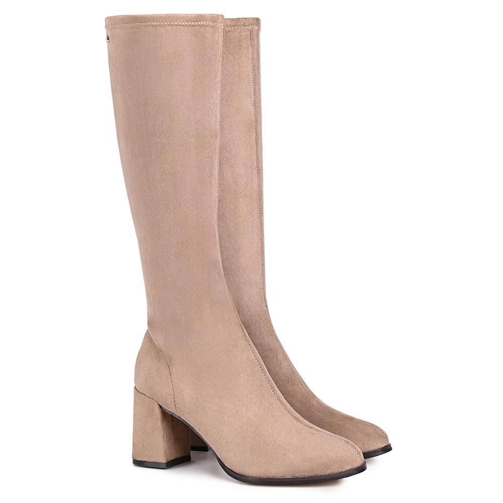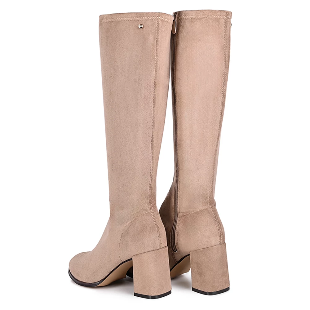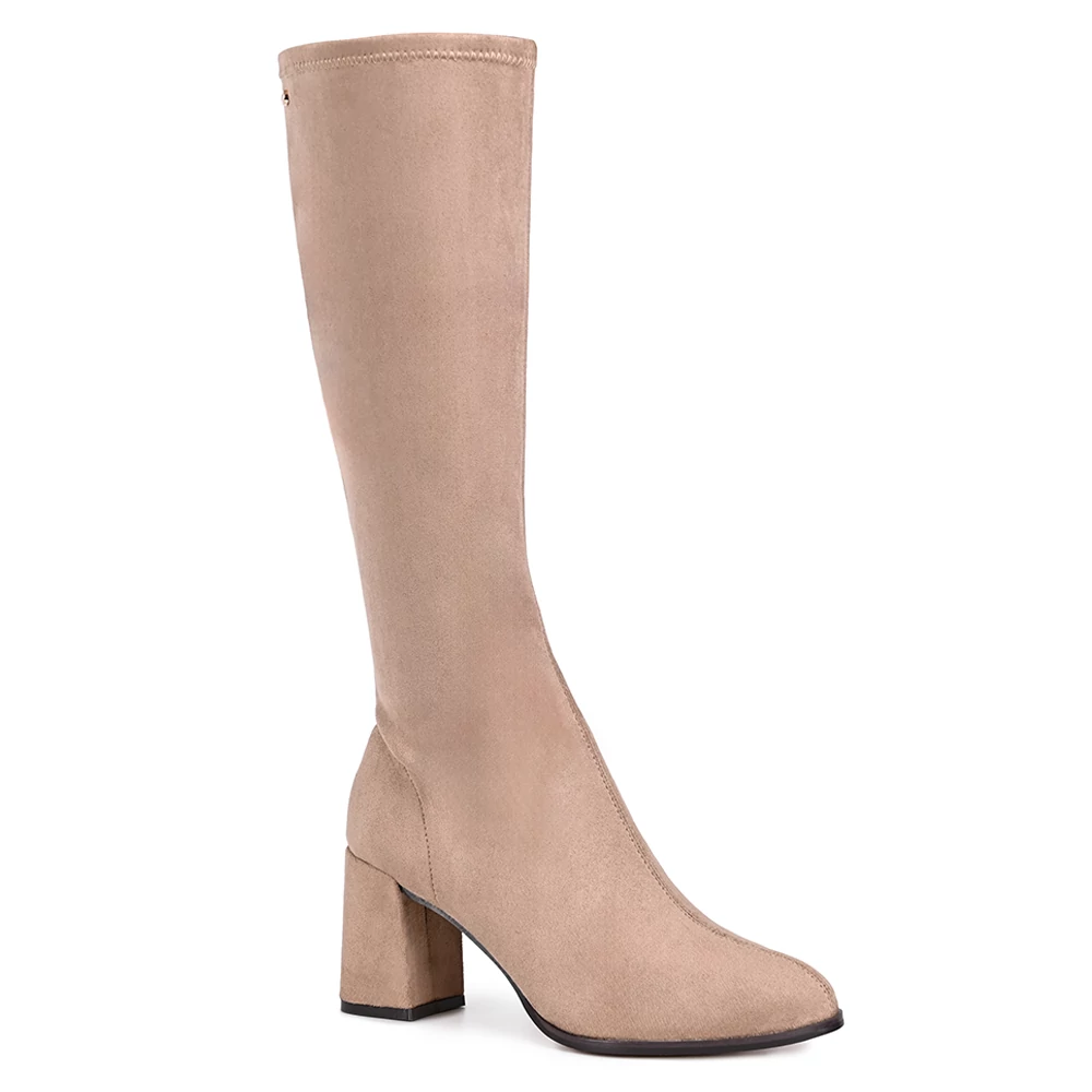Térd alá érő, klasszikus fazonú magasszárú csizma, amely elegáns megjelenését a letisztult vonalvezetésnek és a puha hatású anyaghasználatnak köszönheti. Belső oldalán cipzárral záródik, így könnyen fel- és levehető. Stabil, közepes magasságú, vastag sarokkal készült, amely kényelmes járást biztosít a mindennapokban. A belső rész enyhén bélelt, ezáltal a hűvösebb napokon is kellemes viseletet nyújt. Sokoldalúan kombinálható darab, amely elegáns és hétköznapi öltözékhez egyaránt jól illeszkedik.