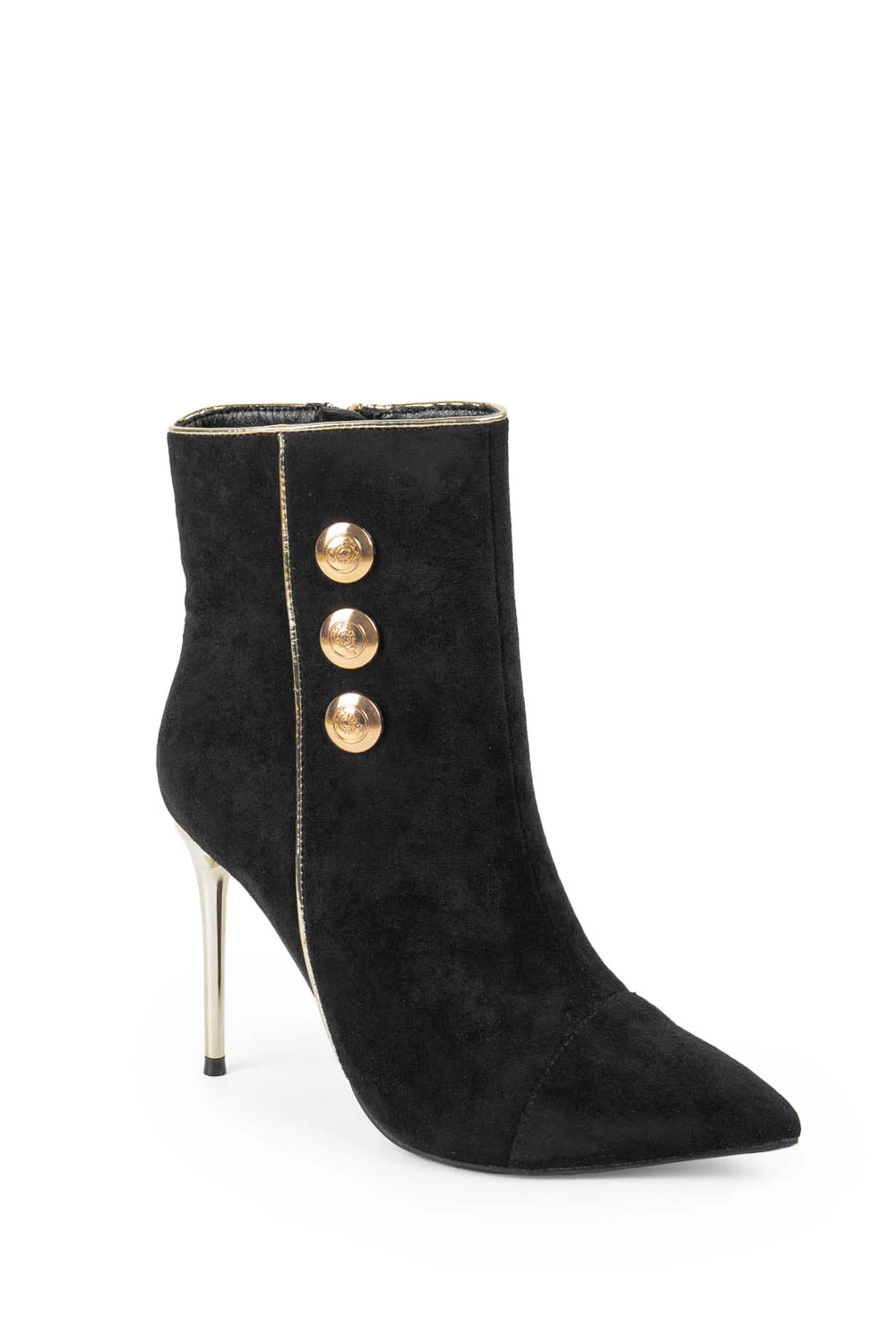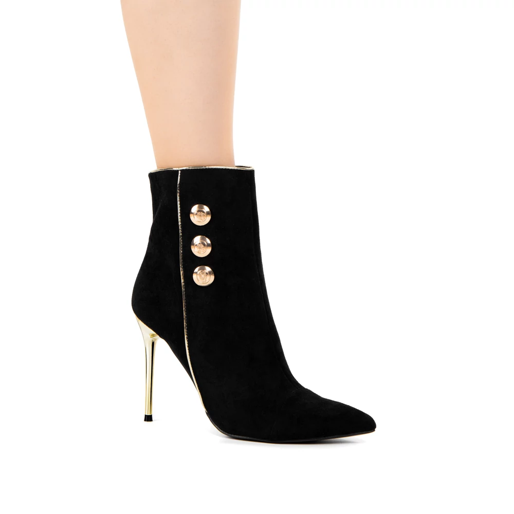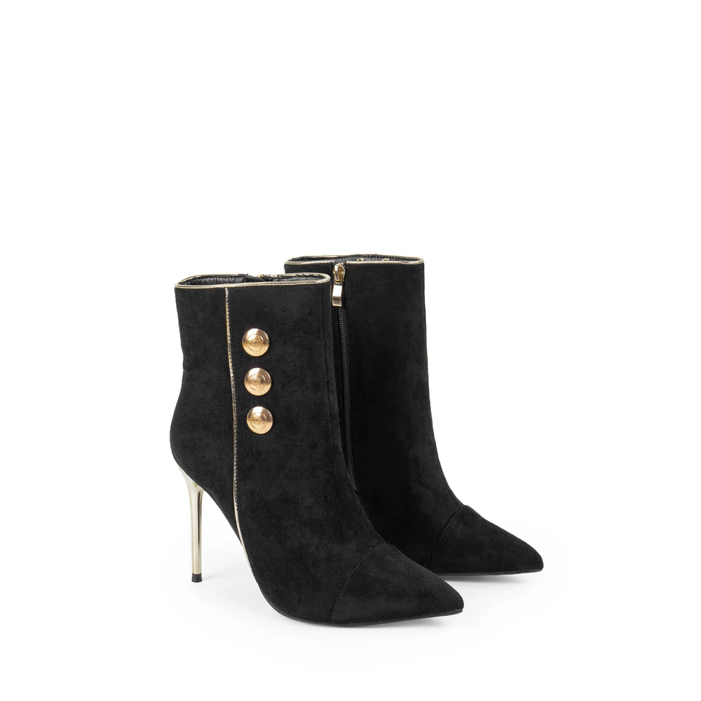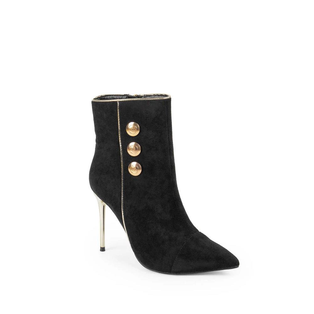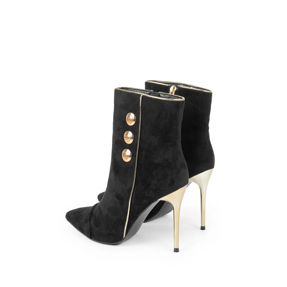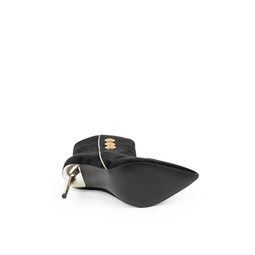 Elegáns, fekete velúr bokacsizma, melynek tűsarkú és hegyes orra nőies vonalat kölcsönöz. Az arany színű sarokrész és három arany gomb a csizma oldalán hangsúlyozzák a stílust, míg a praktikus cipzár a másik oldalon segíti a könnyű fel- és levételt.