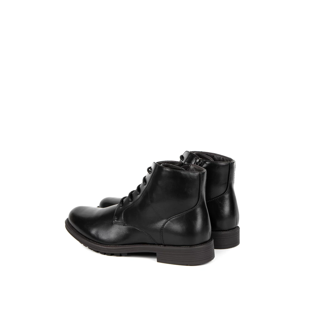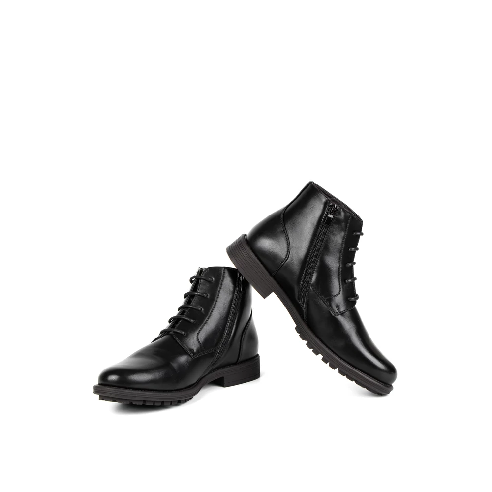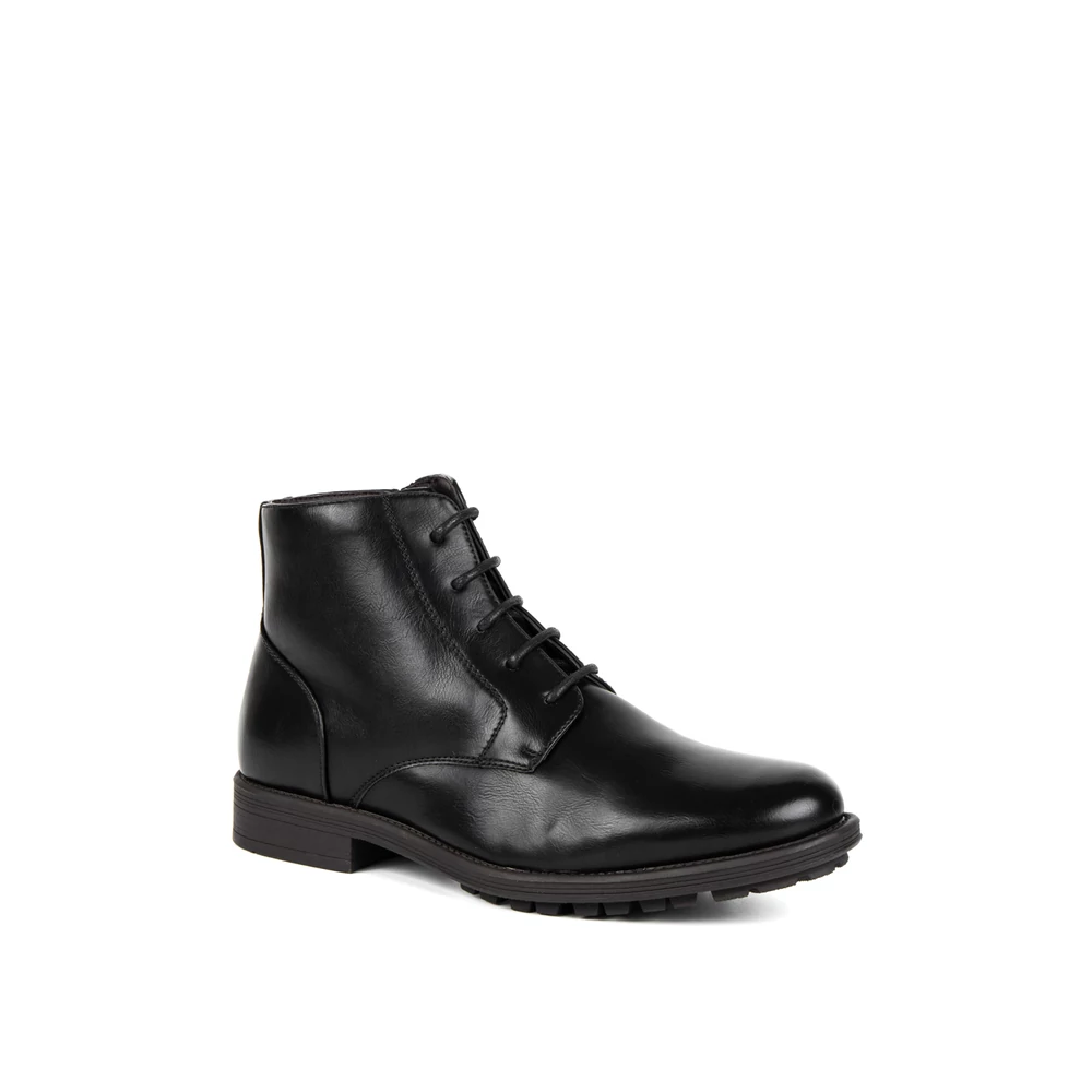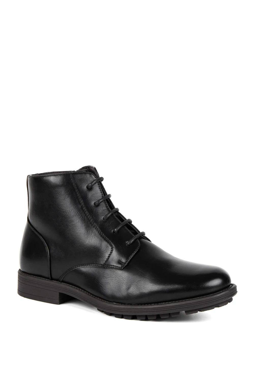 Zárt, cipzáras és fűzős műbőrből készült férfi bakancs. Erős és gumírozott talpának köszönhetően biztonságos a használata.