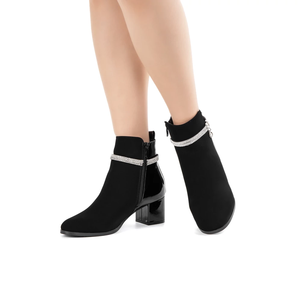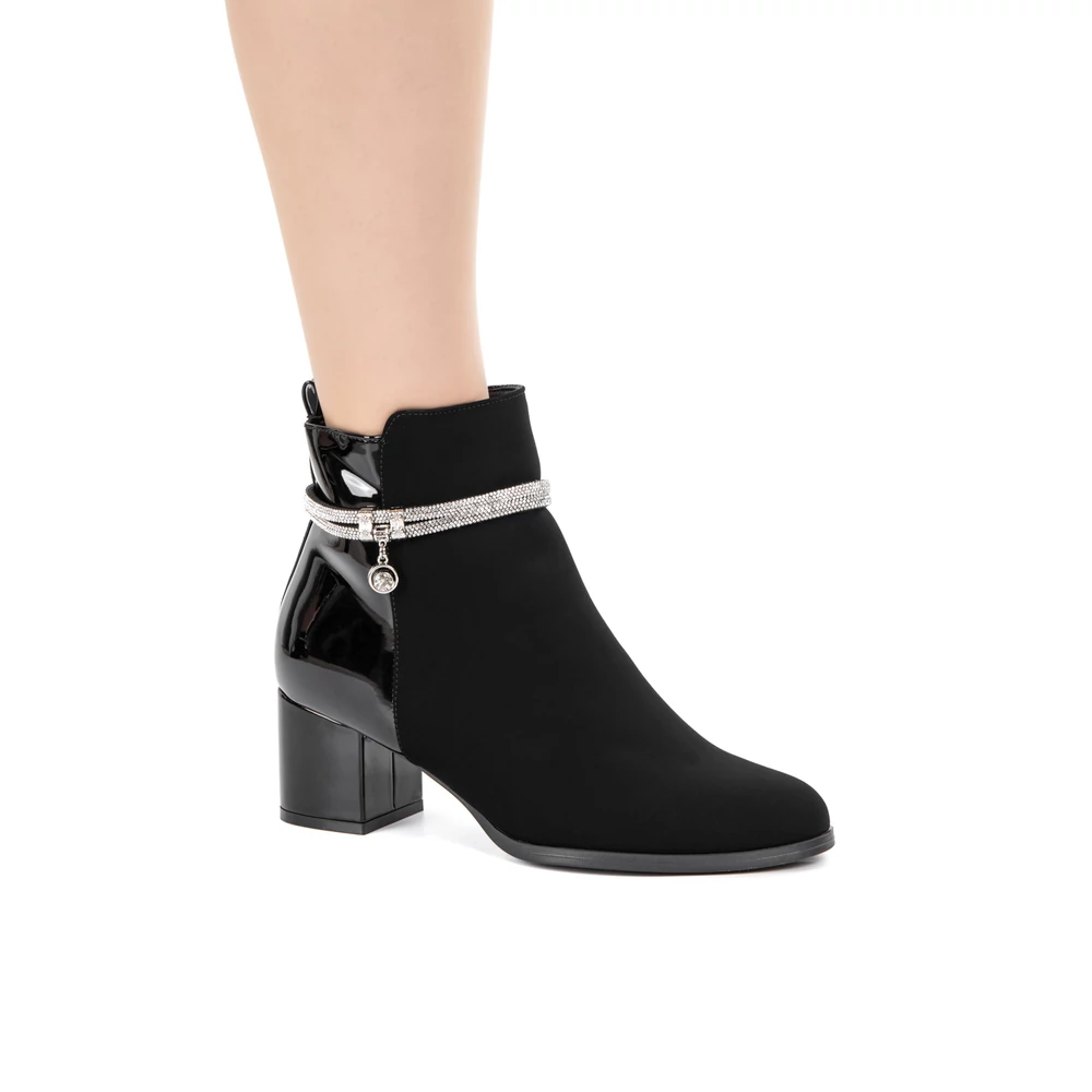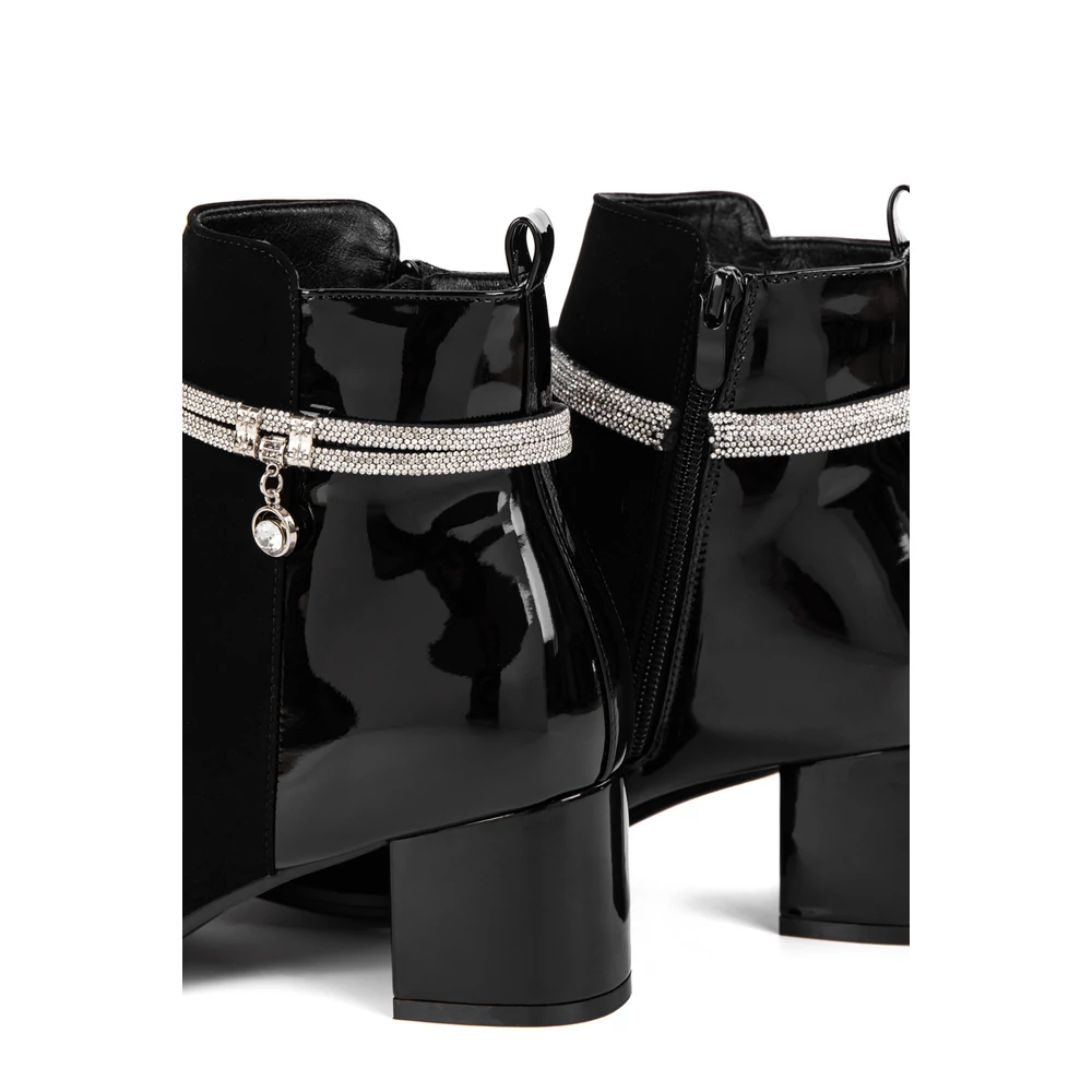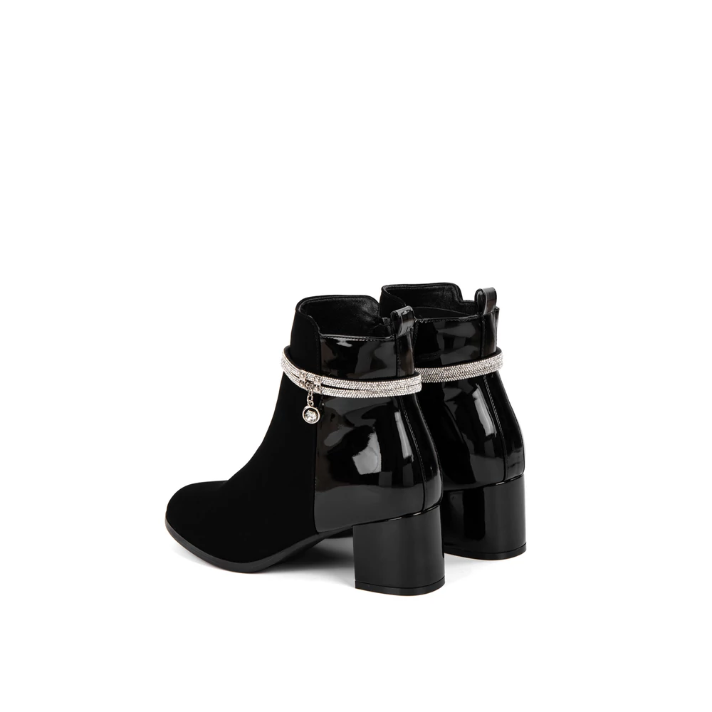 Kialakítása során nagy hangsúlyt kapott a változatosság, hiszen két különböző anyagból áll: művelúr és lakk betétek találhatók rajta. A boka részén körbe strasszköves díszítés teszi igazán elegánssá, így alkalomra is megfelelő választás.