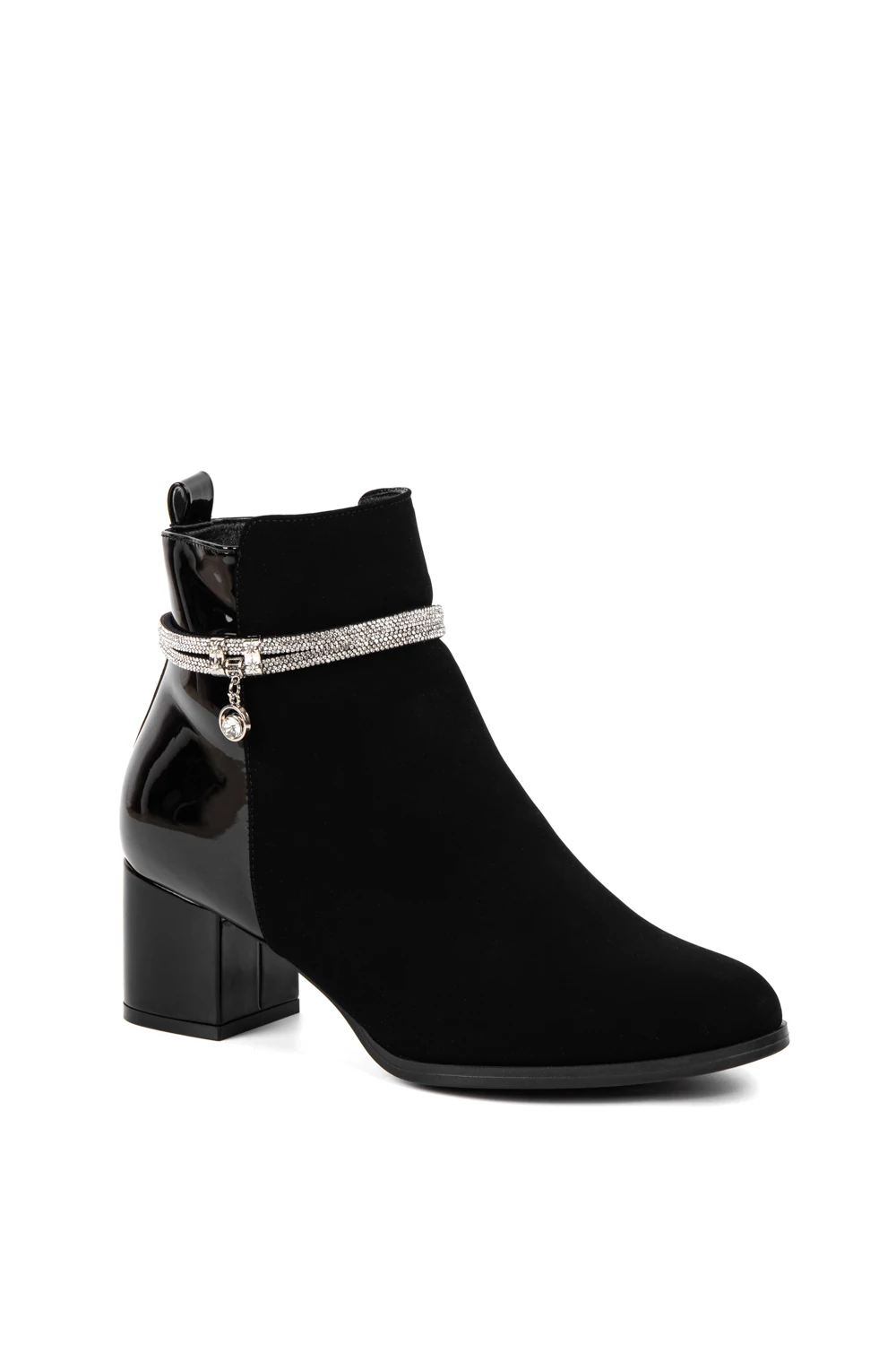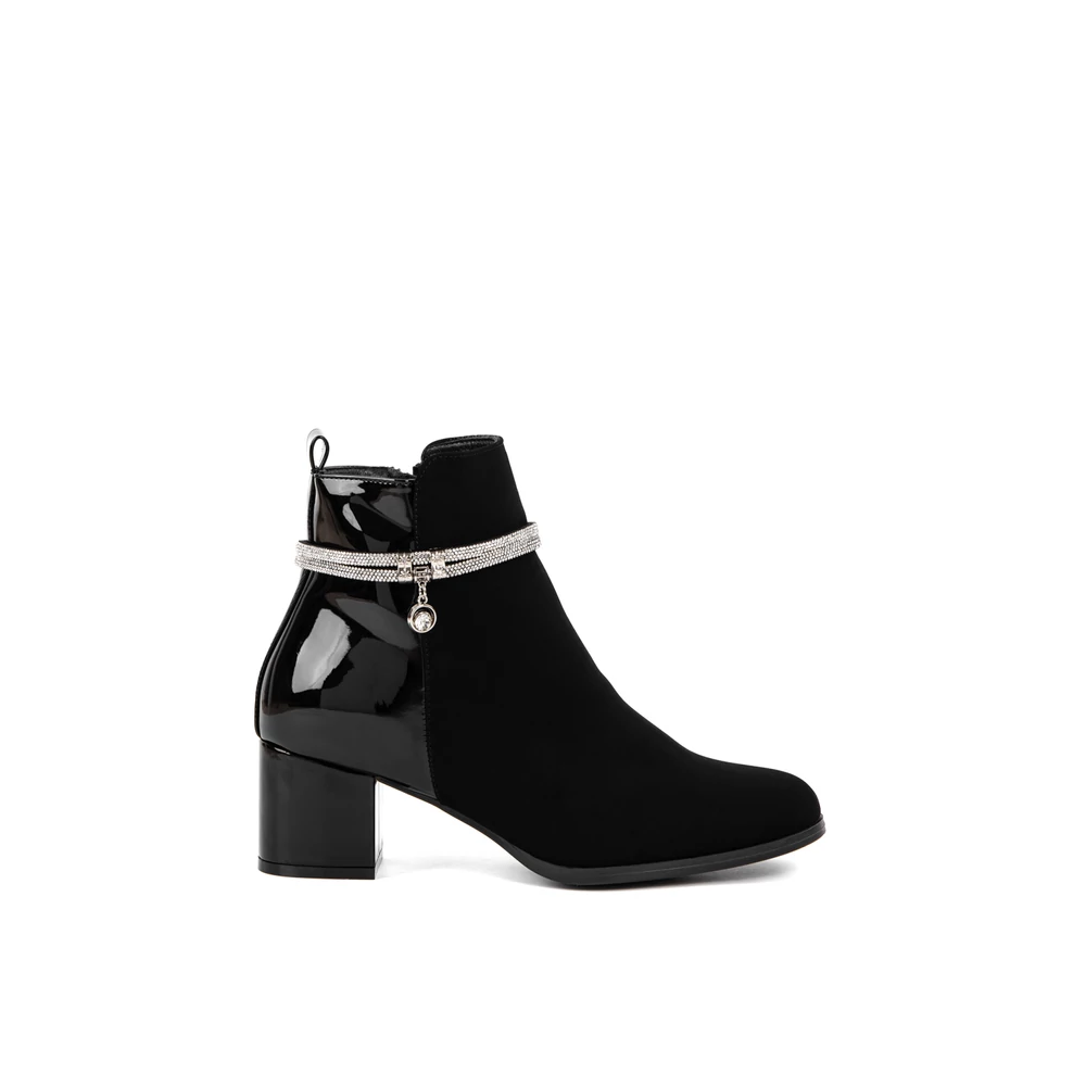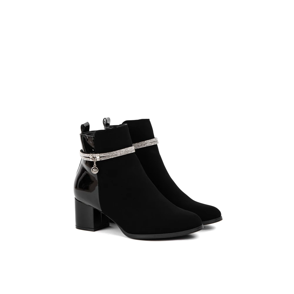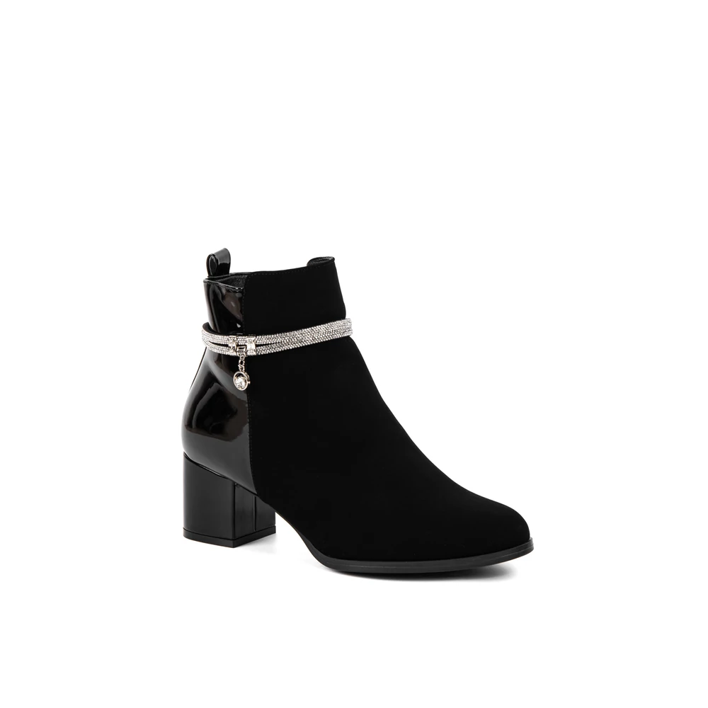 Kialakítása során nagy hangsúlyt kapott a változatosság, hiszen két különböző anyagból áll: művelúr és lakk betétek találhatók rajta. A boka részén körbe strasszköves díszítés teszi igazán elegánssá, így alkalomra is megfelelő választás.