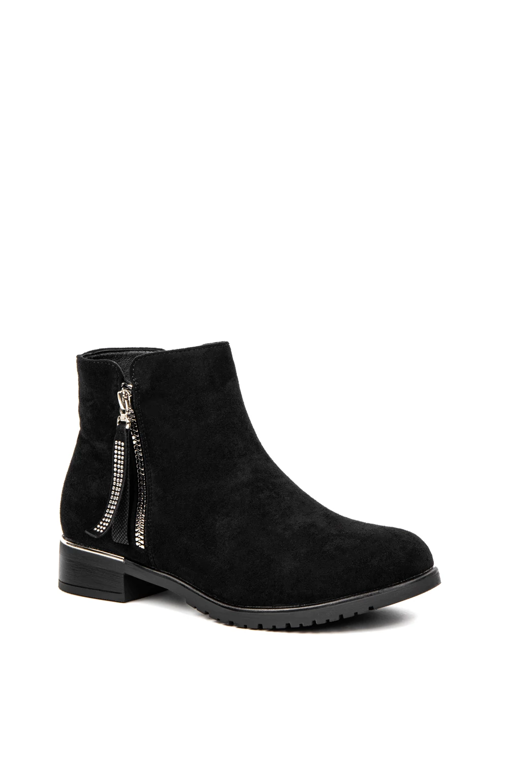 A strasszköves díszítésű cipzár diszkrét ragyogást kölcsönöz a cipőnek.