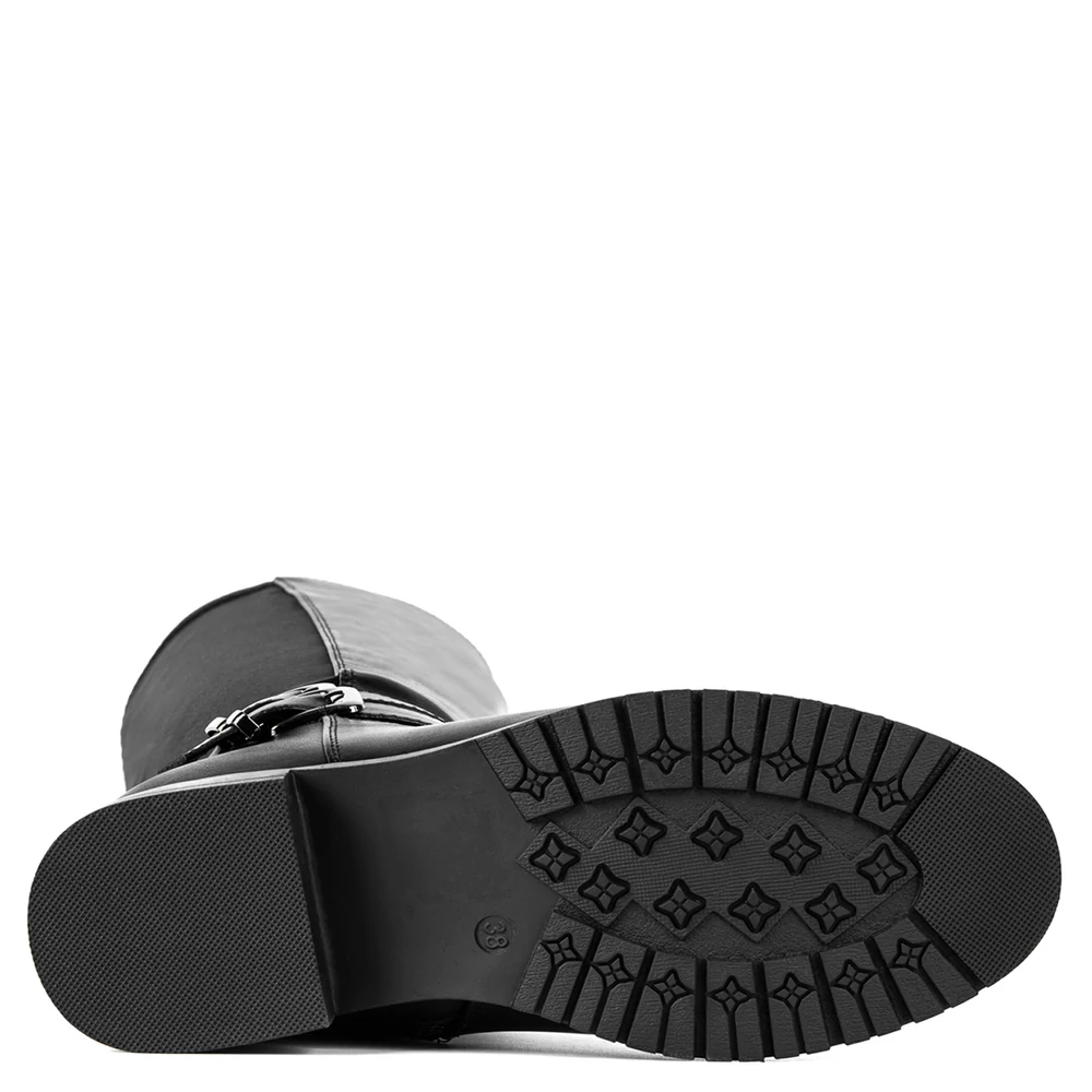 A letisztult, nőies vonalvezetésű, térdig érő csizma klasszikus darabja a hidegebb hónapok gardróbjának. Kialakítását a két dekoratív csat és a hátul elhelyezett rugalmas gumis anyag teszi különlegessé, amely kényelmes illeszkedést és könnyebb felvételt biztosít. Oldalsó cipzárral záródik, talpa bordázott a stabil járás érdekében. Alacsony sarka mindennapi viseléshez is ideális választássá teszi.