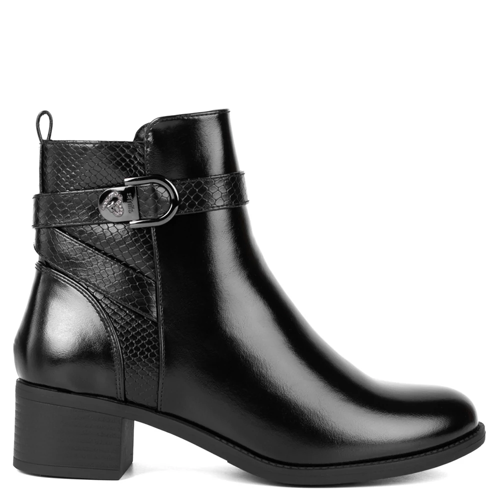 Ez a bokacsizma elegáns vonalvezetésével és finoman fénylő felületével modern és nőies megjelenést biztosít. A letisztult formát a pántos részlet teszi különlegessé, amely kígyóbőr hatású mintázattal és fémcsattal díszített. Kényelmes, stabil sarokmagasságának köszönhetően egész nap hordható, miközben megfelelő tartást nyújt. Oldalsó cipzárral könnyen fel- és levehető, a strapabíró talp pedig biztos járást ad. Ideális választás mindennapi viselethez és elegánsabb alkalmakra is.