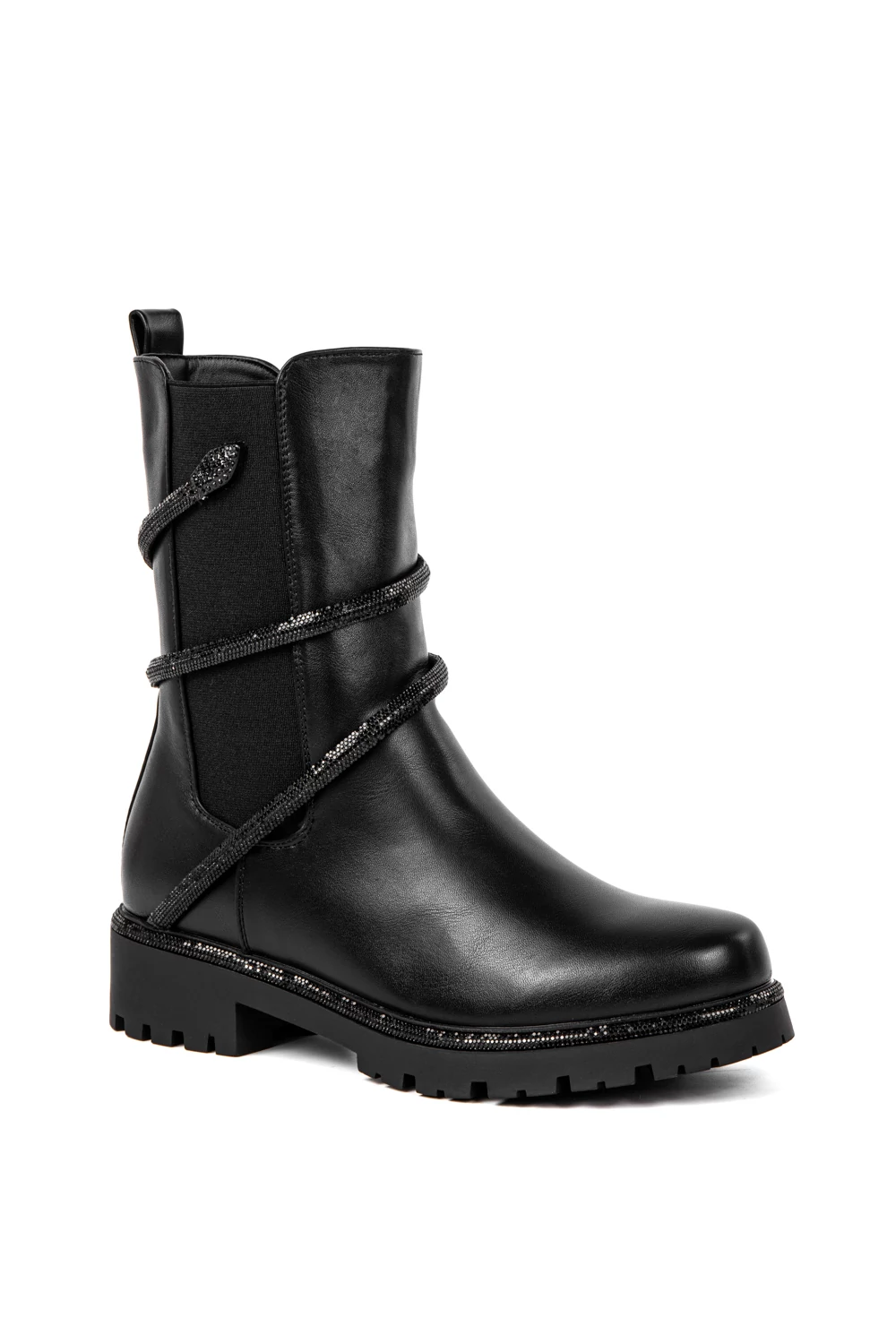 Műbőr alapú csizma, melyet kígyószerűen körbefutó strasszköves díszítés emel ki. A díszítés extravagáns és feltűnő, amely izgalmas kontrasztot teremt a csizma egyszerű vonalaival. Oldalán található cipzár pedig kényelmes és könnyű viseletet biztosít.