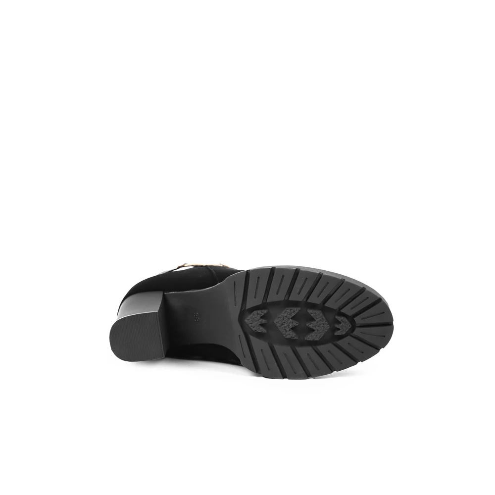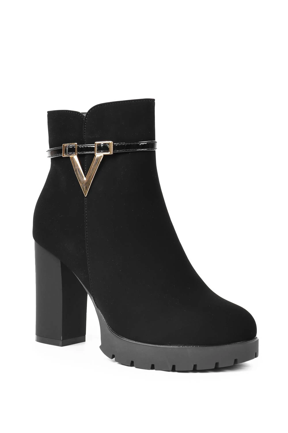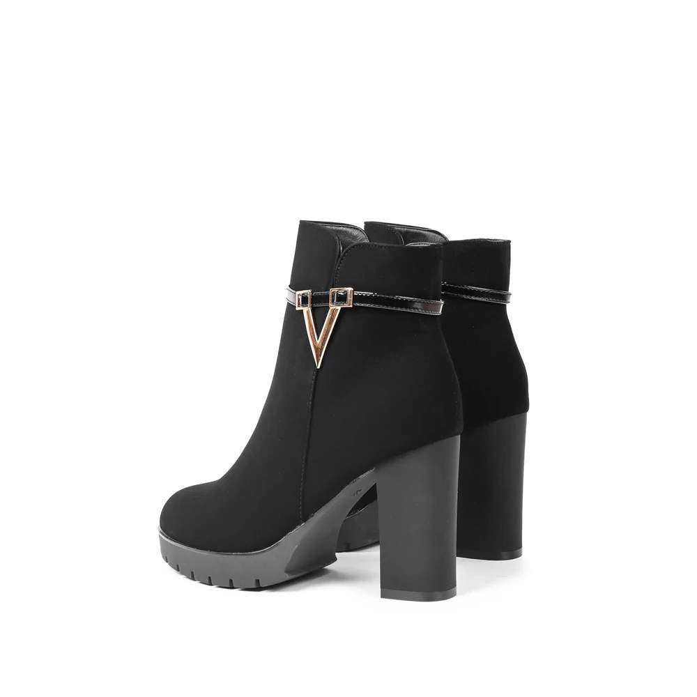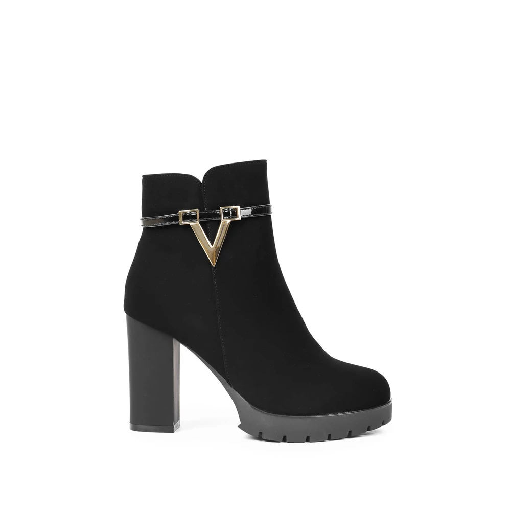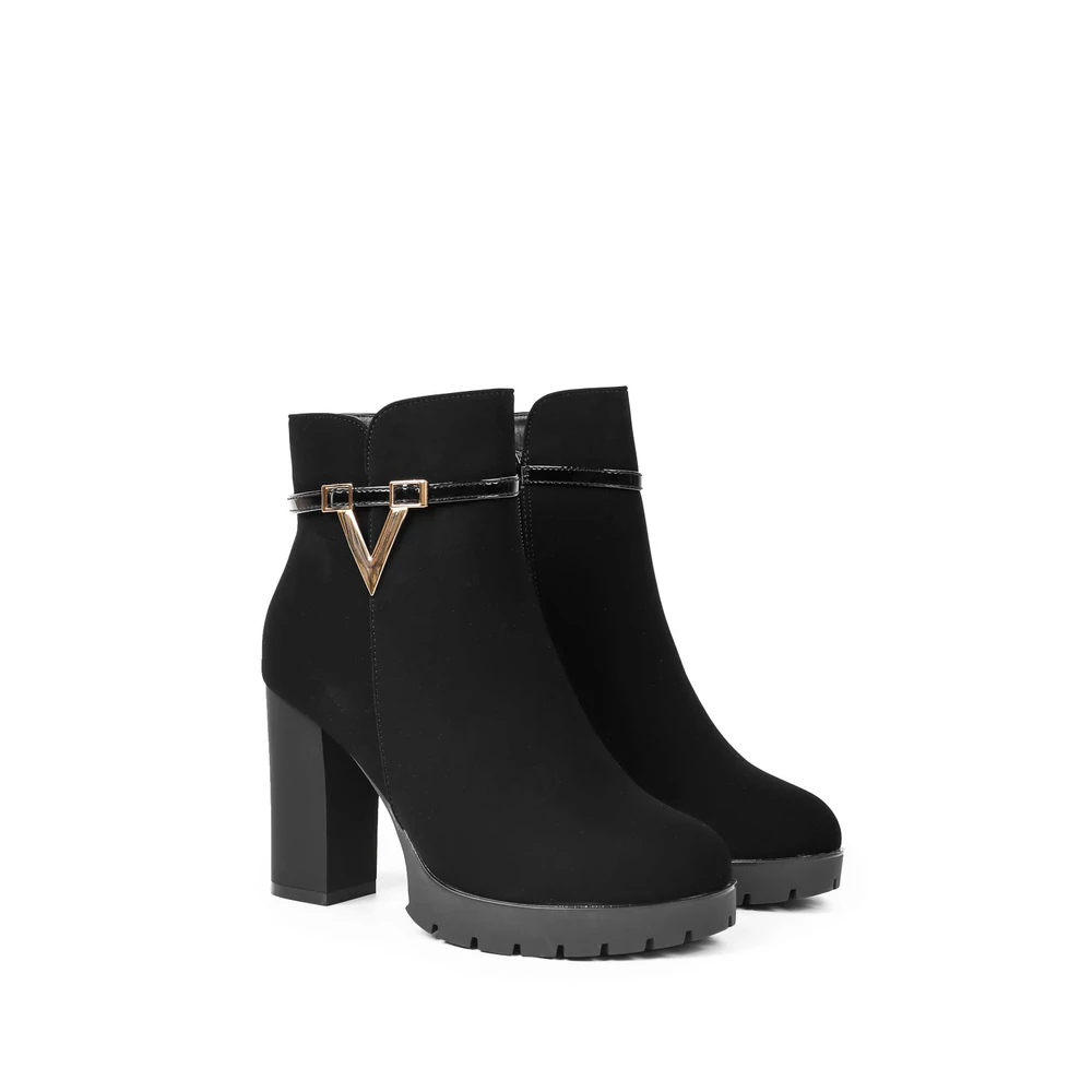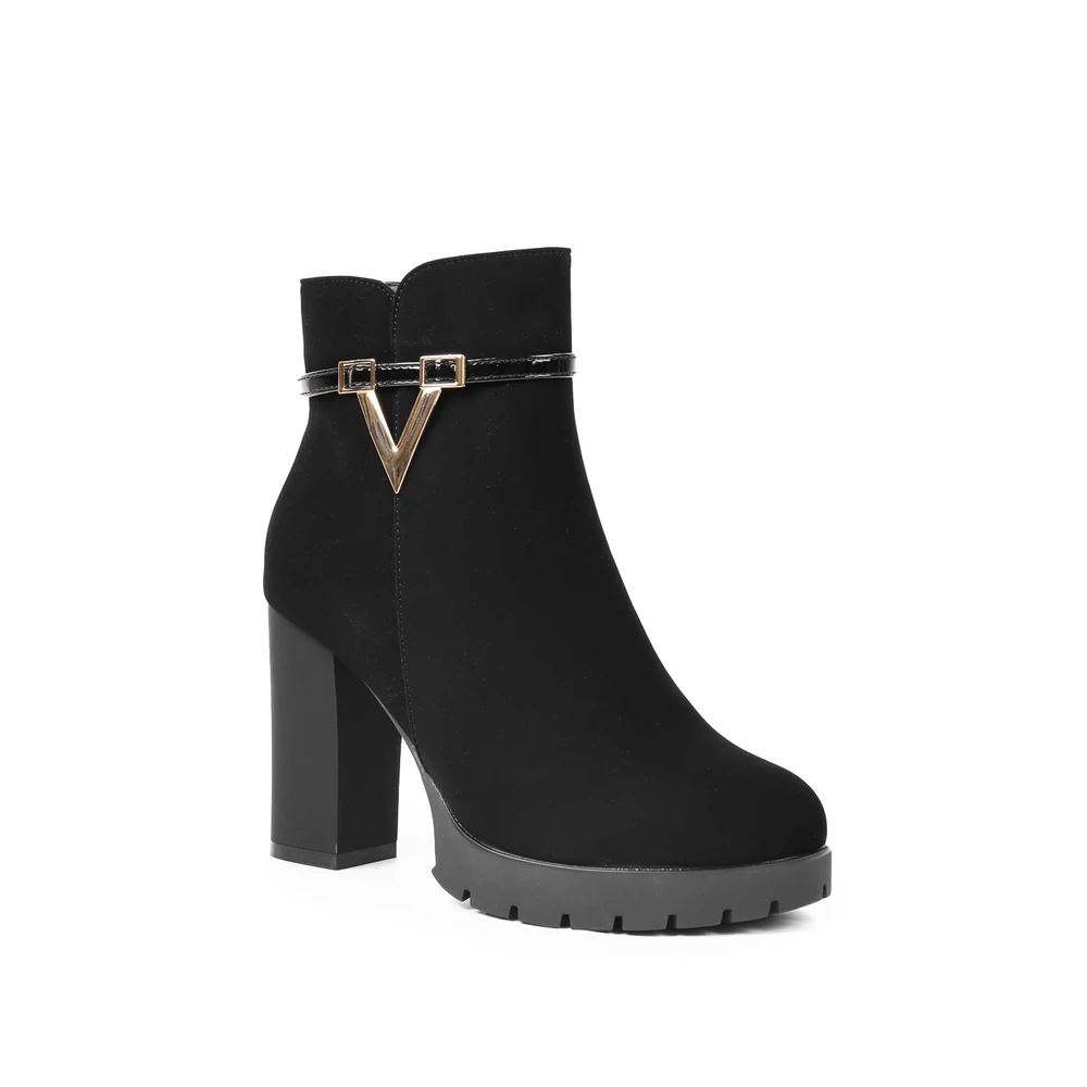 Ez a stílusos műnubuk bokacsizma gyönyörű arany színű lakk csattal és V alakú kivágással rendelkezik.
