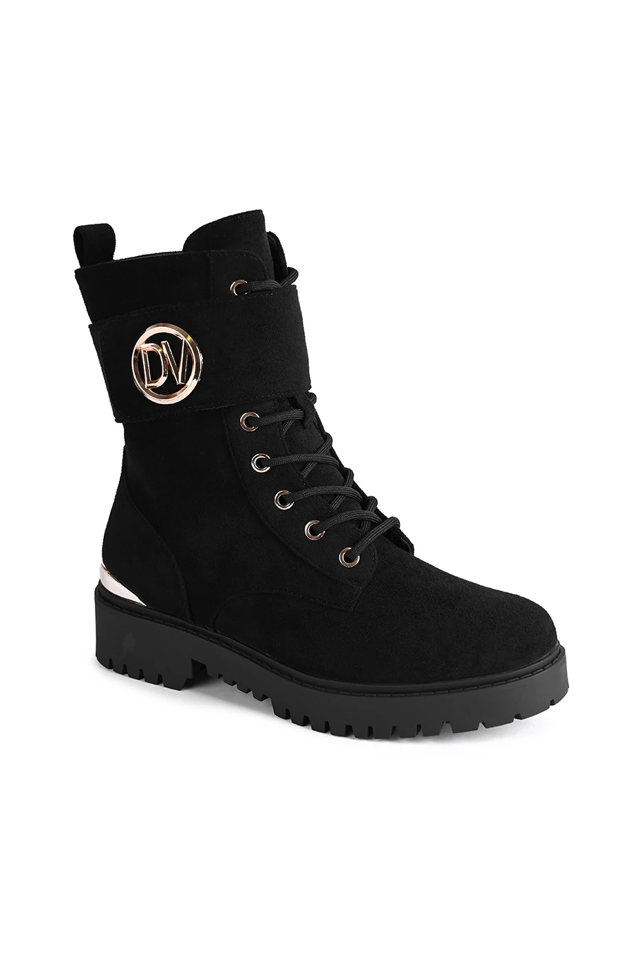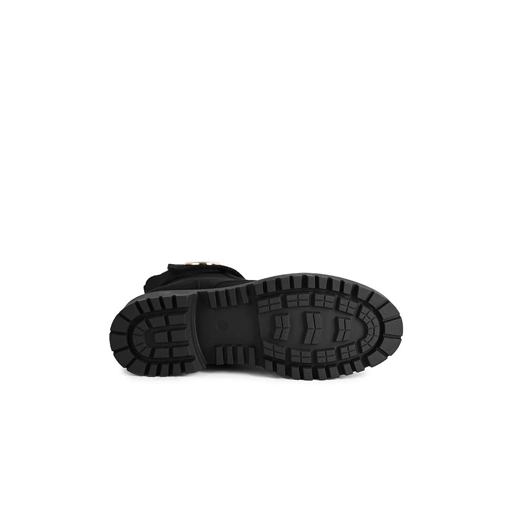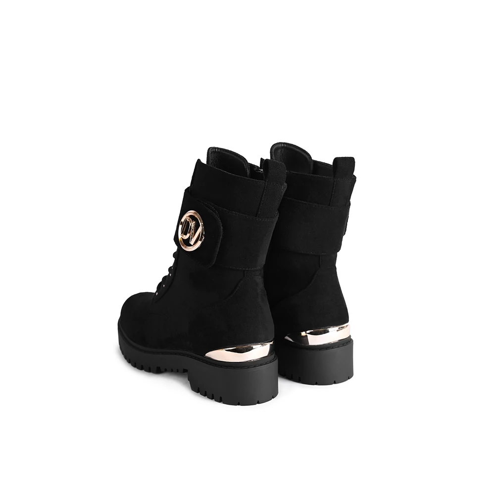 Trendi, fekete művelúr bakancs sarkán és tépőzáras csatján arany színű díszítéssel, mely stílust és strapabírást ötvöz, ideális választás mindennapi viseletre.