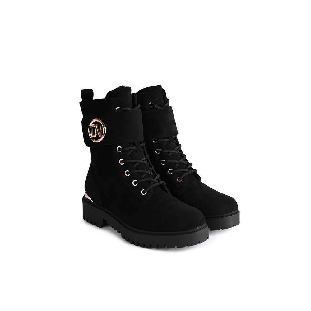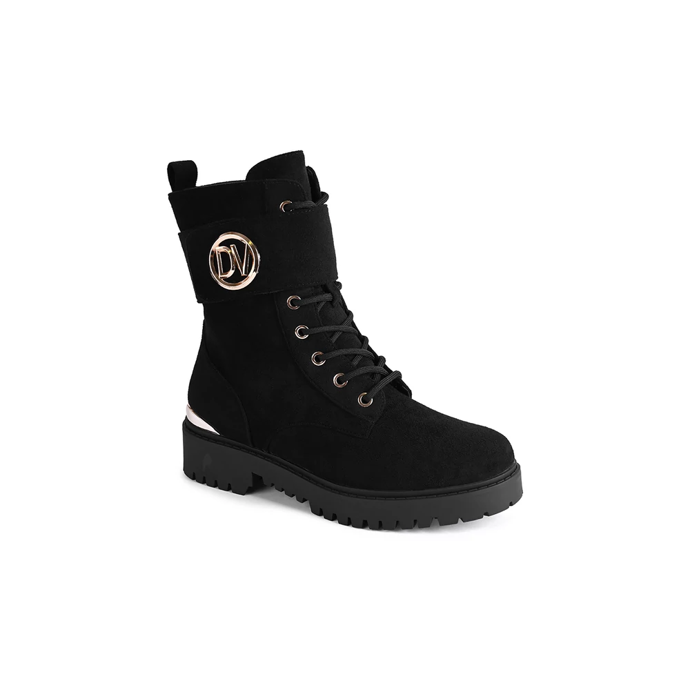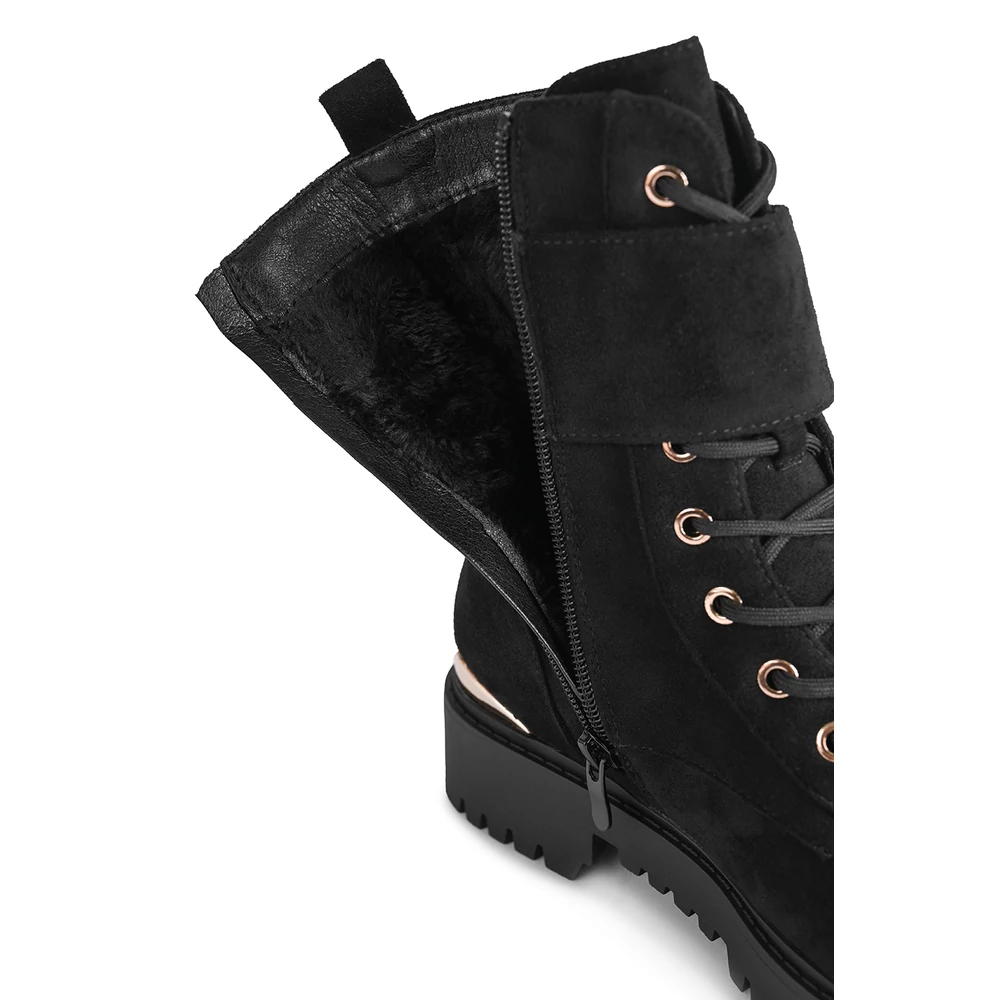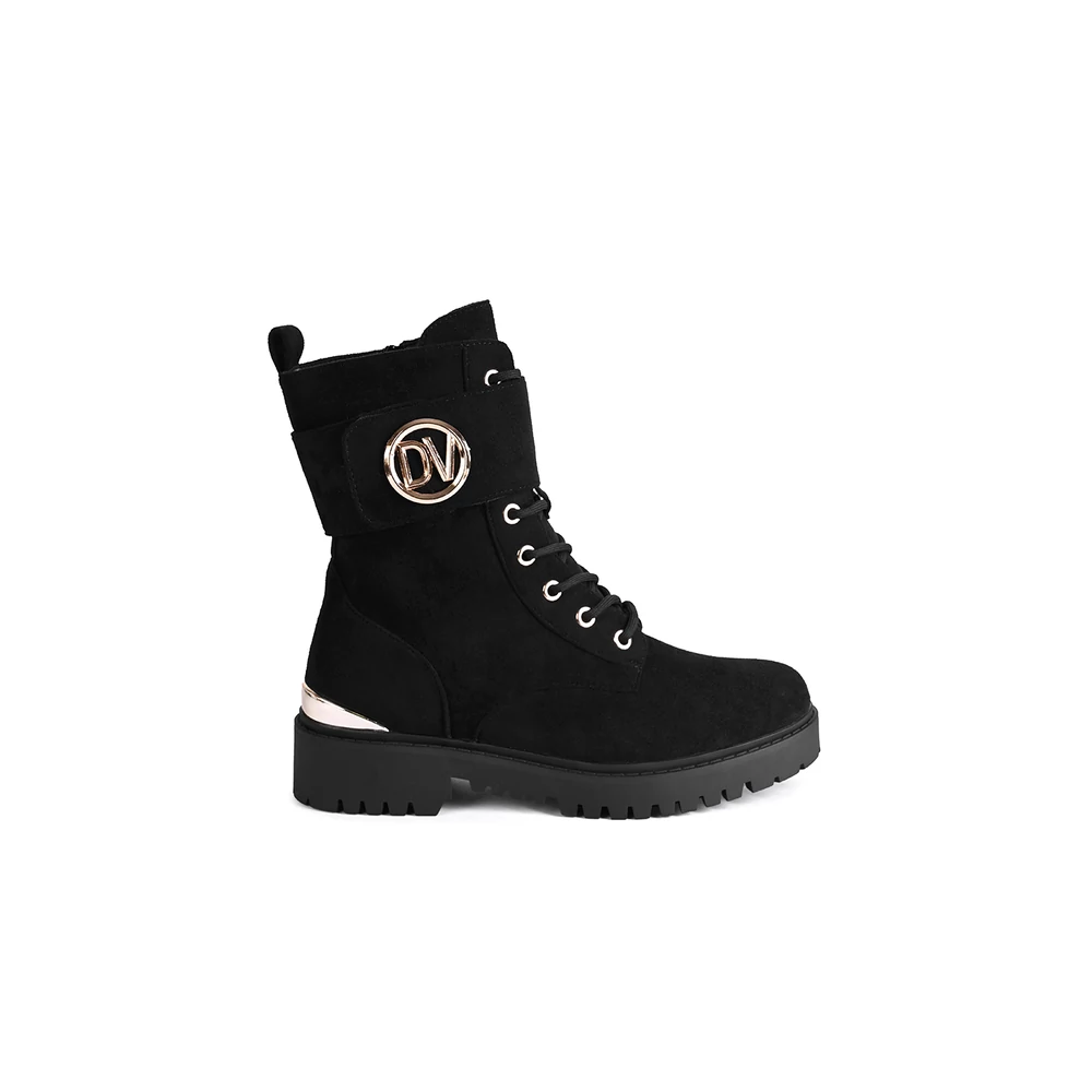 Trendi, fekete művelúr bakancs sarkán és tépőzáras csatján arany színű díszítéssel, mely stílust és strapabírást ötvöz, ideális választás mindennapi viseletre.