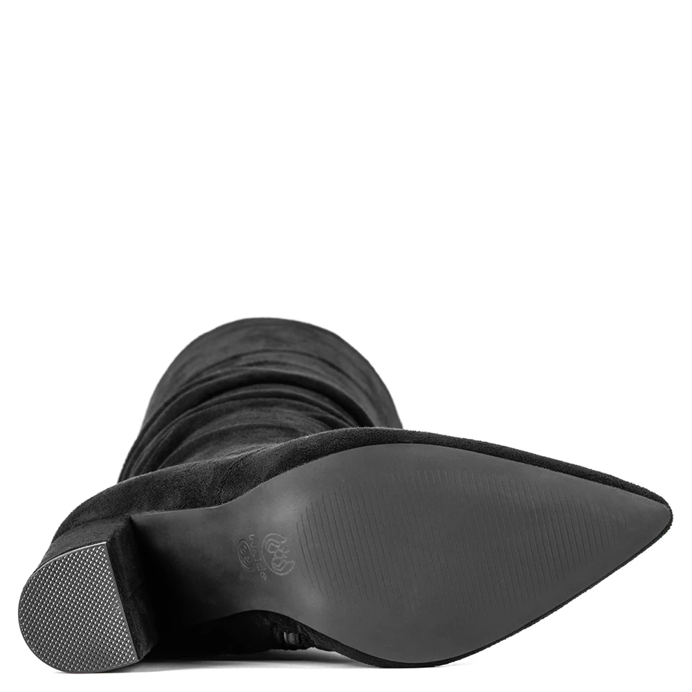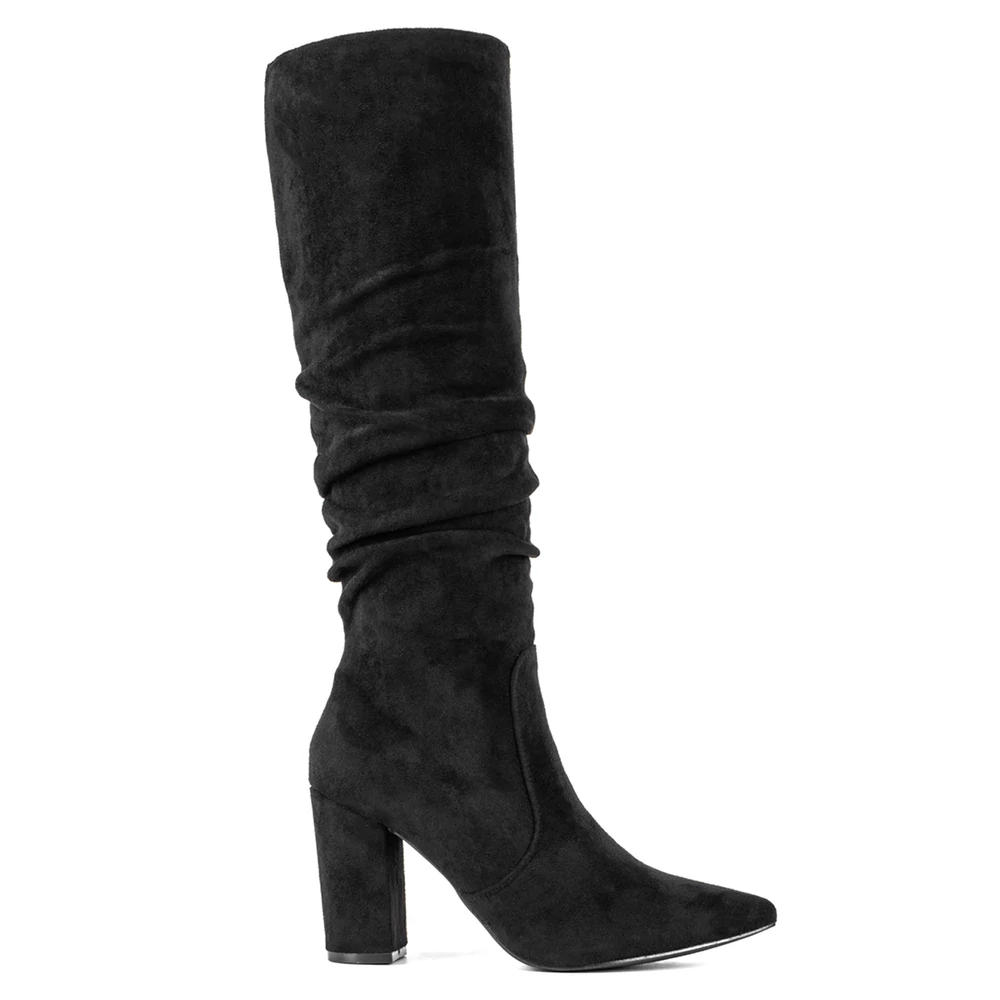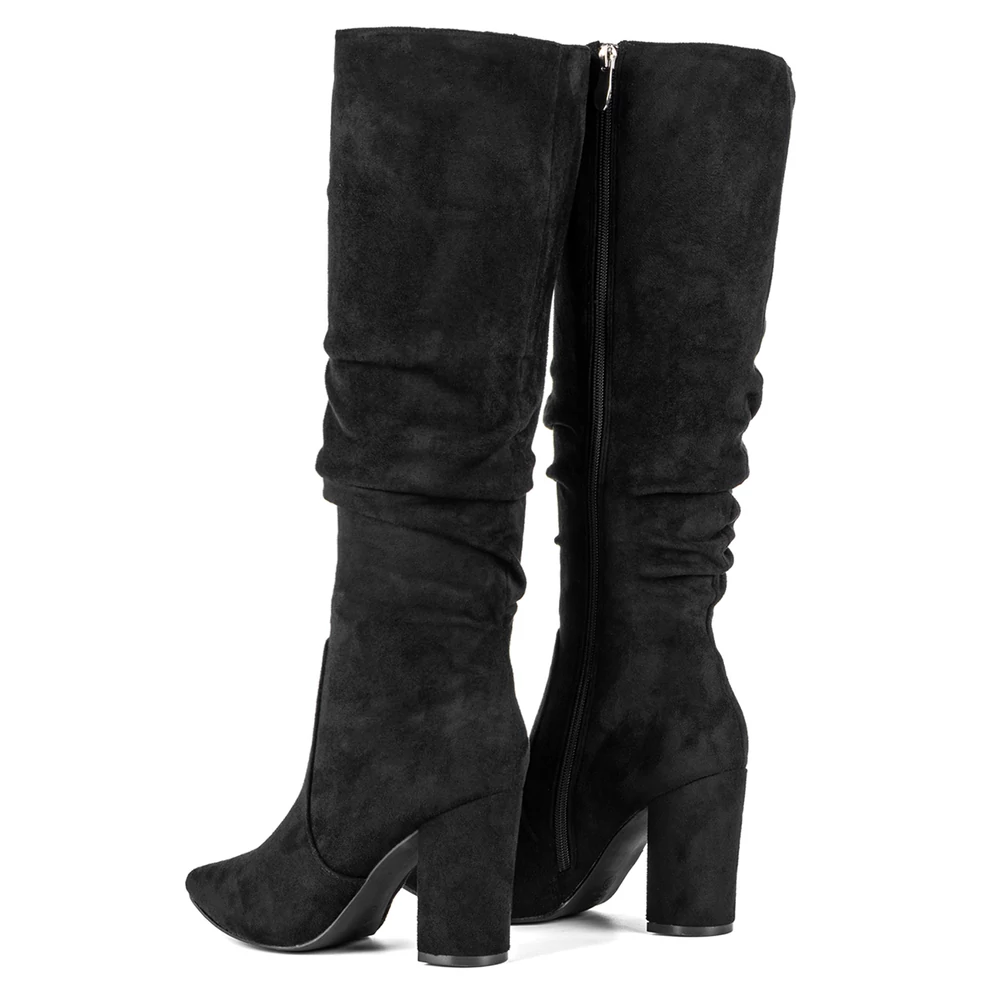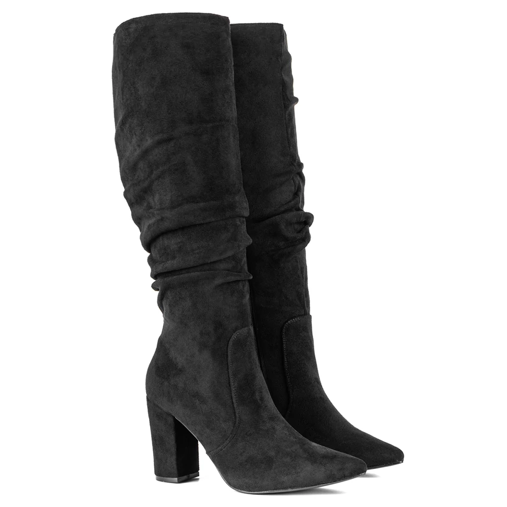 Ez a női hosszúszárú csizma elegáns választás a hidegebb napokra. Puha, művelúr anyaga modern megjelenést kölcsönöz, a ráncolt szár kialakítása pedig különleges stílust ad. A magas, stabil tömbsarok nőies megjelenést biztosít, miközben kényelmes viseletet nyújt a mindennapokban. Oldalsó cipzárral könnyen fel- és levehető, a belső rész enyhén bélelt, ami komfortos hordást tesz lehetővé. Letisztult vonalvezetésének köszönhetően remekül kombinálható szoknyával, ruhával vagy nadrággal is, így sokoldalú darabja lehet a gardróbnak.