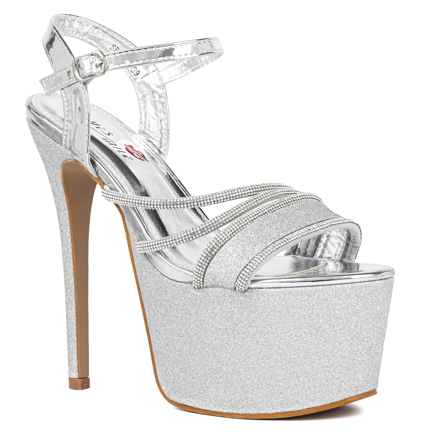 Magas sarkú platform szandál, amely stílusos megjelenést és magabiztos tartást kínál. A vastag talprész és a tűsarok kombinációja elegánsan nyújtja az alakot, miközben stabil alapot biztosít viselés közben. A felsőrészen elhelyezett fényes felületek és díszítőpántok látványos részleteket adnak a kialakításnak, ezáltal tökéletesen illeszkedik alkalmi összeállításokhoz.